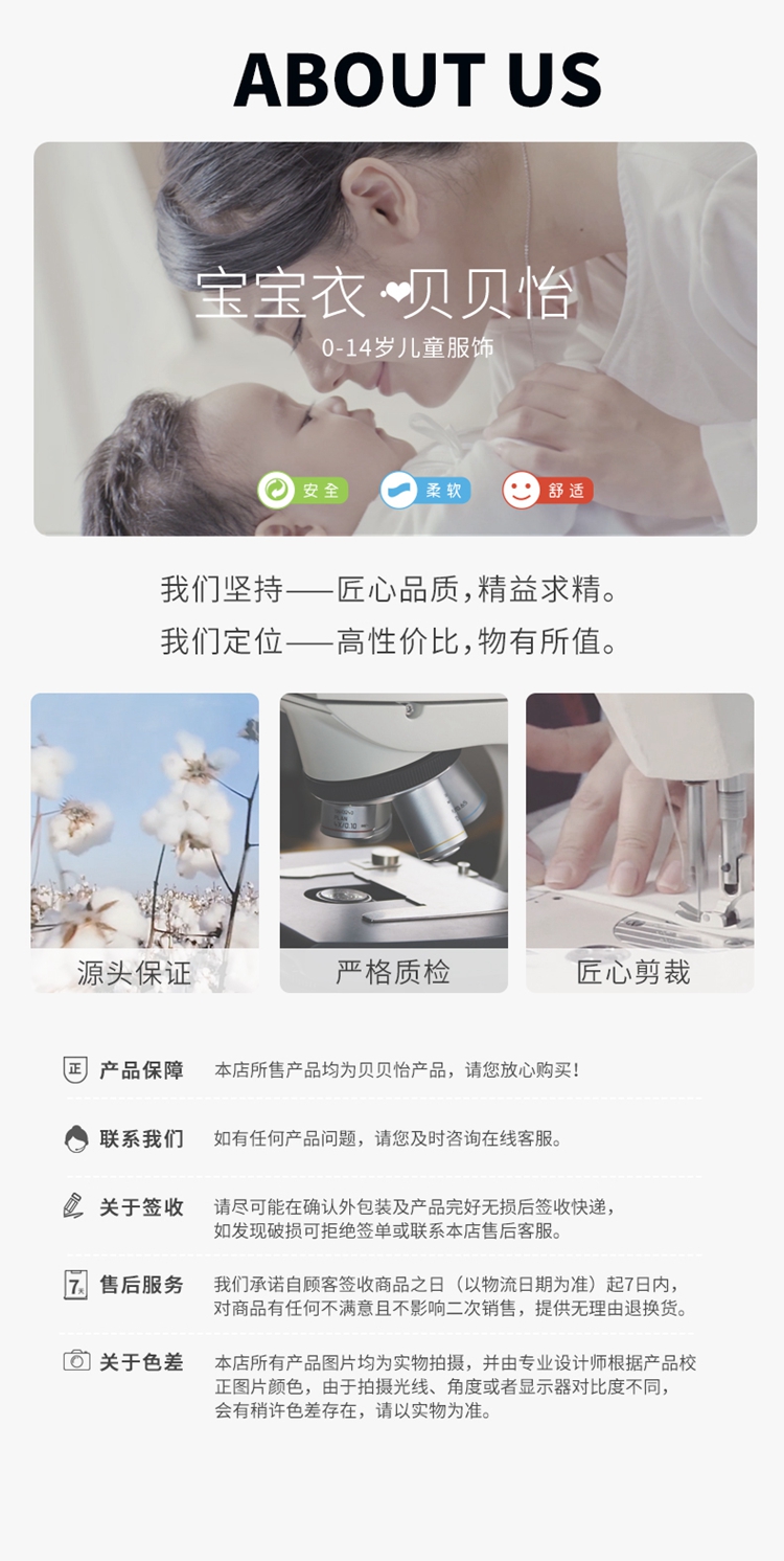 - 贝贝怡专注0-6岁婴幼儿服饰,坚持安全、柔软、舒适的产品理念,为千万中国家庭提供超高品质、安全可靠的婴幼儿服饰产品,妈妈放心,宝宝开心!
