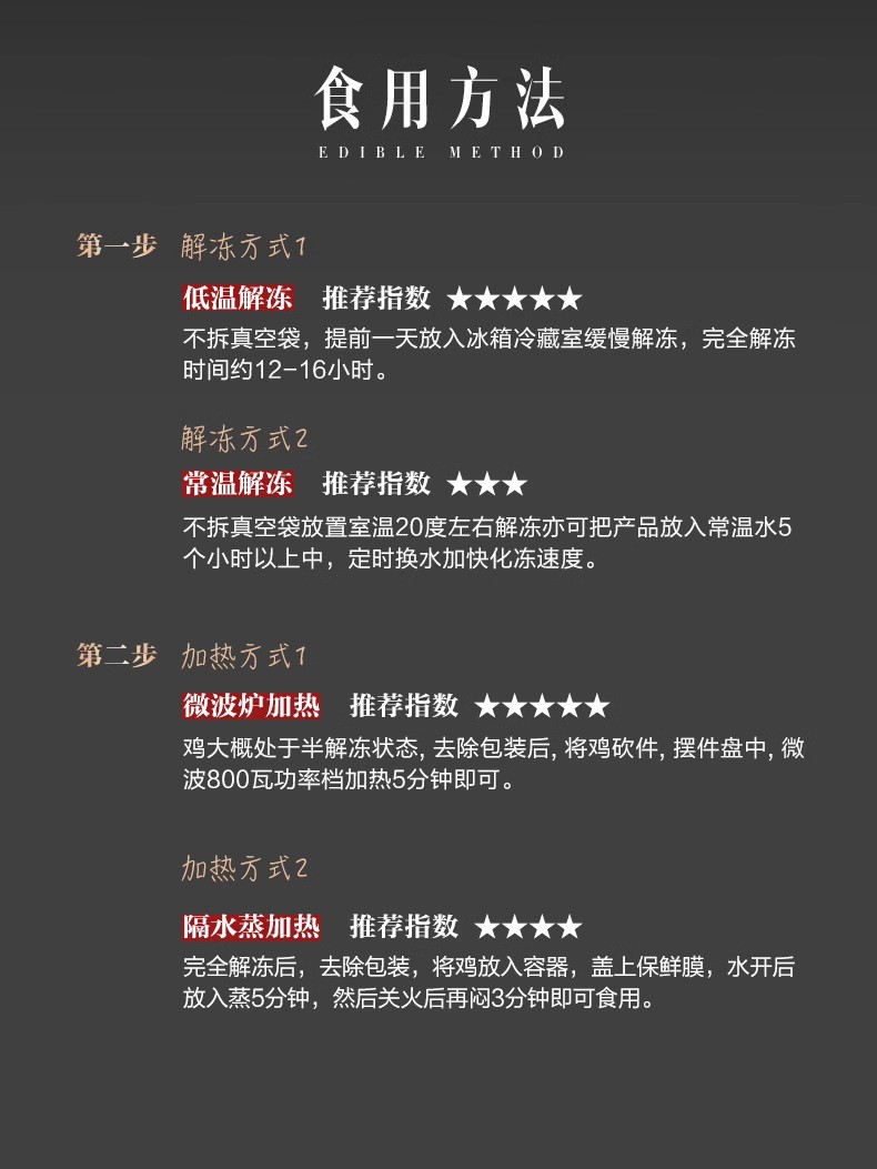 不使用防腐剂,不使用添加剂。食材新鲜宰杀,收到解冻即可蒸可微波,随便做即可复刻餐厅鲜美口感,也可有更多做法。
