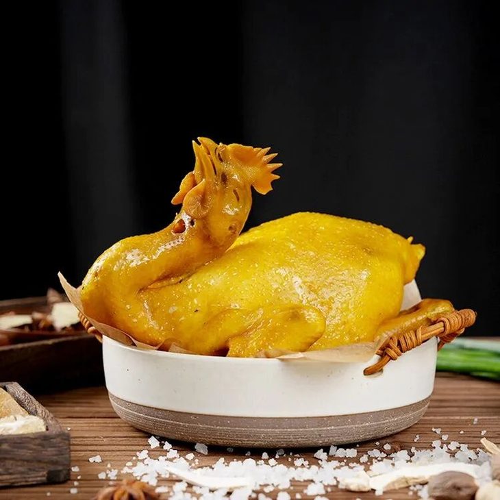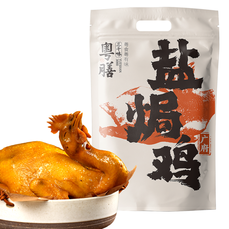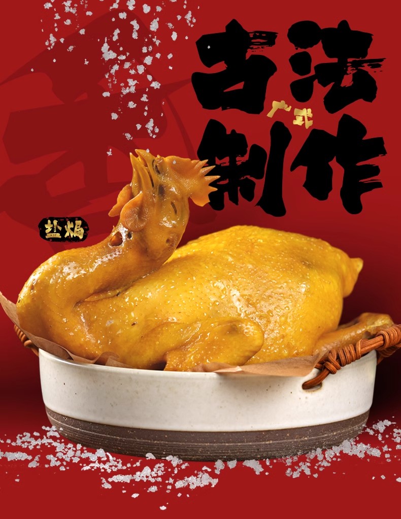 原材料是鸡、盐和盐焗粉等,味道咸香,色泽金黄,皮脆肉嫩,骨肉鲜香,风味诱人。