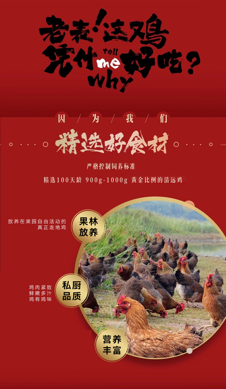 选用出生80-90日龄的清远鸡,净重800-1000g,黄金比例。林中放养,肉质饱满少腥膻,能尝到鲜美滋味。