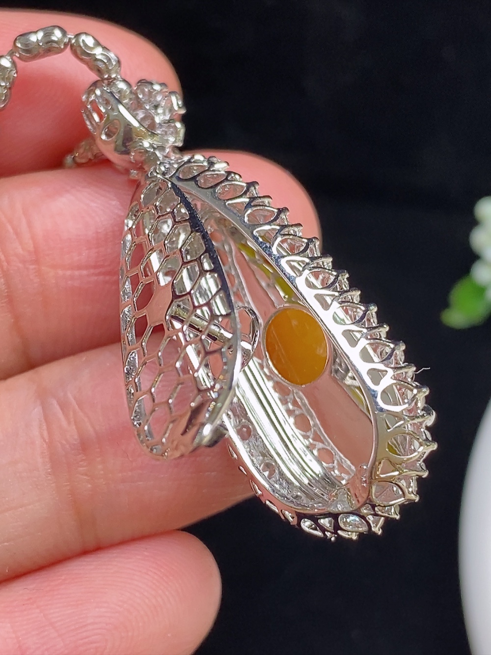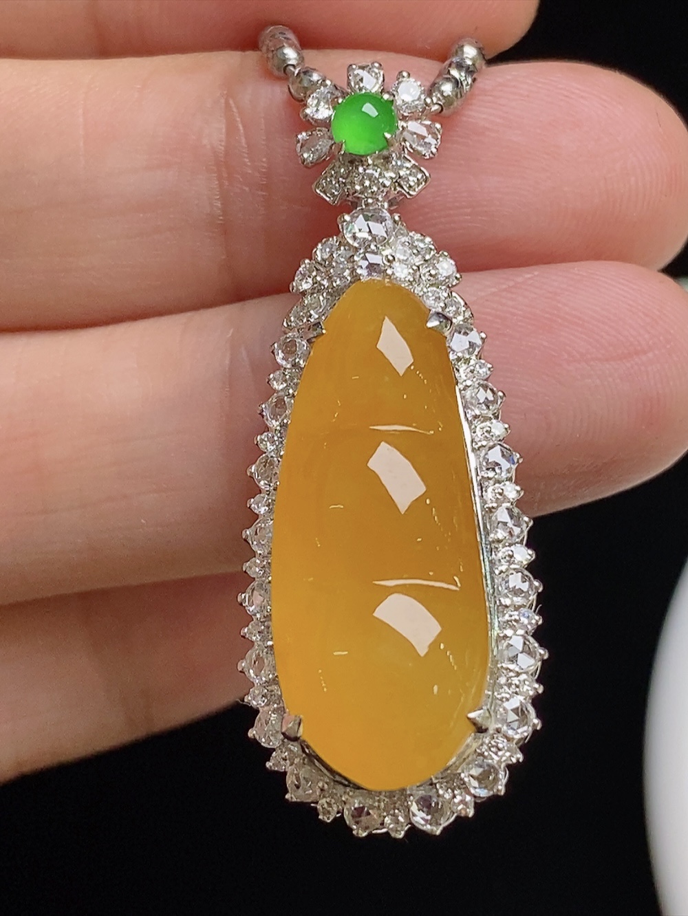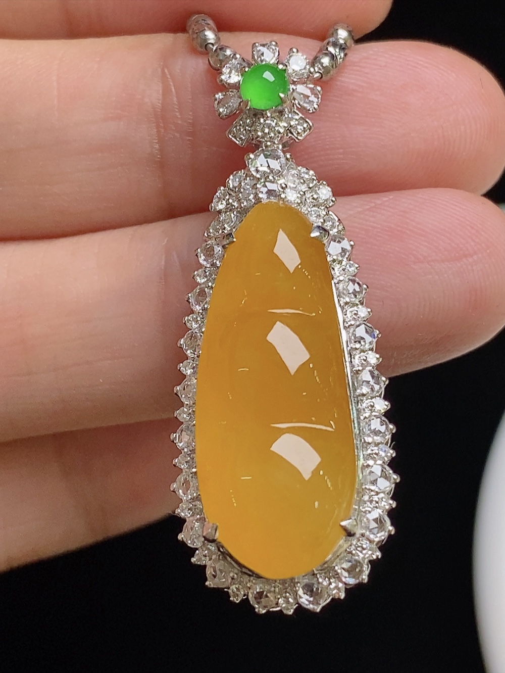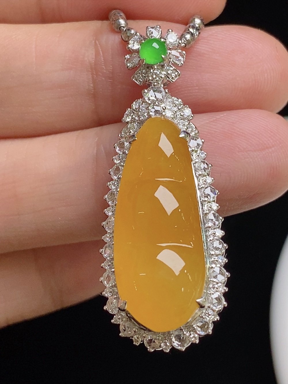 547223 翡翠高冰黄翡福豆 大件饱满,通透水润,玉质细腻,翠色鲜艳,18k金奢华钻石镶嵌 裸石尺寸:24.2-9.9-3.9mm约 超值价:21880