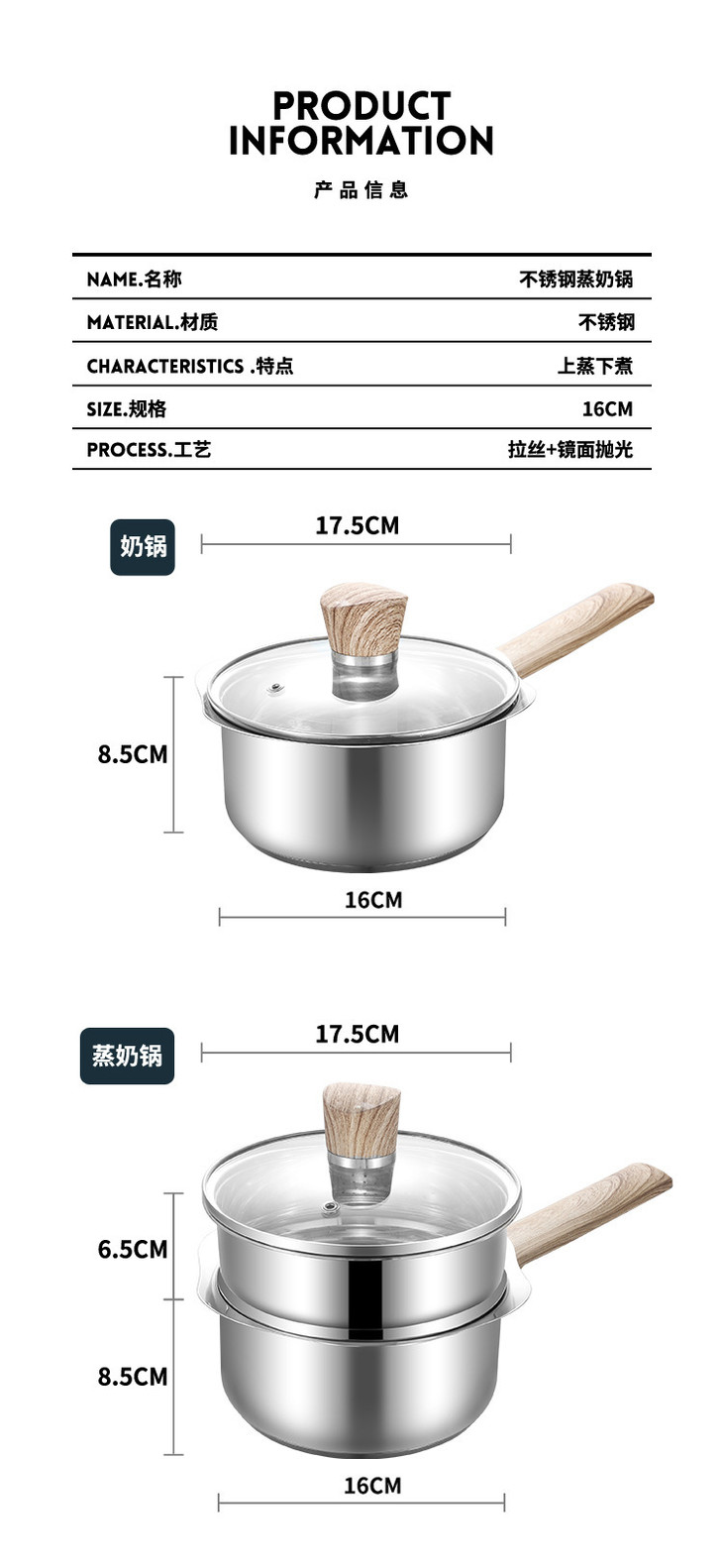 【奶锅】不锈钢304双层小奶锅 仿木柄雪平煮面锅复底多用蒸锅 宝宝辅食锅