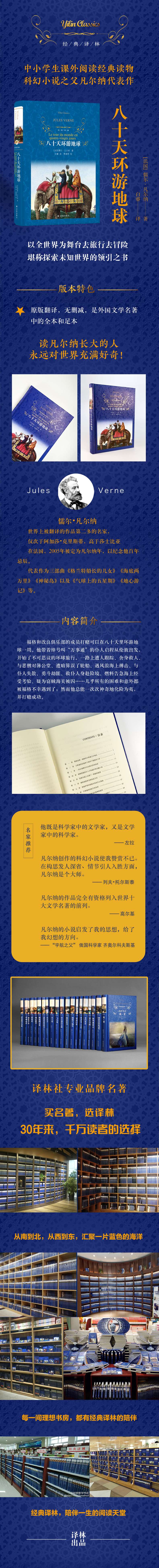 儒尔·凡尔纳*的《八十天环游地球(精)》叙述了英国人福克先生因和朋友打赌。在八十天克服重重困难完成环游地球一周的壮举。书中不仅详细描写了福克先生一行在途中的种种离奇经历和他们所遇到的千难万险,而且还在情节的展开中使人物的性格逐渐立体化。沉着、寡言、机智、勇敢、充满人道精神的福克,活泼、好动、易冲动的仆人等等都给人留下了深刻的印象。