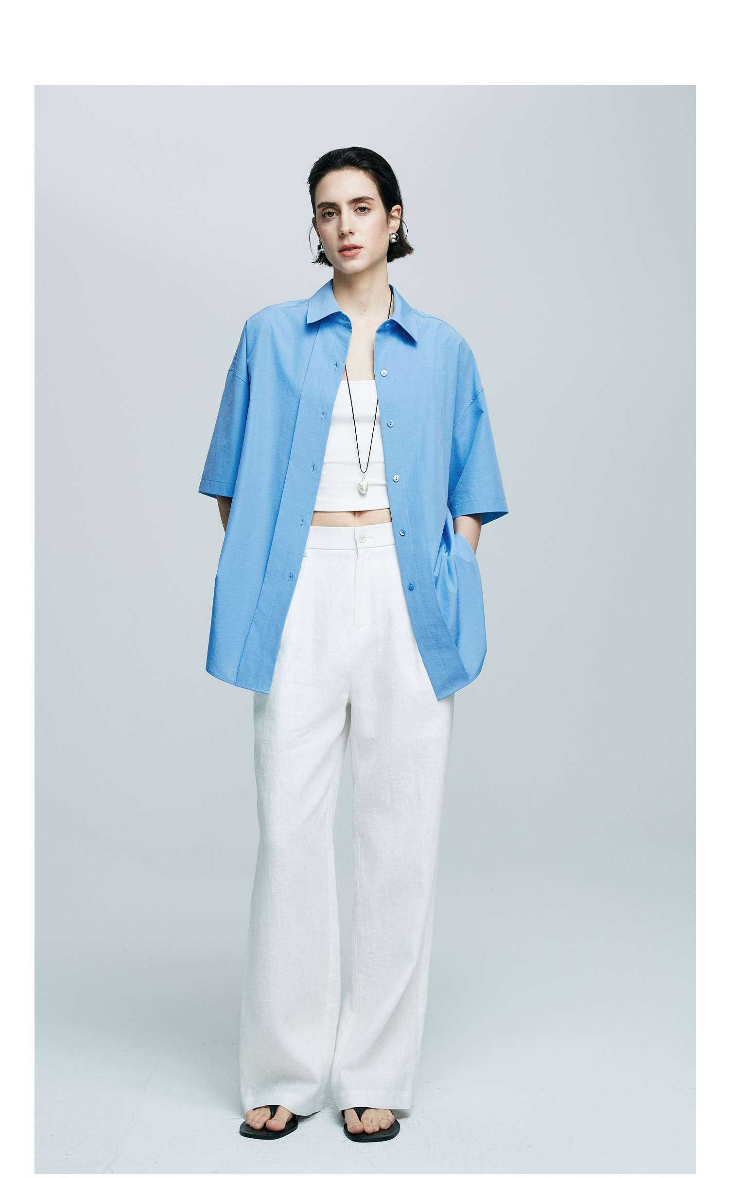 棉仓363604012-初棉无袖口袋小金扣宽松版亚麻衬衫