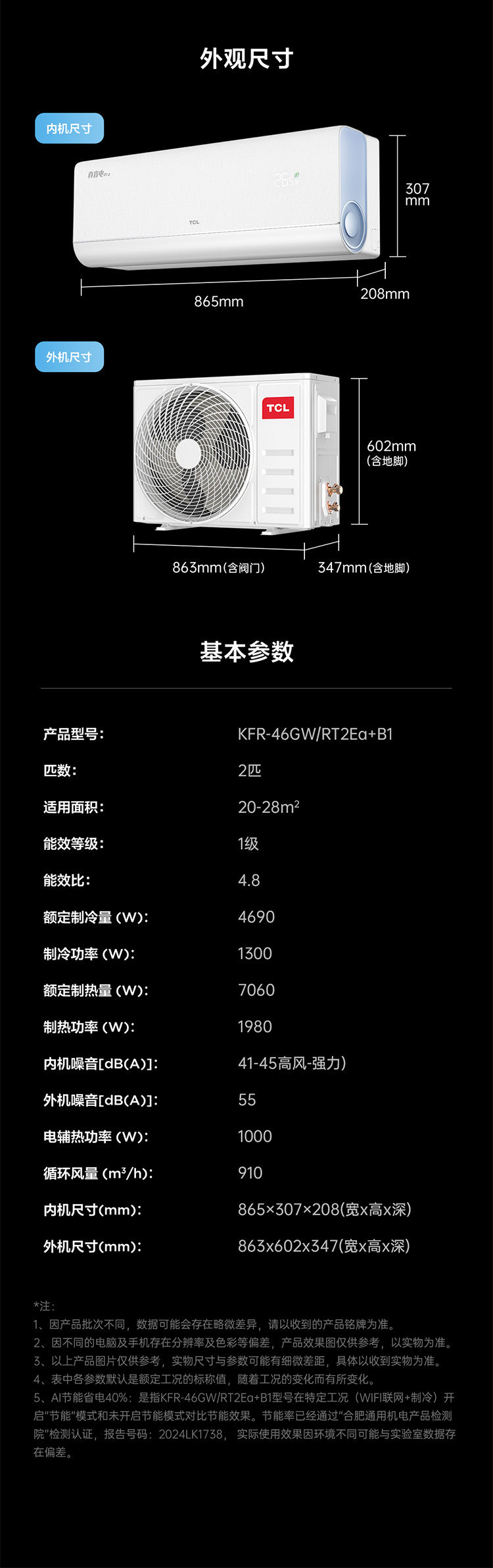 TCL 空调2匹小蓝翼真省电Pro 空调挂机 超一级能效 省电40% KFR-46GW/RT2Ea+B1