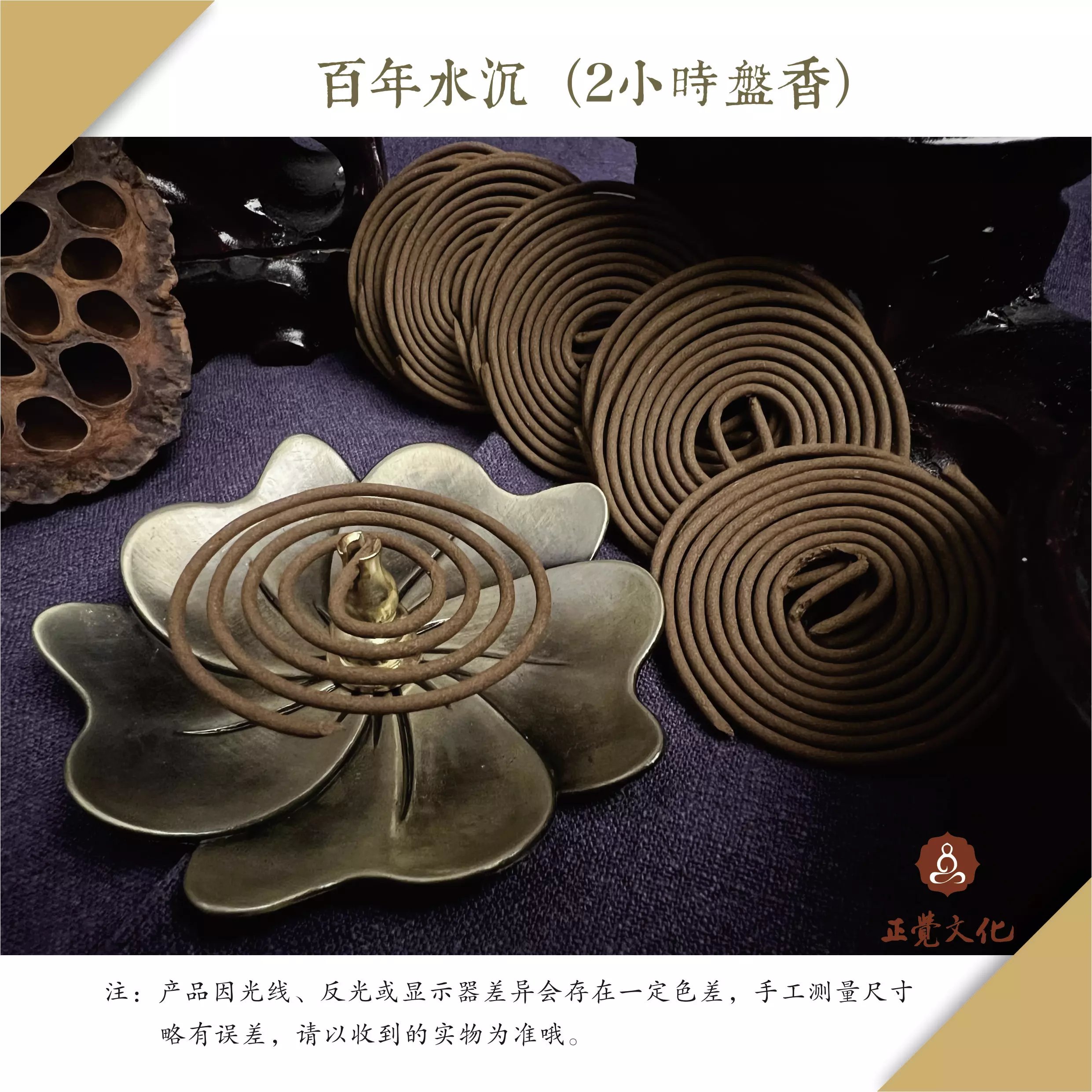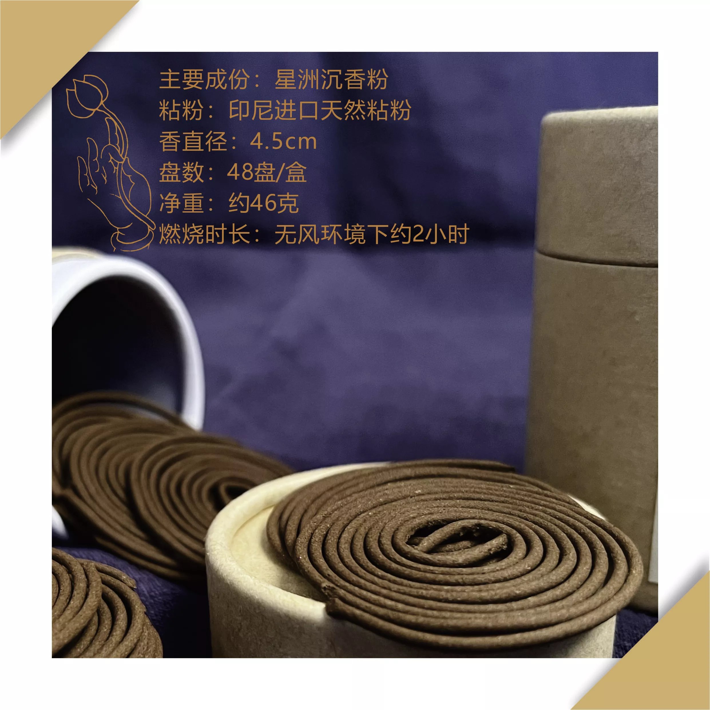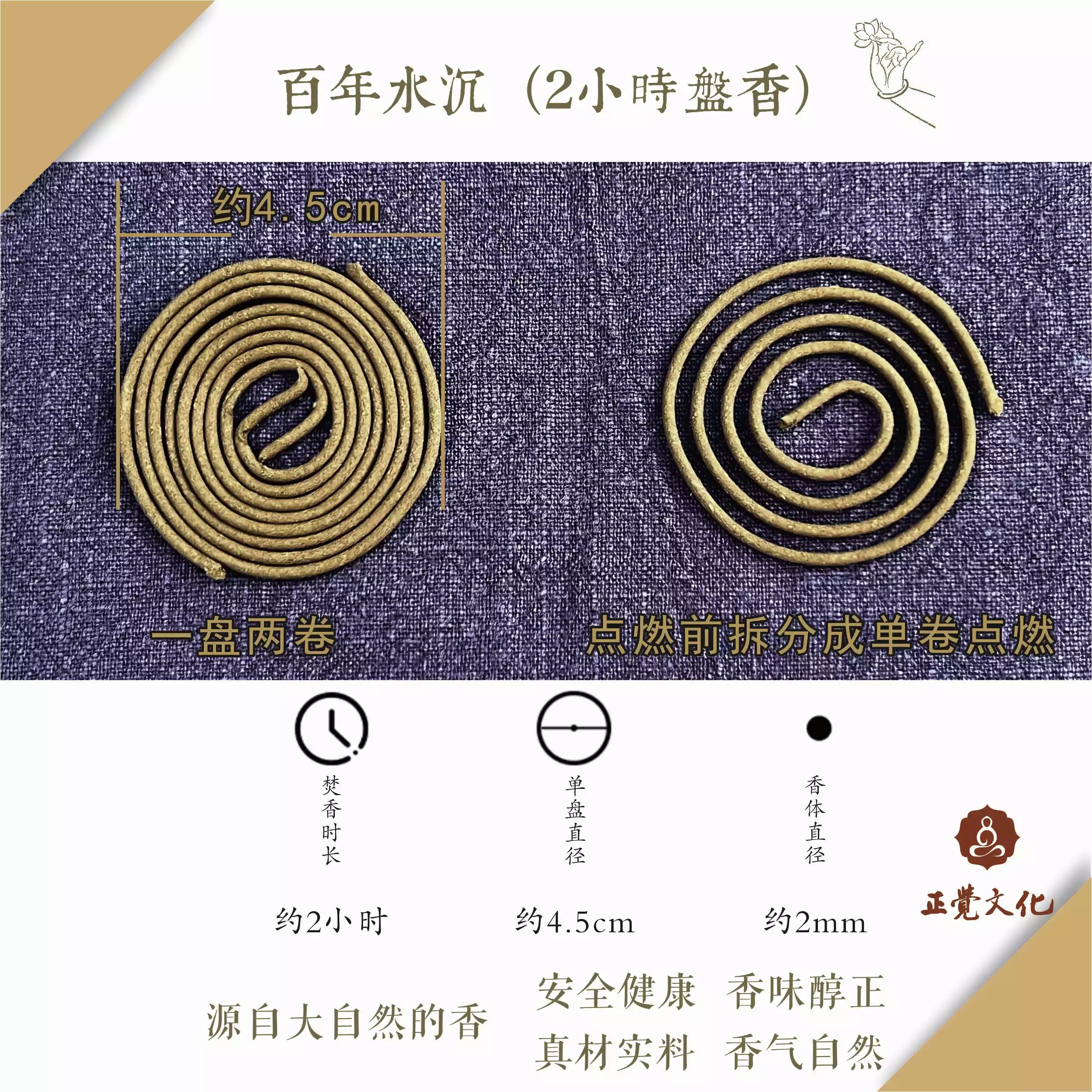 品名:百年水沉(2小时盘香)主要成份:星洲沉香粉粘粉:印尼进口天然粘粉香直径:4.5cm内口直径:约2mm盘数:48盘/盒净重:约46克燃烧时长:无风环境下约2小时
