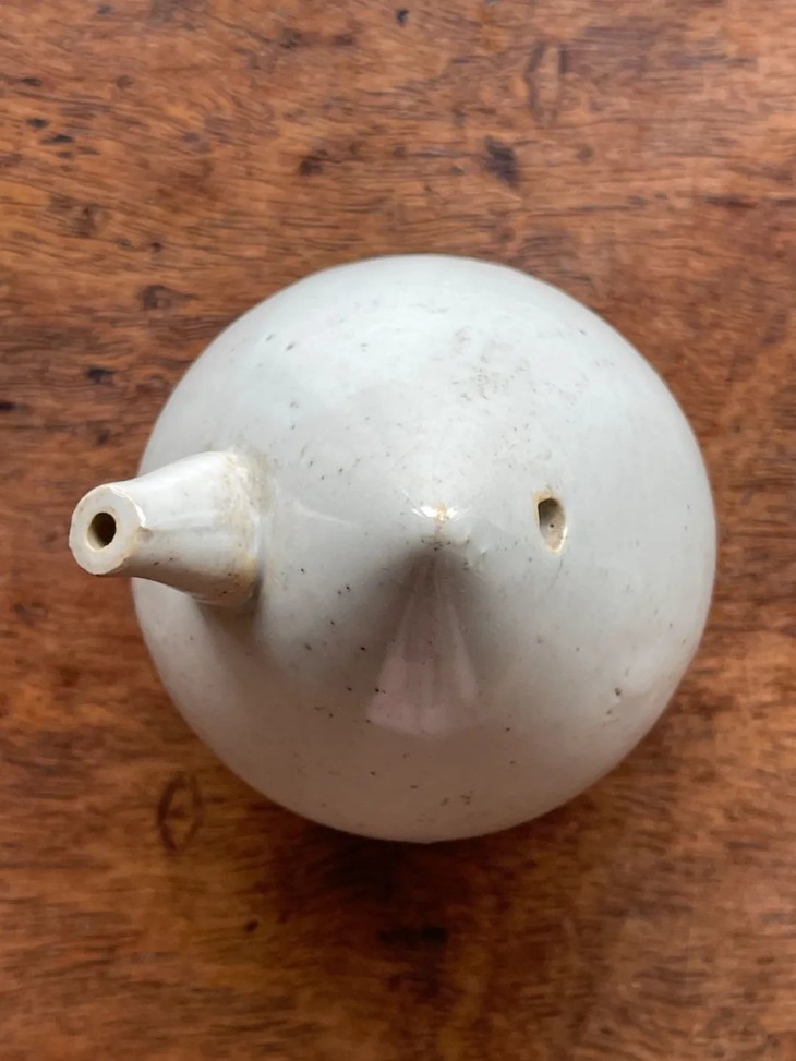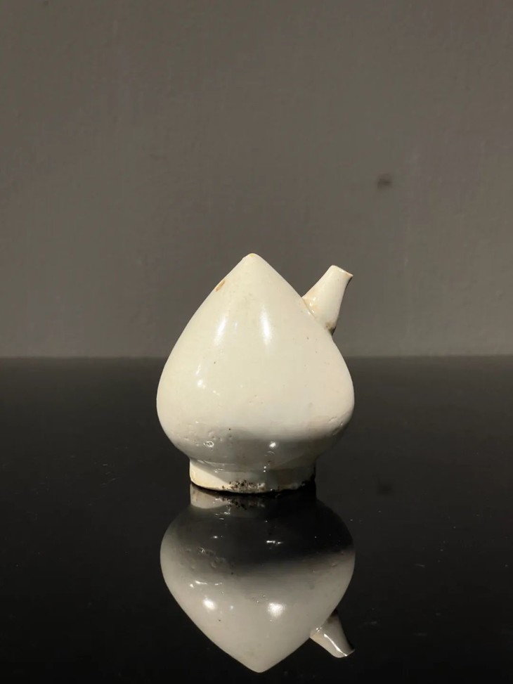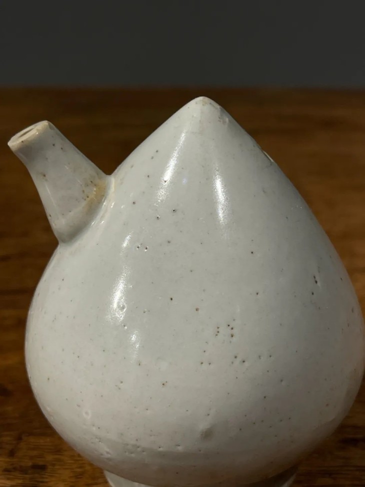 今天分享的是件来自朝鲜半岛文人书房的白瓷水滴,是用于磨墨是加水在硯台上的小水注,此小水滴尖顶广腹的火珠状,前方凸出管状流,后方一通氣孔眼,支撑于高圈足,全器施白釉,整体风格朴实简约,白釉局部泛青白与褐黄水渍,圈足底部具李朝瓷器特有的沾黏窑砂痕迹。釉表逾包浆皮壳渾厚温润,优雅大方,气质非凡,摆放于案头氣质高雅。