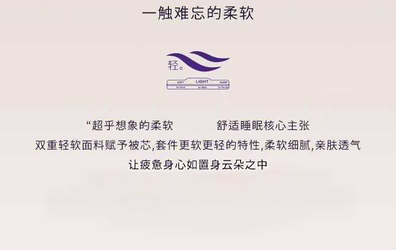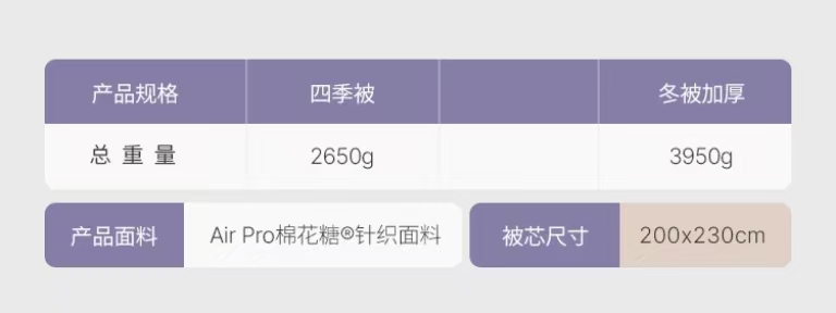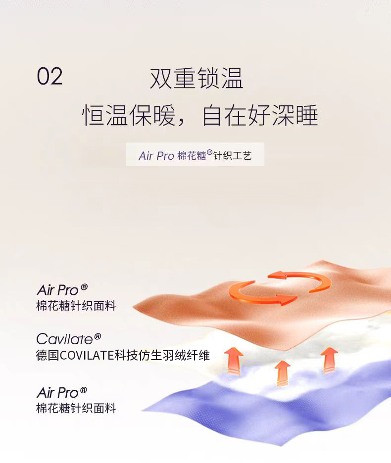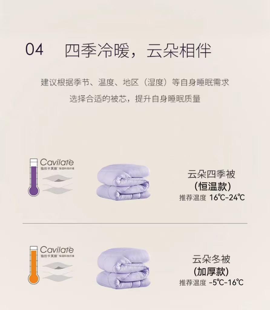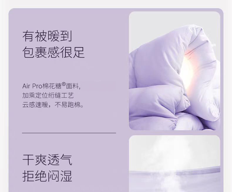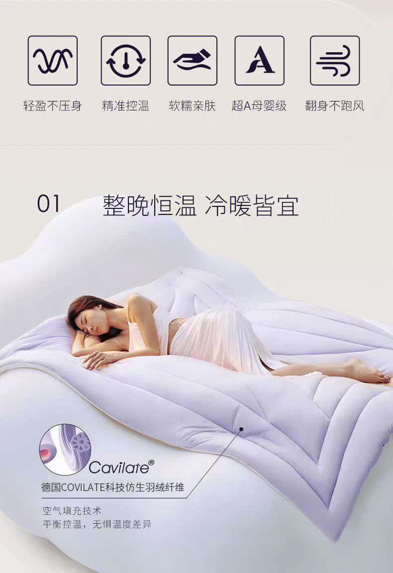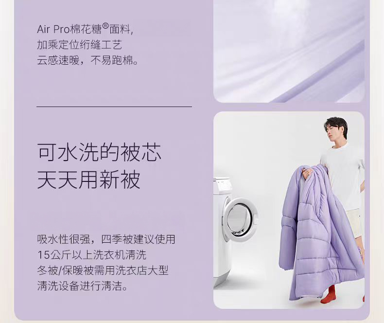【品名】恒源祥 新款云朵秋冬被 比鹅绒更柔软更温暖 绗缝花色(单被子) 【规格】 黄色、紫色:四季被(约6斤)、冬被加厚款(约8斤)/200*230cm 【产地】国内 【材质】 面料:云倍尔科技面料95% 氨纶5% 填充:德国Covilate科技仿生羽绒纤维 【发货包装】独立包装 【发货地】江苏 【发货快递】极兔、韵达随机发 【不发货区域】新疆、西藏、港澳台 【发货时效】48-72小时,周末节假日顺延 【售后标准】 收到货7天无理由退换货。有质量问题可以包运费。 若水洗后,无论任何问题不退换货,支持补偿。 |