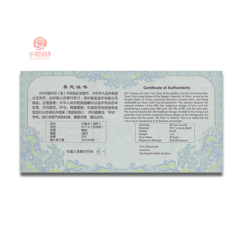 2011年发行,央行发行辛卯兔年生肖金银纪念币一套,此链接上架的为1盎司彩银兔,发行量22万。
