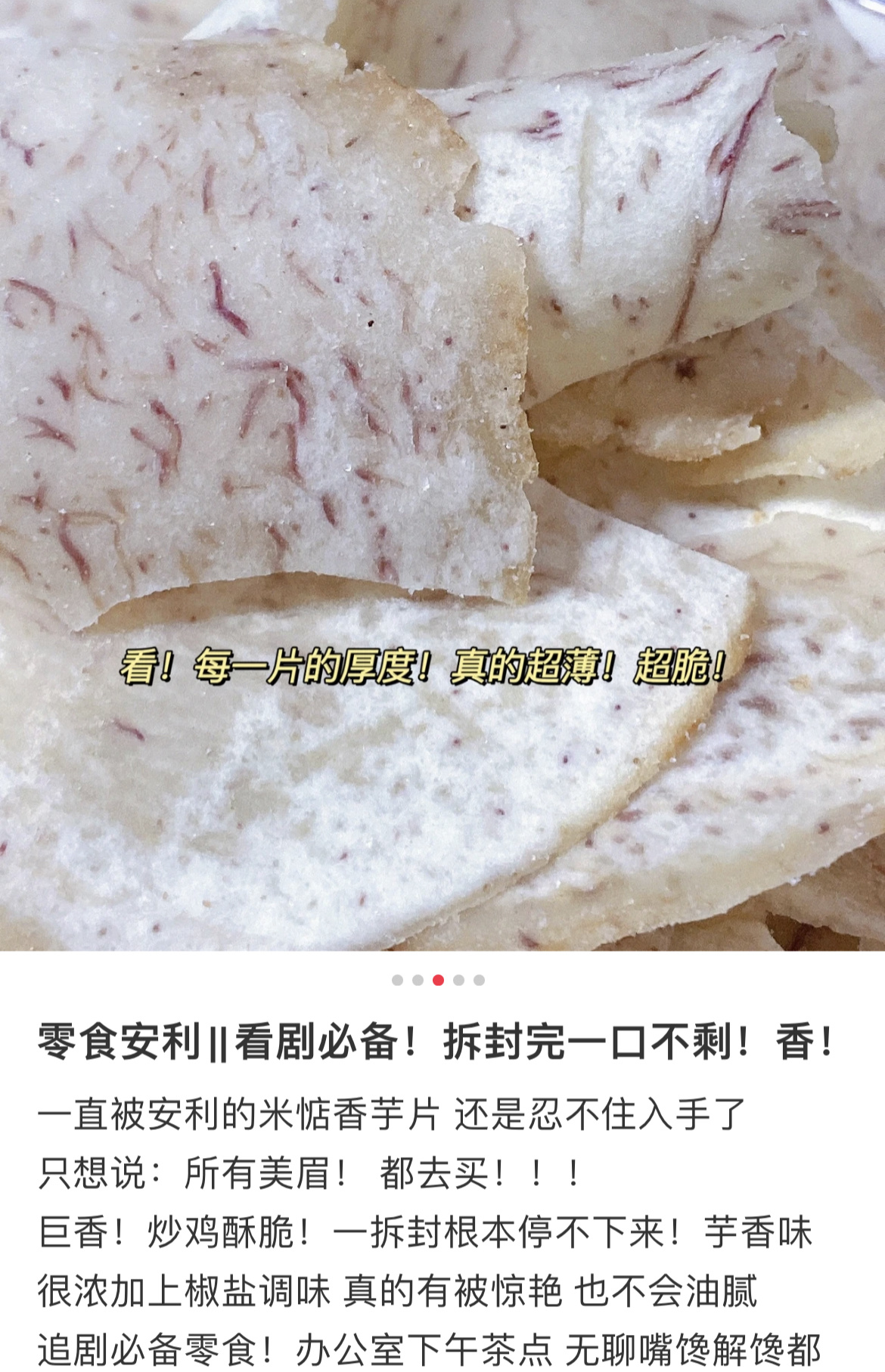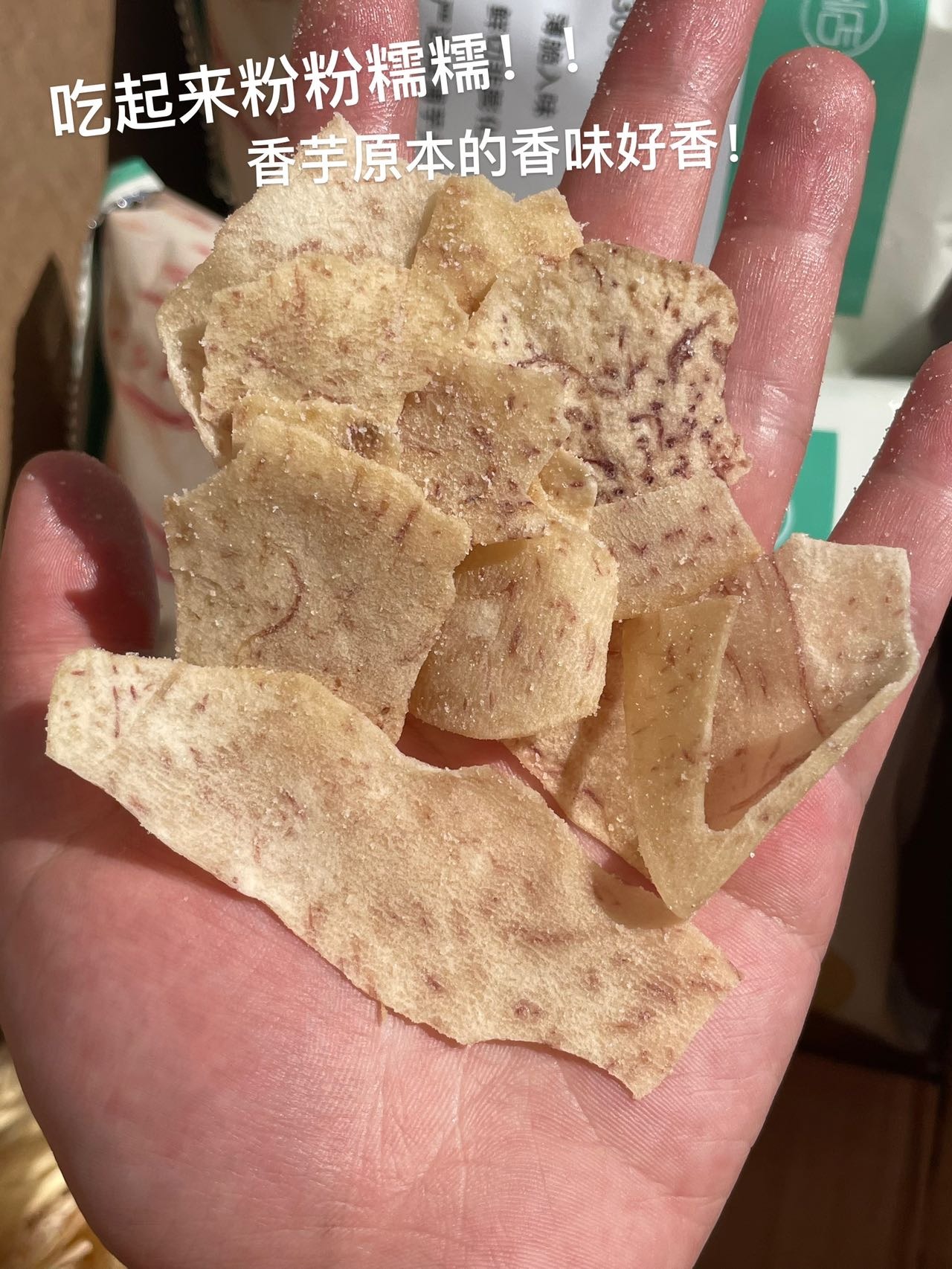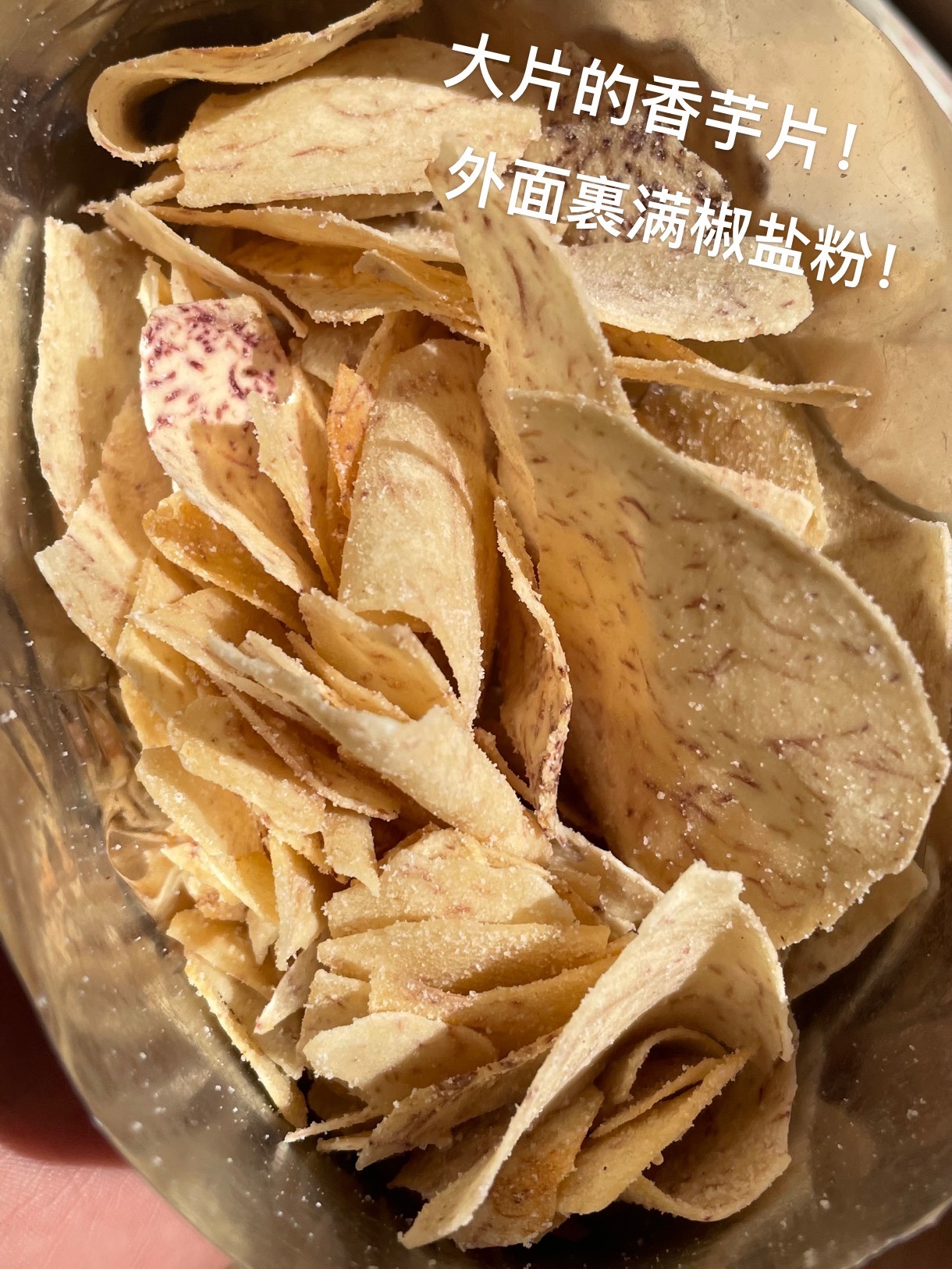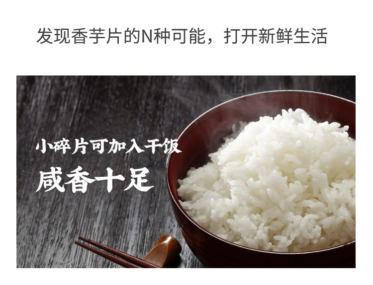 香芋片轻薄酥脆,入口带着椒盐与胡椒味,细嚼是浓浓的芋头原香在嘴里释放蔓延,咔滋咔滋,一袋肯定是吃不够!非常非常香,每一片都油油润润,过瘾!不过,在运输过程中难免会因为碰撞挤压等原因破碎,碎掉的香芋片有了更多重的吃法,可以直接倒嘴里,也可以拌饭或加酸奶里,也是别有一番风味了!