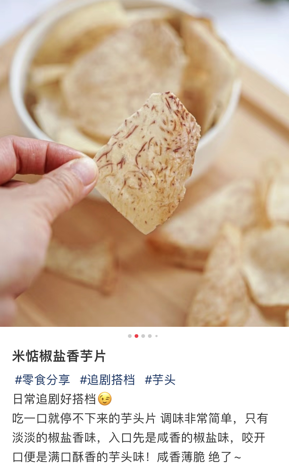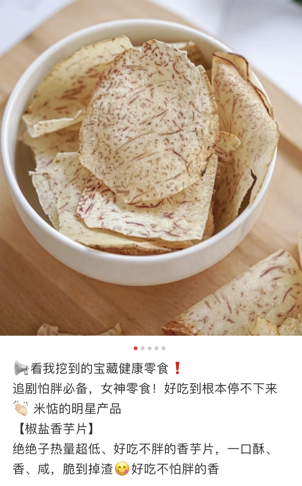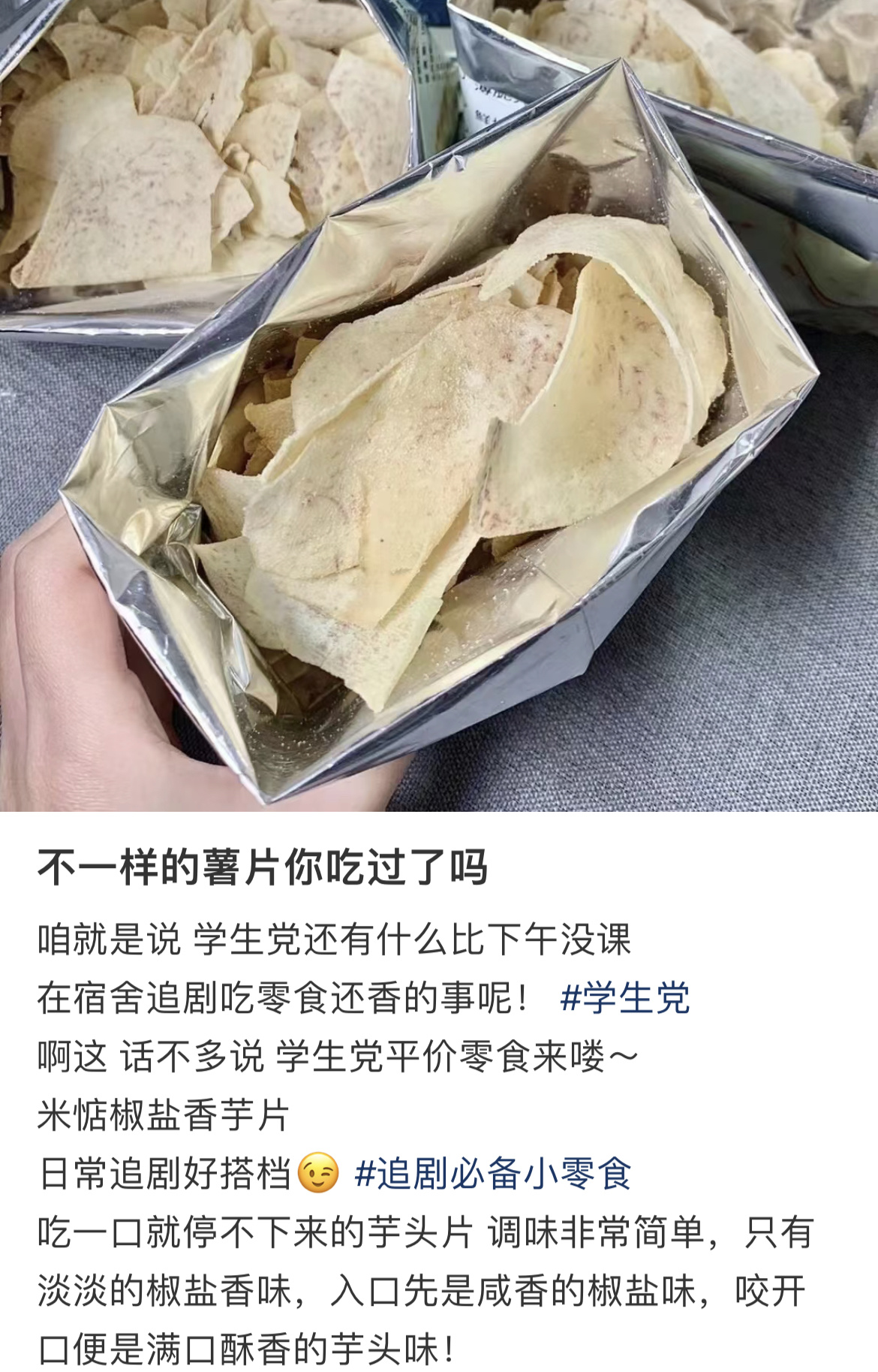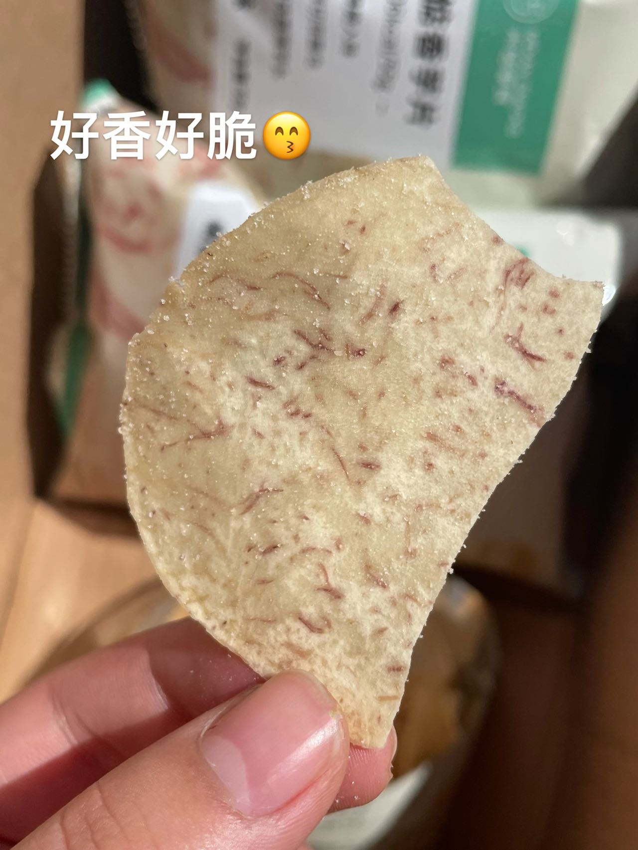 香芋片轻薄酥脆,入口带着椒盐与胡椒味,细嚼是浓浓的芋头原香在嘴里释放蔓延,咔滋咔滋,一袋肯定是吃不够!非常非常香,每一片都油油润润,过瘾!不过,在运输过程中难免会因为碰撞挤压等原因破碎,碎掉的香芋片有了更多重的吃法,可以直接倒嘴里,也可以拌饭或加酸奶里,也是别有一番风味了!