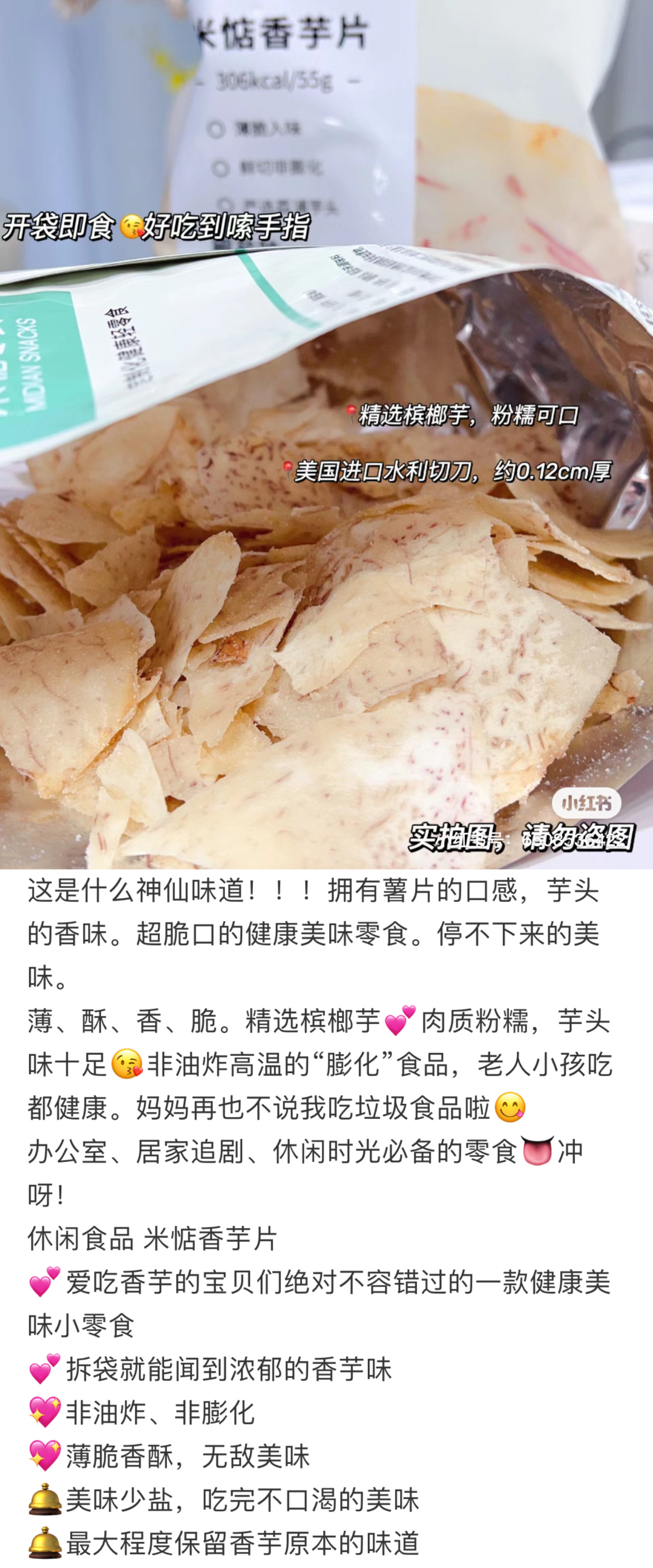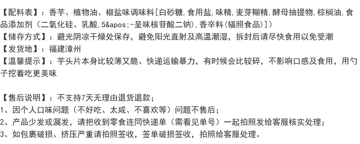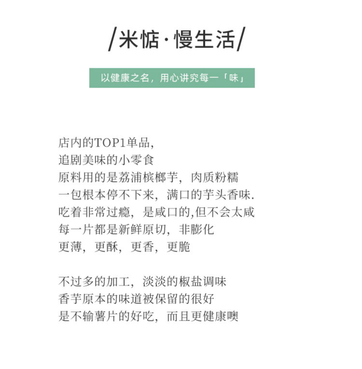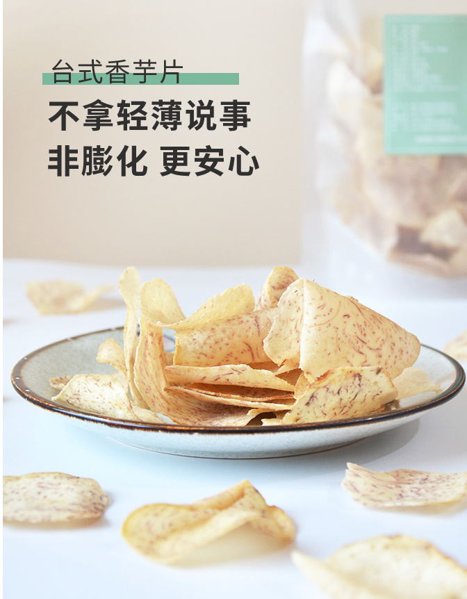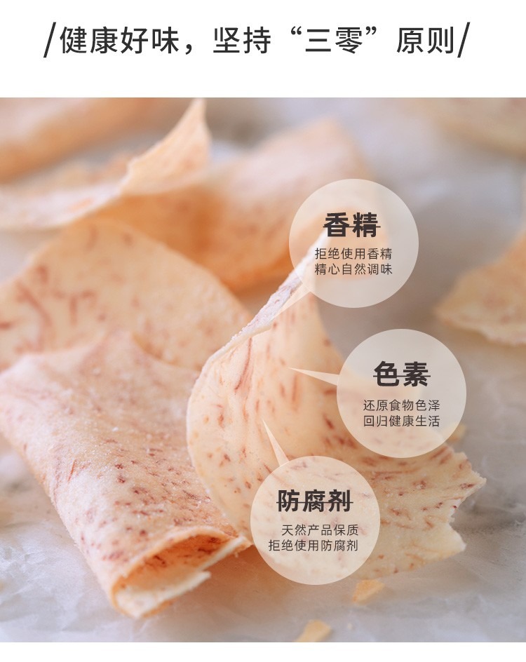 米惦的香芋片真的是太太太好吃啦!用的是拥有"皇室贡品"之称广西荔浦的槟榔芋,相传乾隆帝就很喜欢吃,是芋头中的优质品种。从原产地直供的荔浦芋头个大,没有斑点,纹理清晰,有着淡紫色的细密纹理,新鲜采挖后经过三遍清洗,精细去皮,然后切成1.2MM左右的薄片,过水杀青,油浴锁鲜成酥脆薄片,不添加任何香精色素防腐剂,只添加适量的椒盐进行调味,喜欢薯片的可以吃吃!