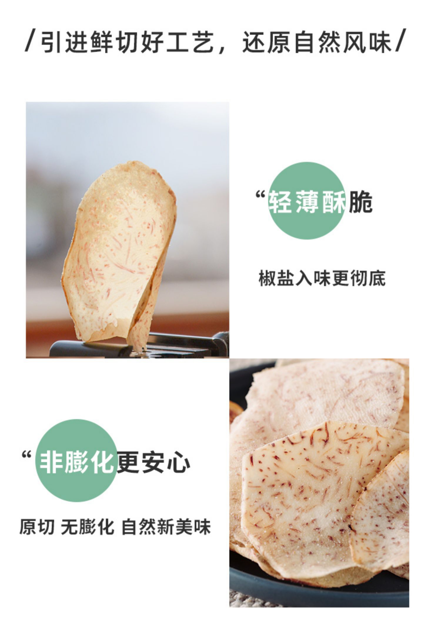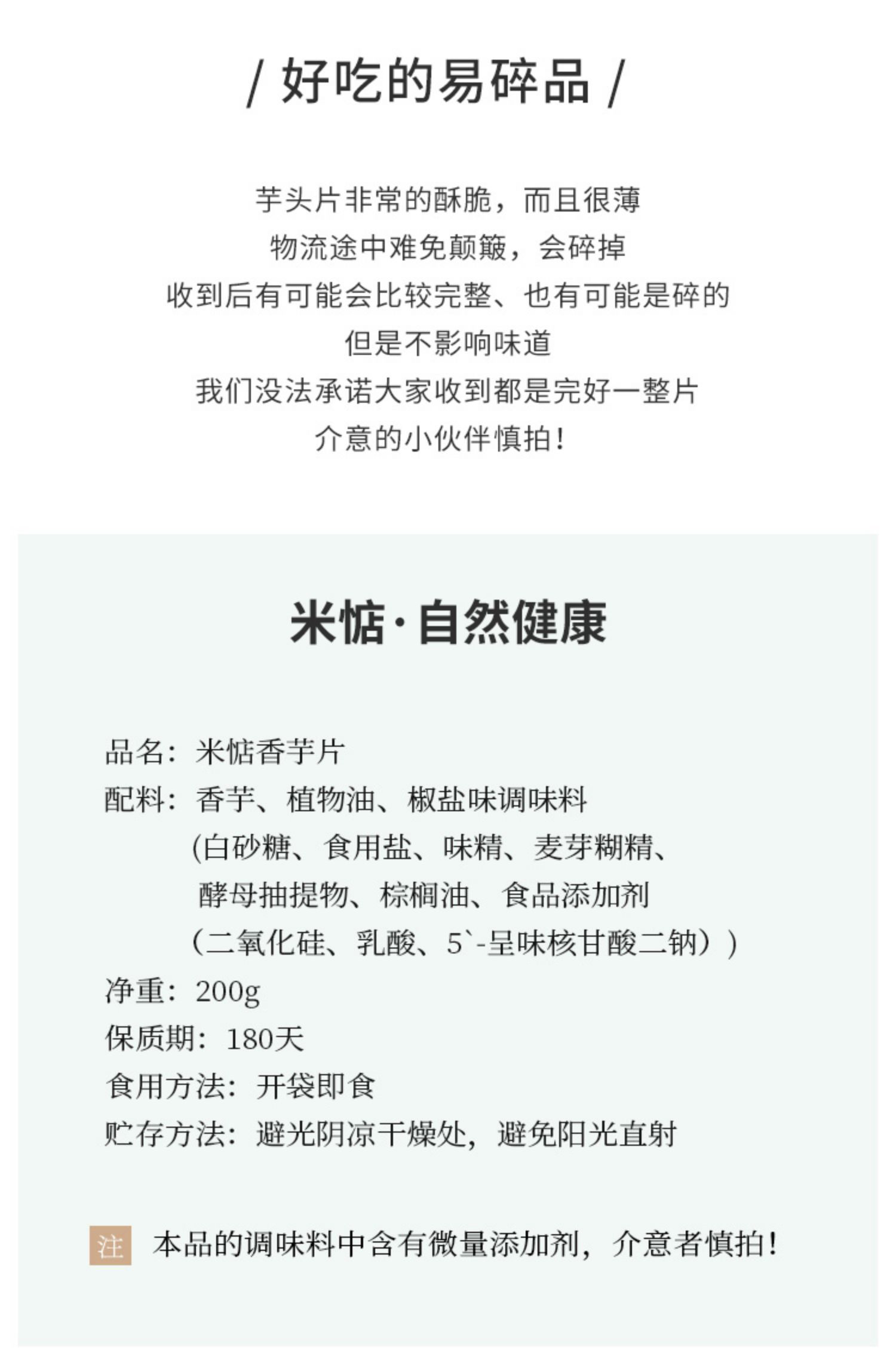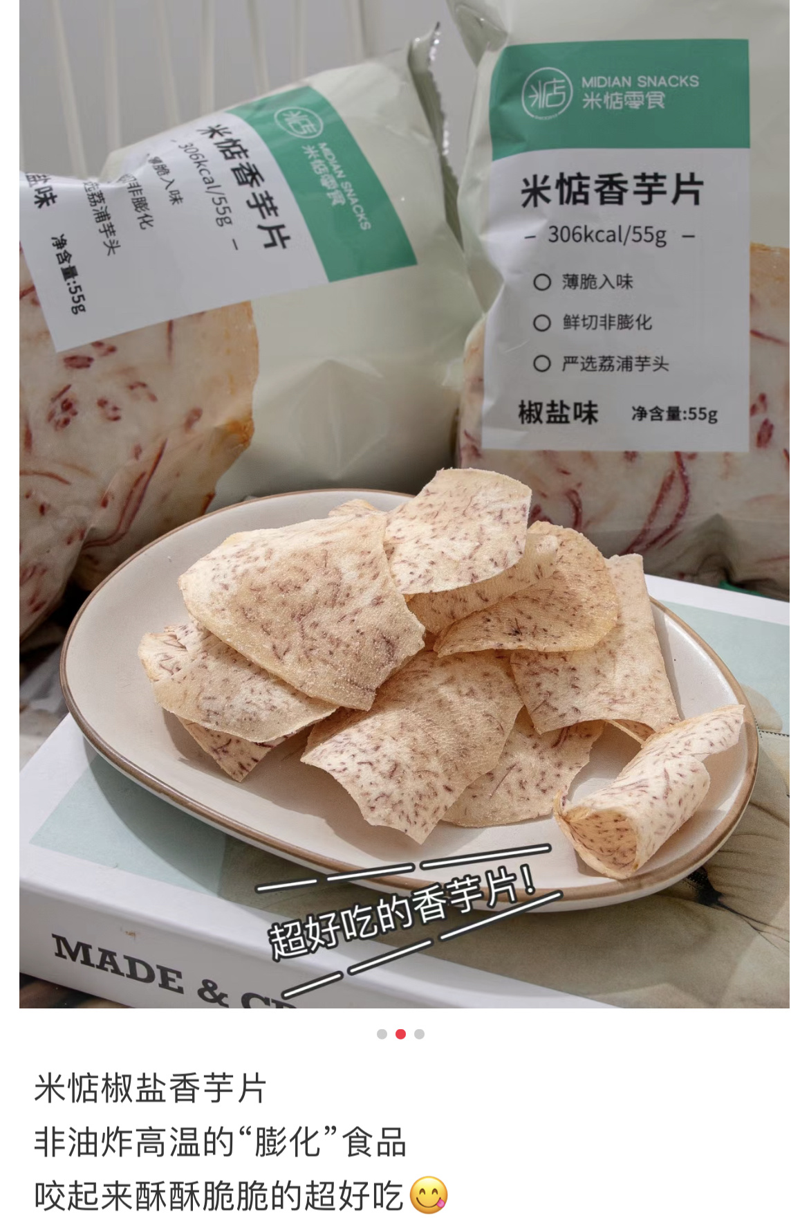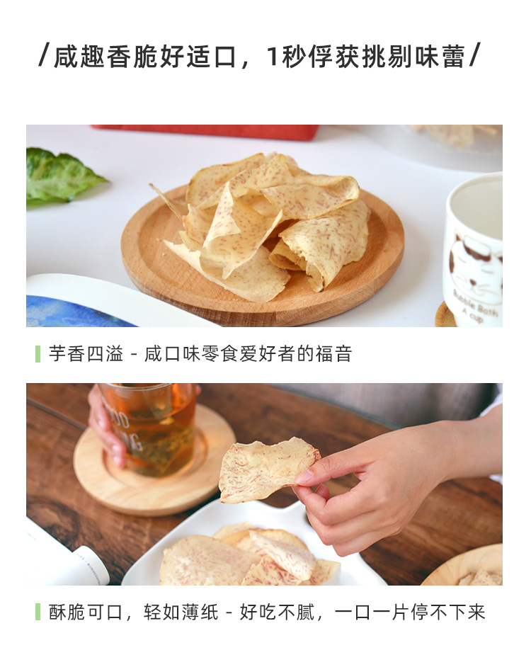 米惦的香芋片真的是太太太好吃啦!用的是拥有"皇室贡品"之称广西荔浦的槟榔芋,相传乾隆帝就很喜欢吃,是芋头中的优质品种。从原产地直供的荔浦芋头个大,没有斑点,纹理清晰,有着淡紫色的细密纹理,新鲜采挖后经过三遍清洗,精细去皮,然后切成1.2MM左右的薄片,过水杀青,油浴锁鲜成酥脆薄片,不添加任何香精色素防腐剂,只添加适量的椒盐进行调味,喜欢薯片的可以吃吃!