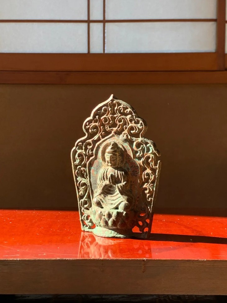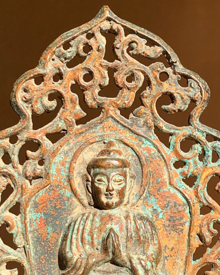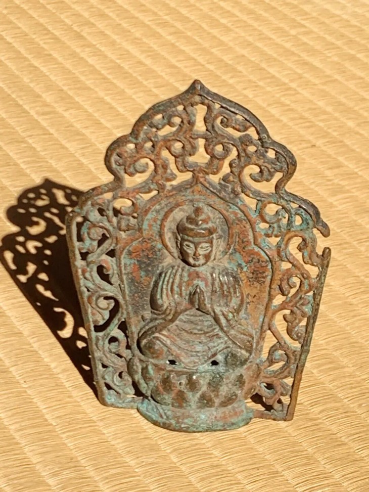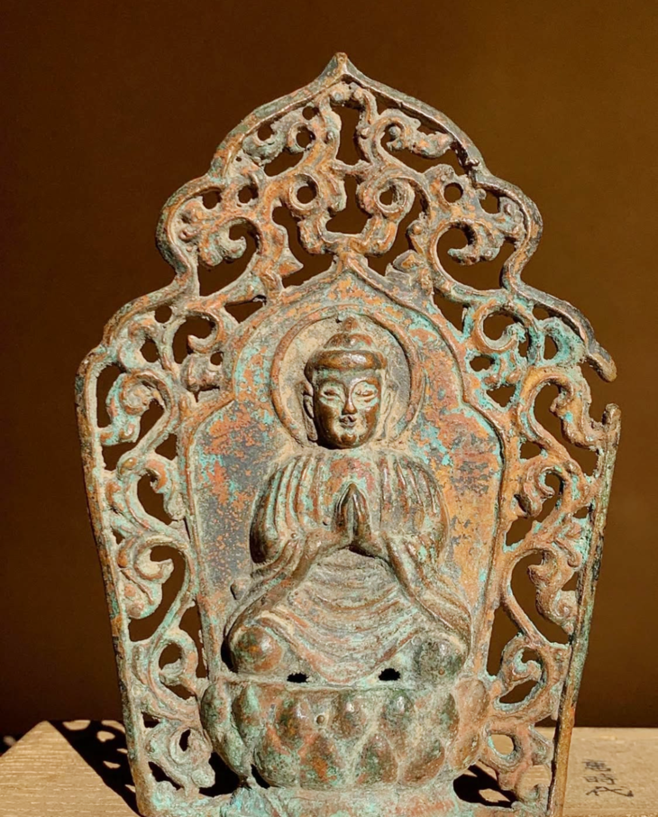 这是一尊制作精美青铜镂空唐草纹背光菩萨坐像,取材厚重之精炼铜铸造雕刻而成,扁平镂空唐草纹背光浅浮雕莲花座上如来佛端坐像,背面光素无纹,表面青铜褐红皮壳略带绿锈斑,整体造型高雅大方,镂空与浮雕线条纹饰流畅,面部相容和熙,宽额丰颐,五官雕刻精细,双目微阖,温静含笑,佛身袈裟线条与背光唐草纹构图精美,雕刻细腻,充分体现早期佛像塑造匠人的精湛工艺, 仍然保留日本收藏家订制的桐木盒,盒上标签墨书:”古銅佛 唐時代”。