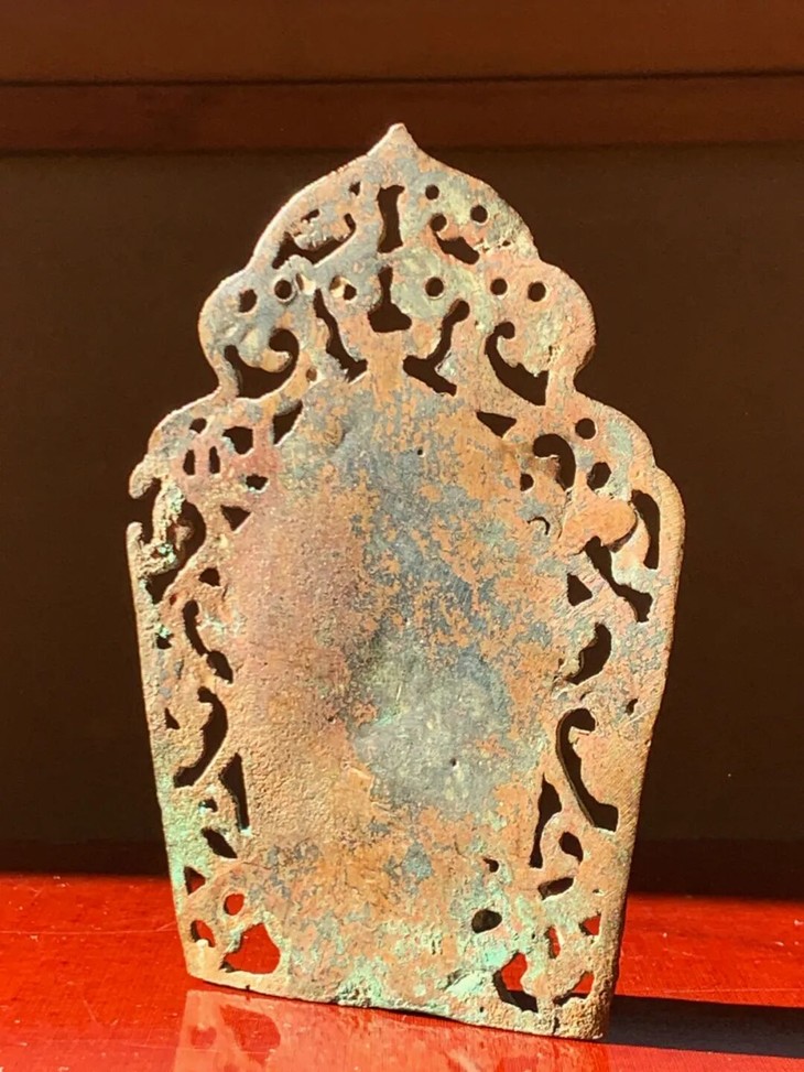 此尊青铜镂空唐草纹背光如来佛坐像,案头尺寸,高逾十二厘米,塑形典雅大方,纹饰精美细致,面容与錾刻生动写实,衣纹褶皱及背光镂空纹饰细腻,造型端庄工艺流畅自然,整体风格高雅贵气,庄严肃穆,令人赞叹,是一尊年代悠久的老青铜佛。