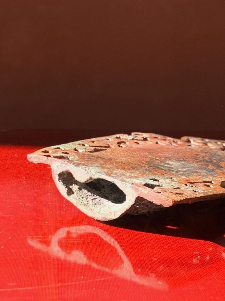 此尊青铜镂空唐草纹背光如来佛坐像,制作精美贵气,保存于日本收藏家订制的桐木盒中,前藏家购于日本古玩市场,未经国内专家鉴定年代,《用之美》专栏以精美铜佛与朋友们分享。 此青铜镂空唐草纹背光如来佛坐像,如图所示,背光一侧有小缺口,青铜表面部份斑驳细微磨损,局部附着绿色銅绣斑,除此以外,保存大致完好。