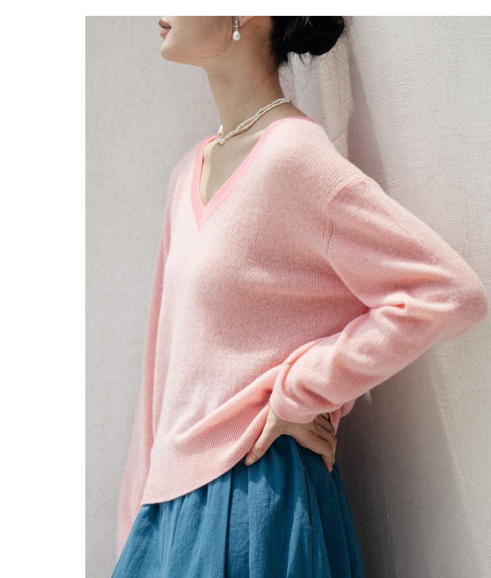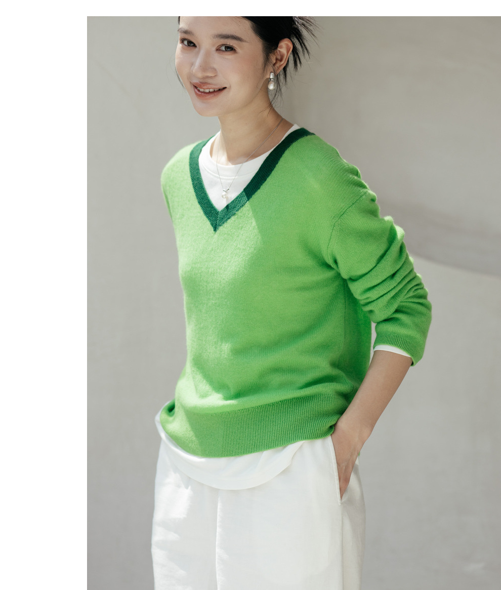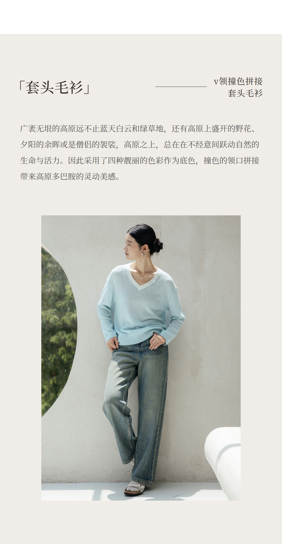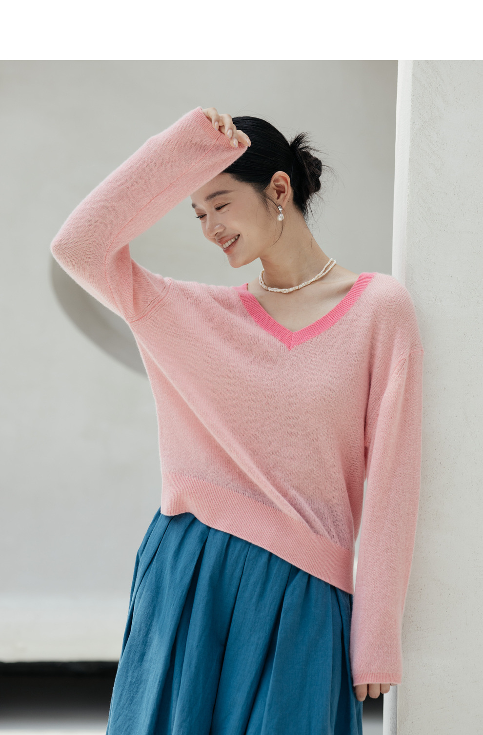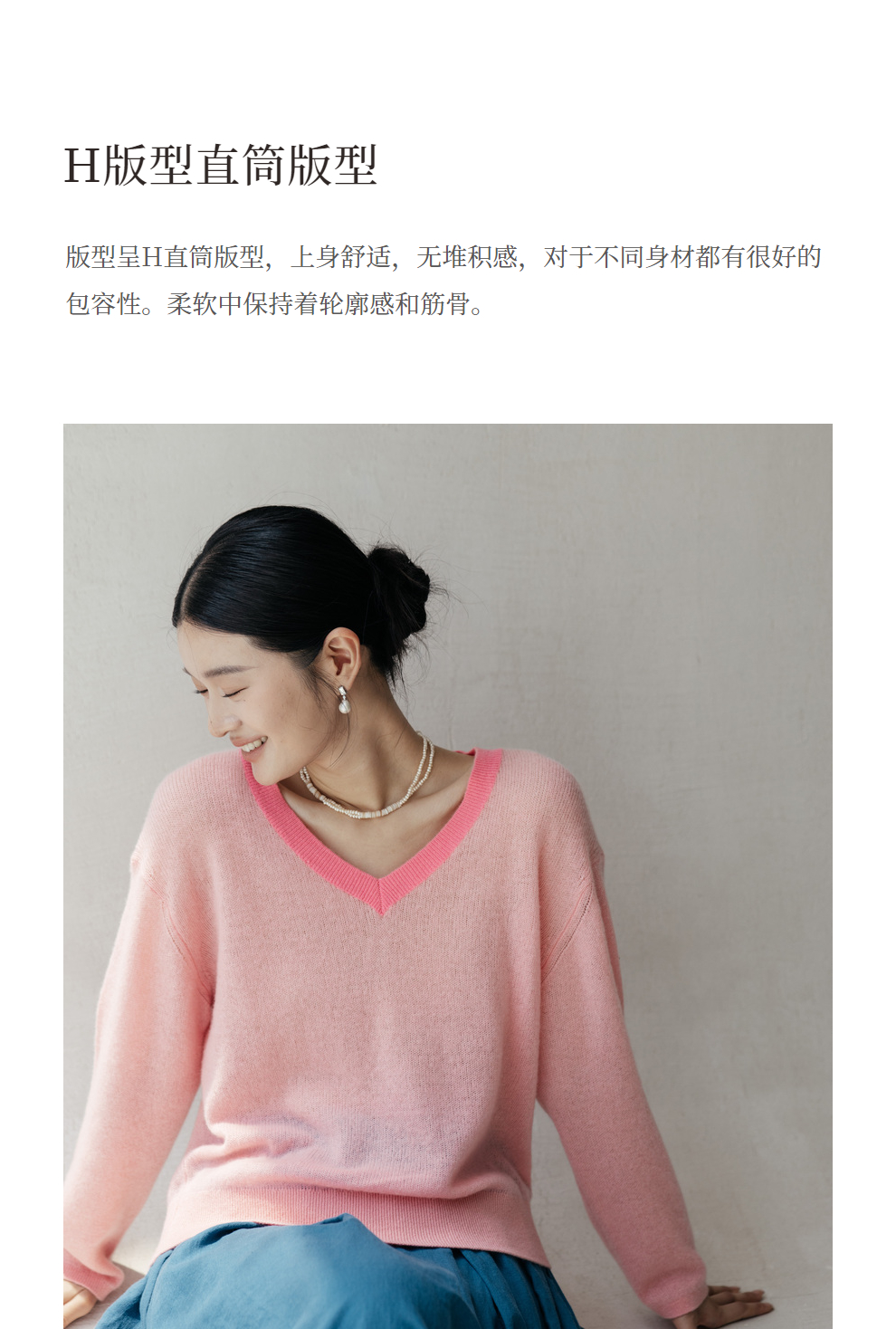 绽放旅行女装550朵/早秋重磅山羊绒v领撞色领口拼接套头针织衫