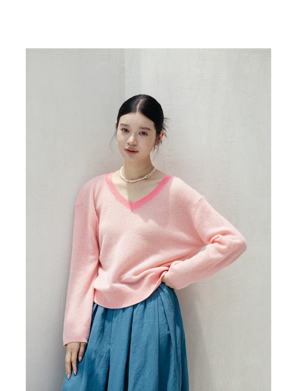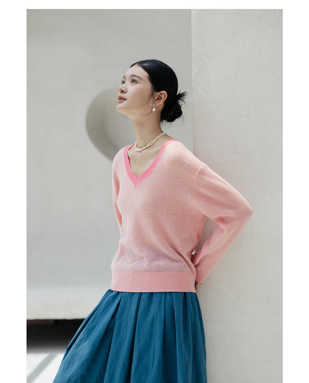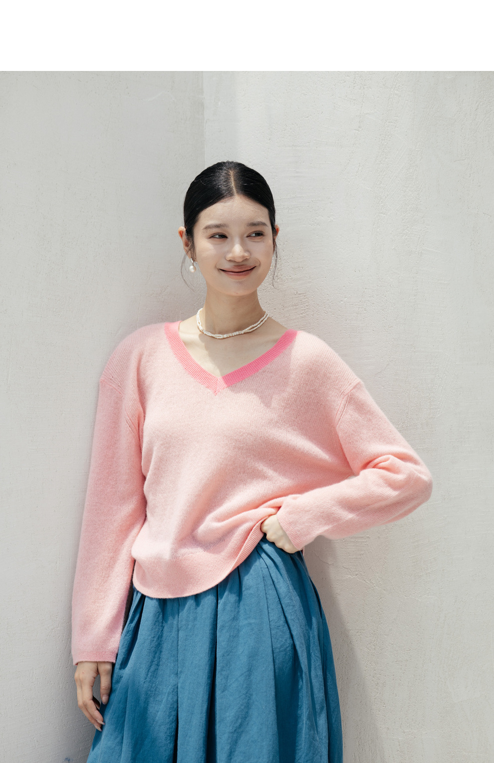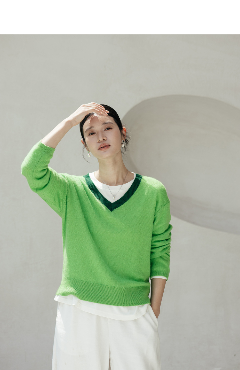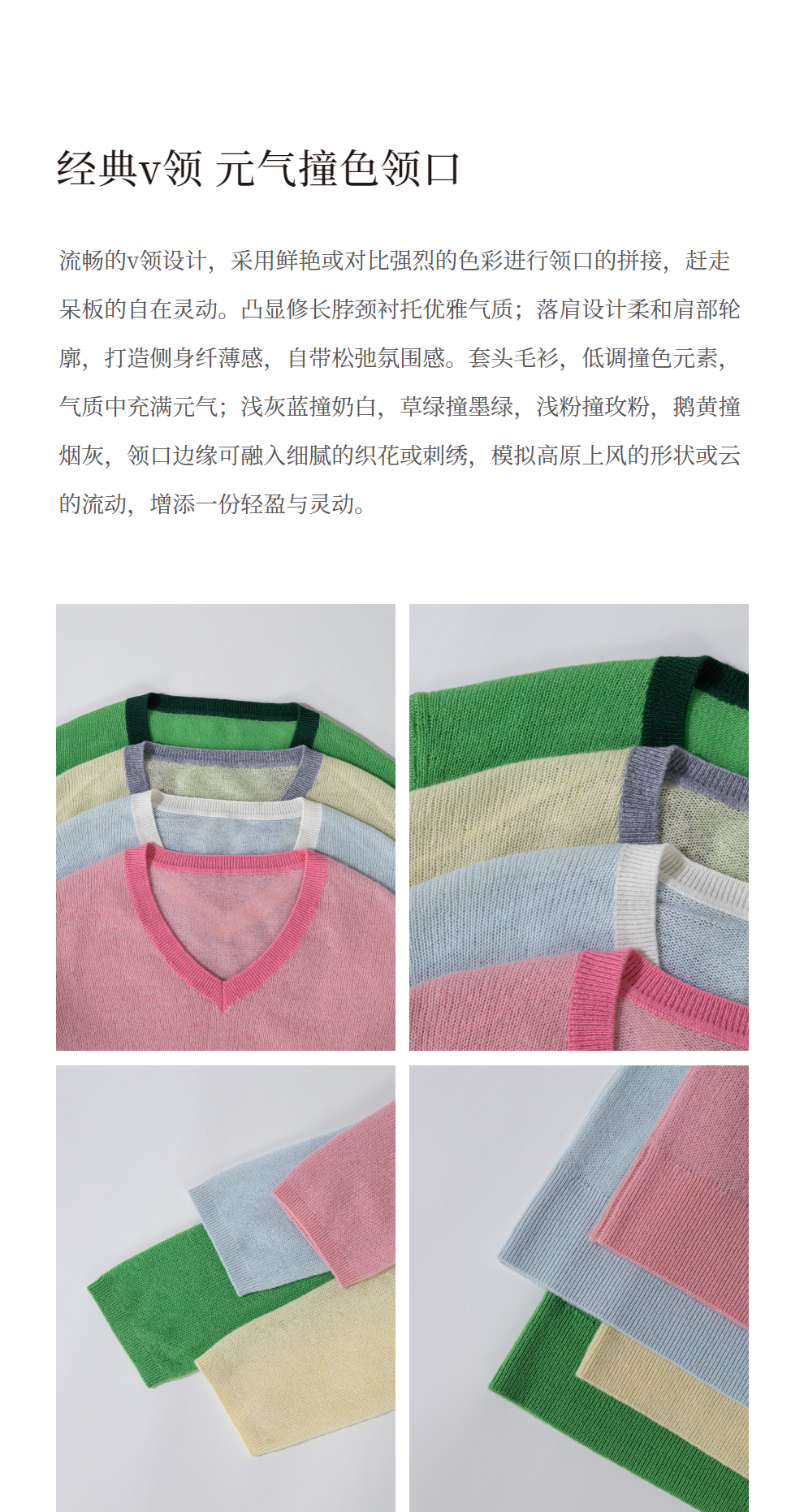 绽放旅行女装550朵/早秋重磅山羊绒v领撞色领口拼接套头针织衫