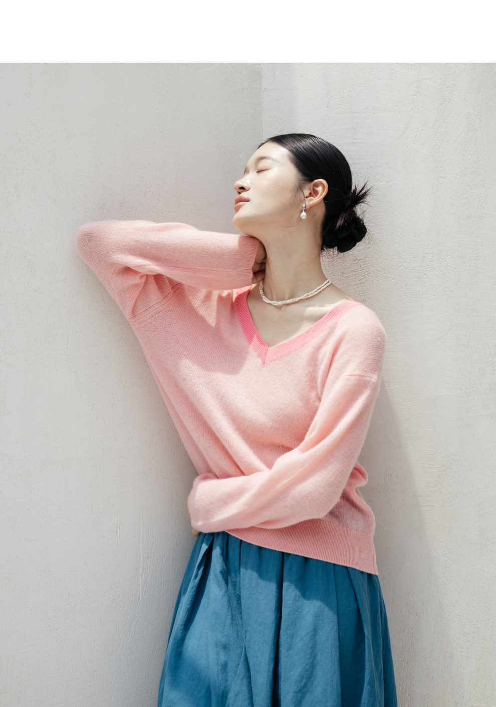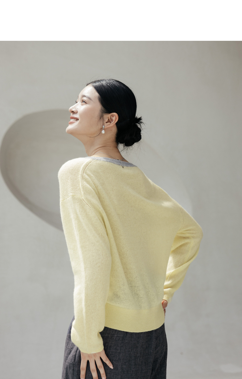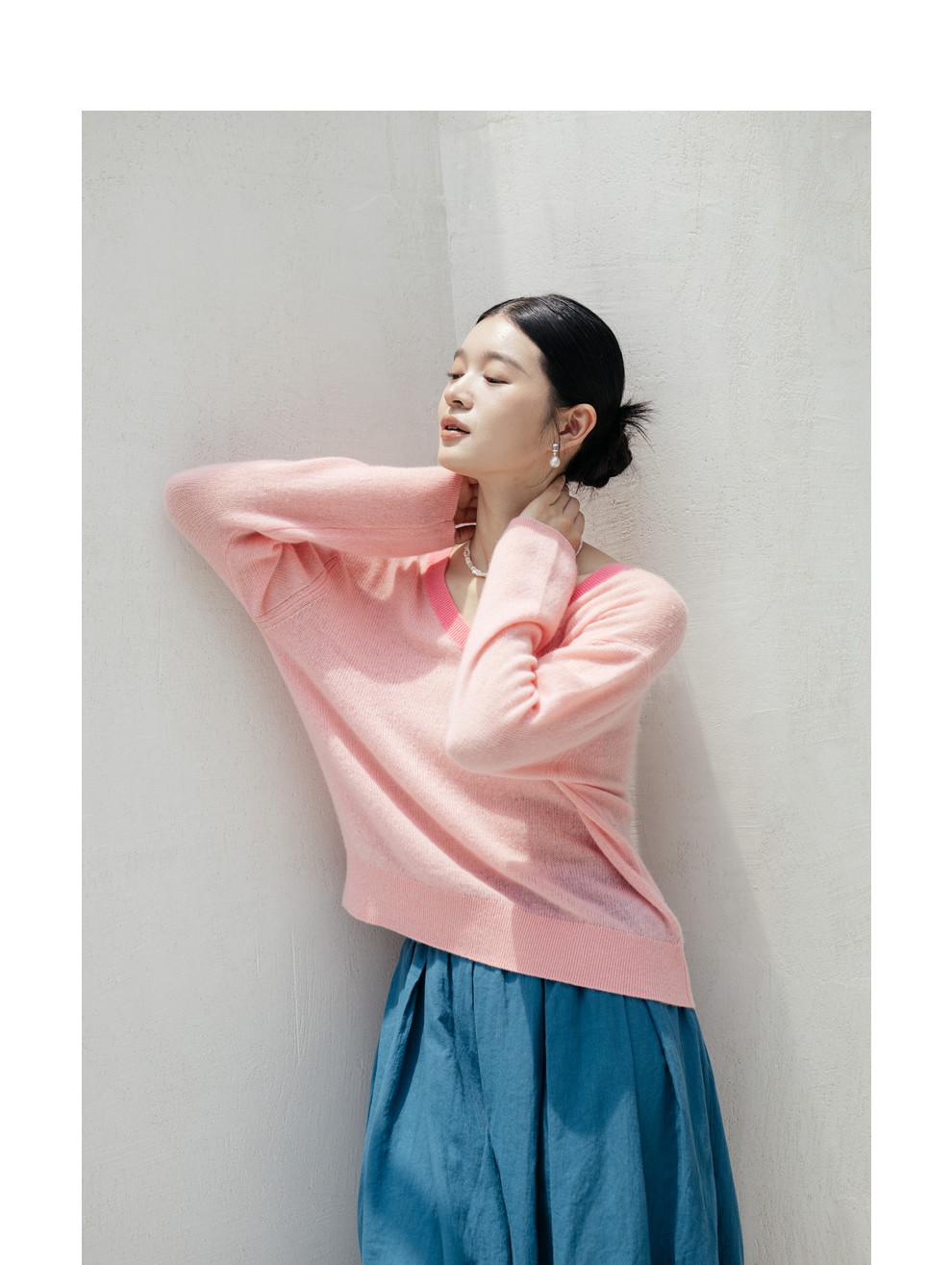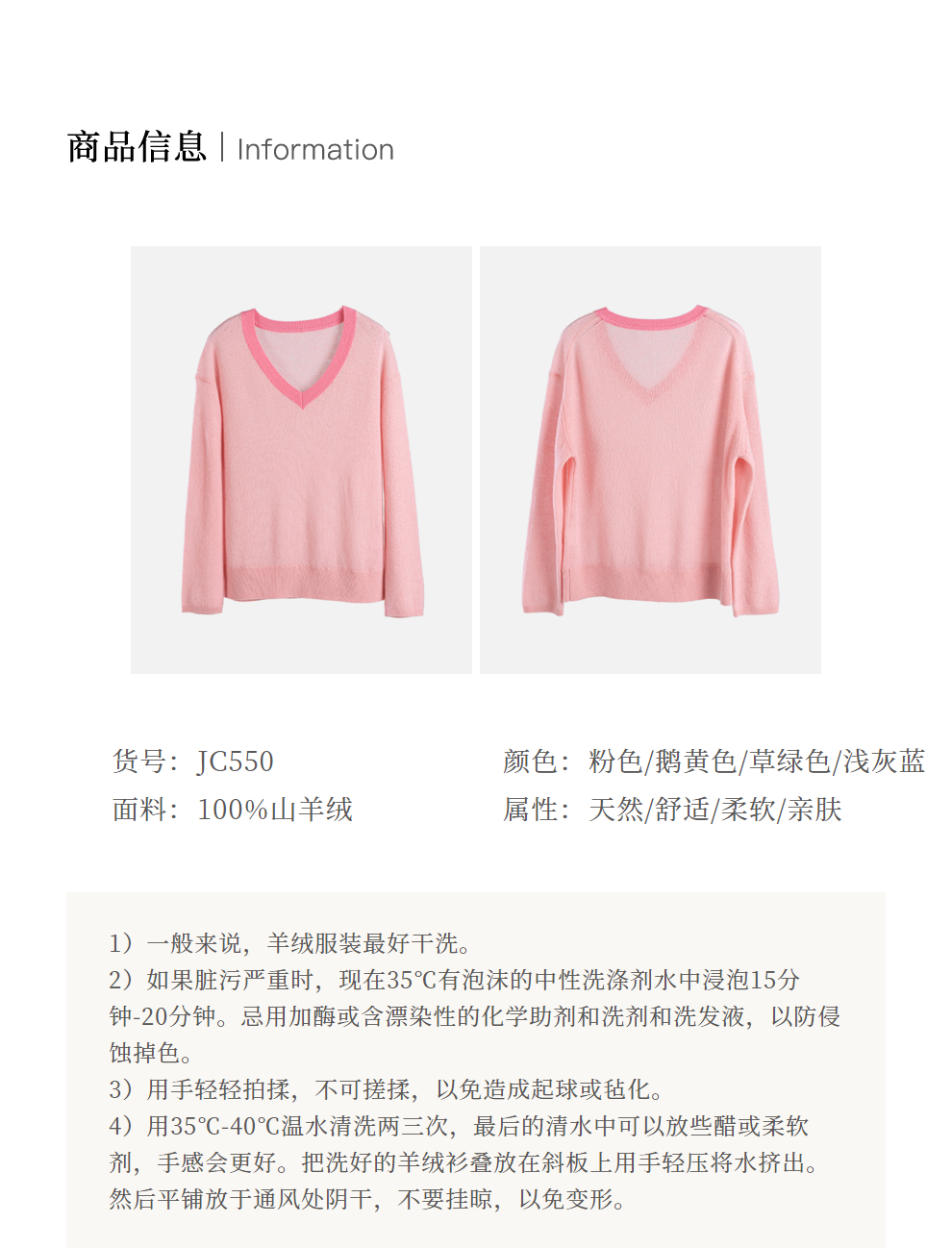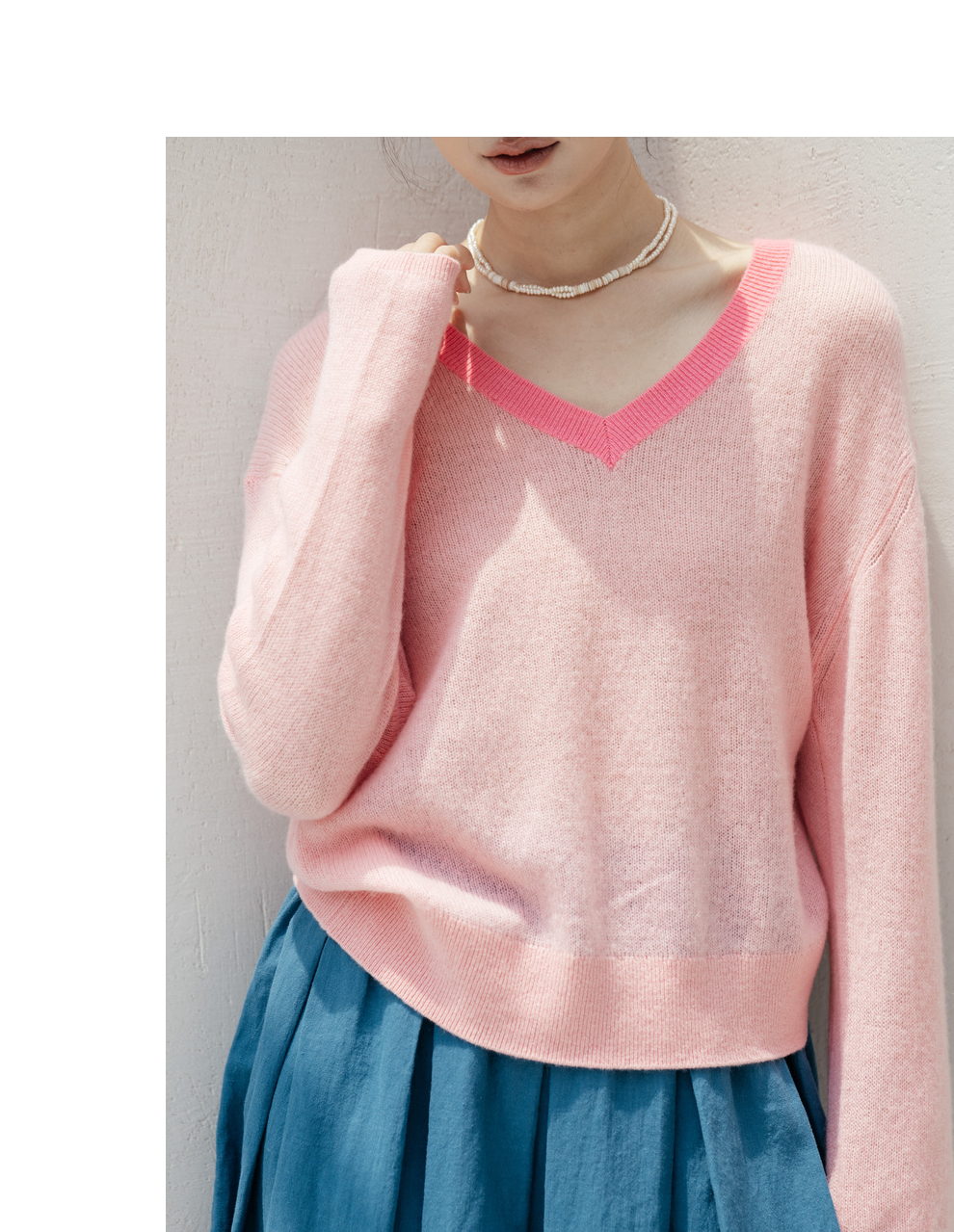绽放旅行女装550朵/早秋重磅山羊绒v领撞色领口拼接套头针织衫
