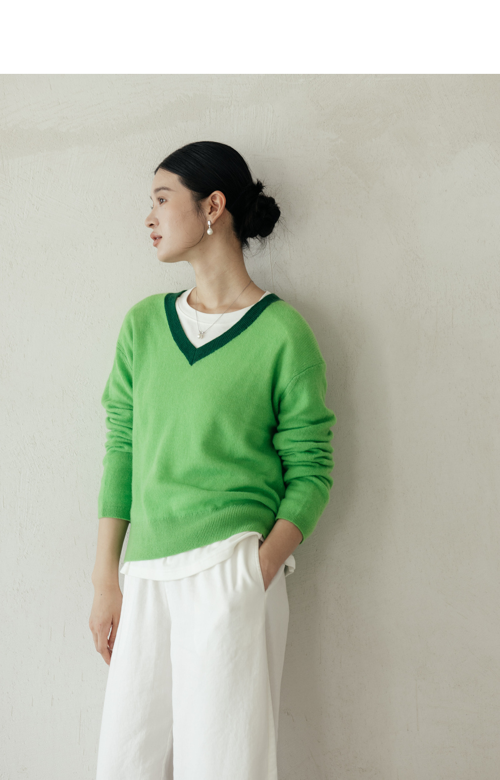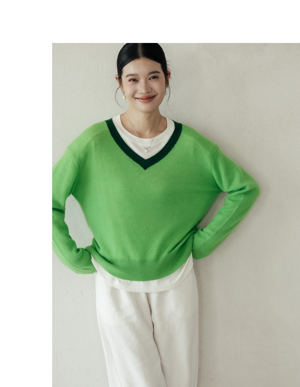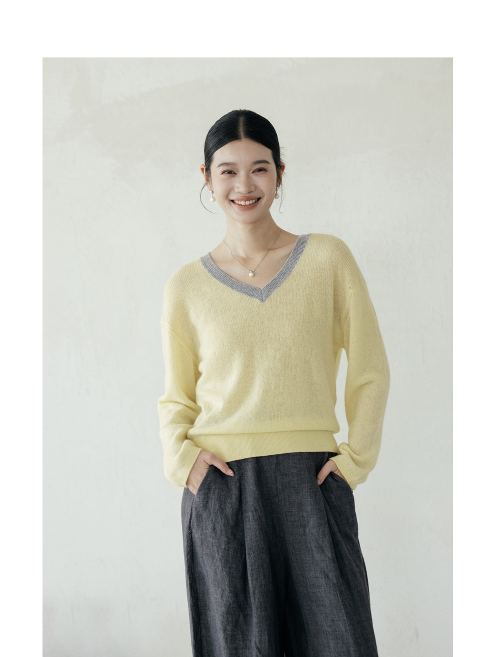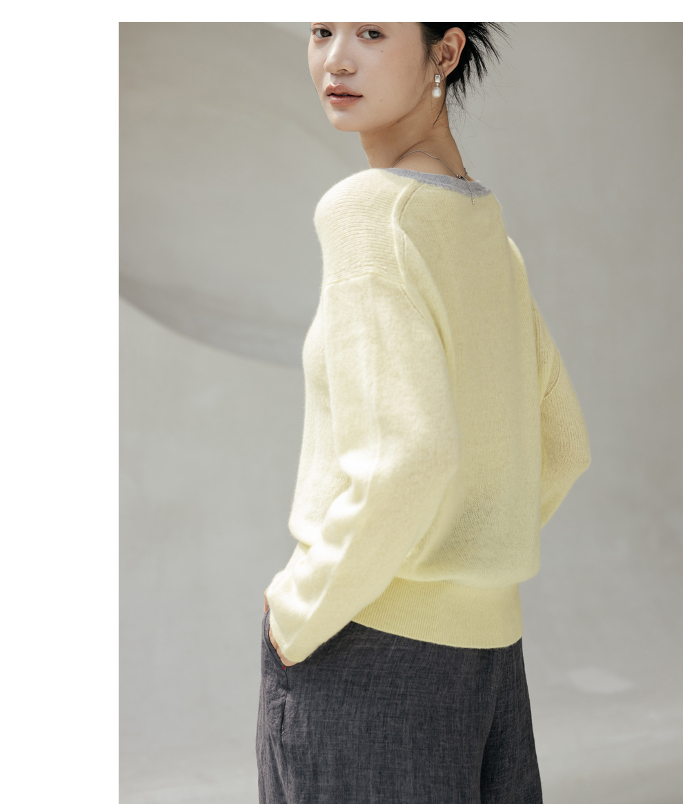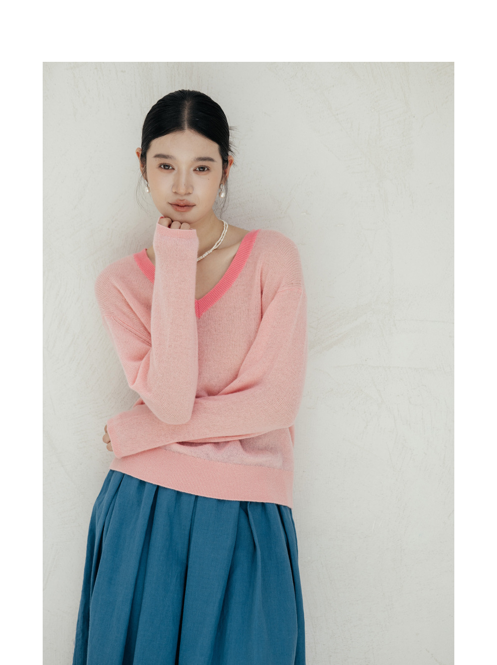 绽放旅行女装550朵/早秋重磅山羊绒v领撞色领口拼接套头针织衫
