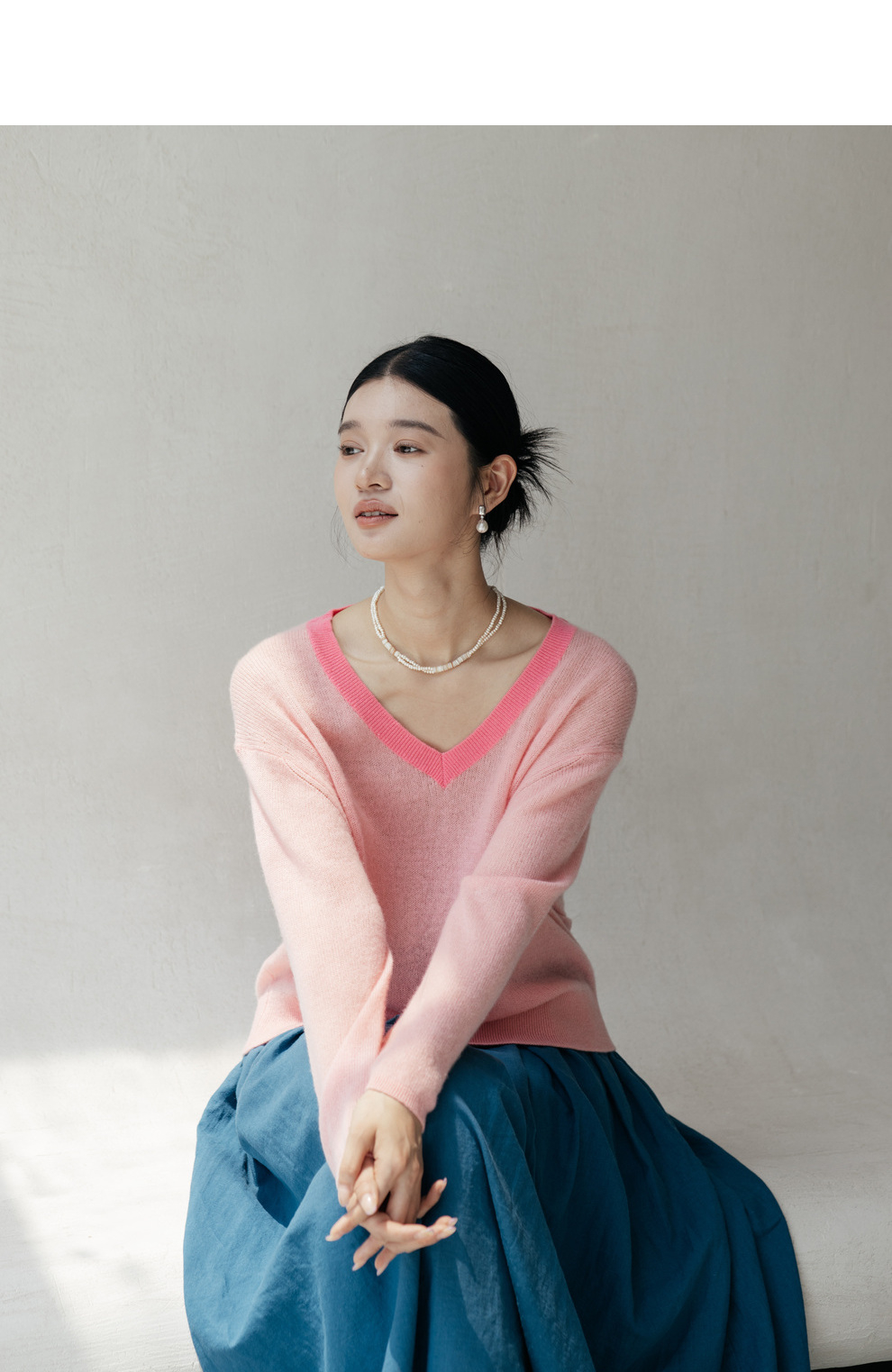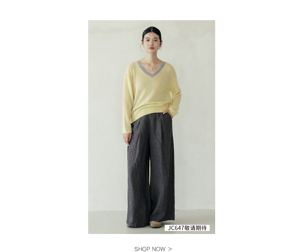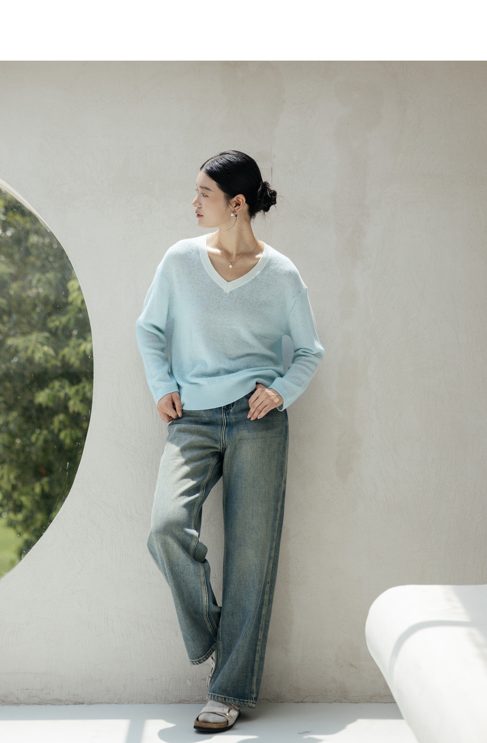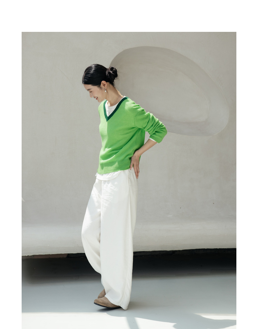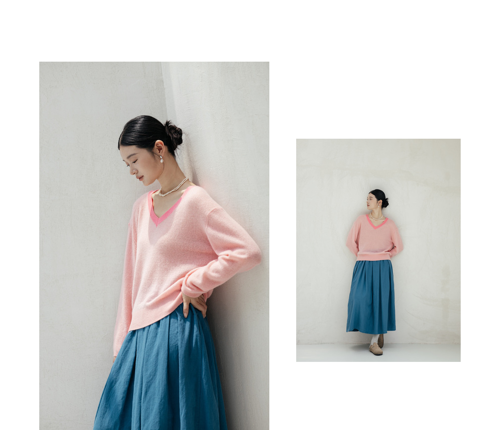 绽放旅行女装550朵/早秋重磅山羊绒v领撞色领口拼接套头针织衫