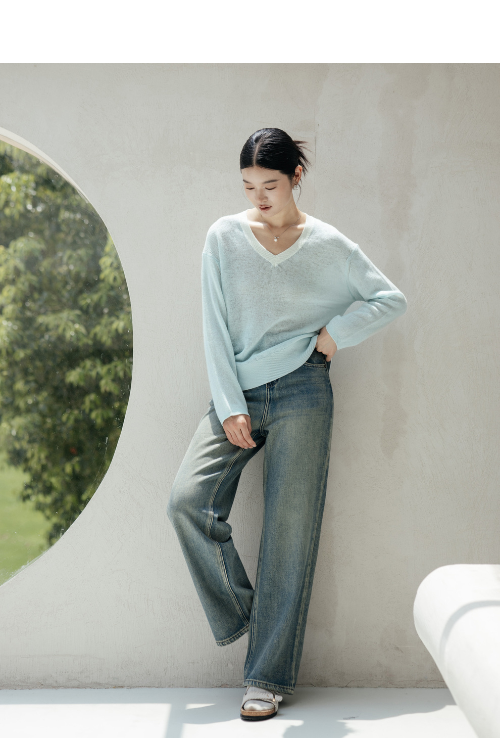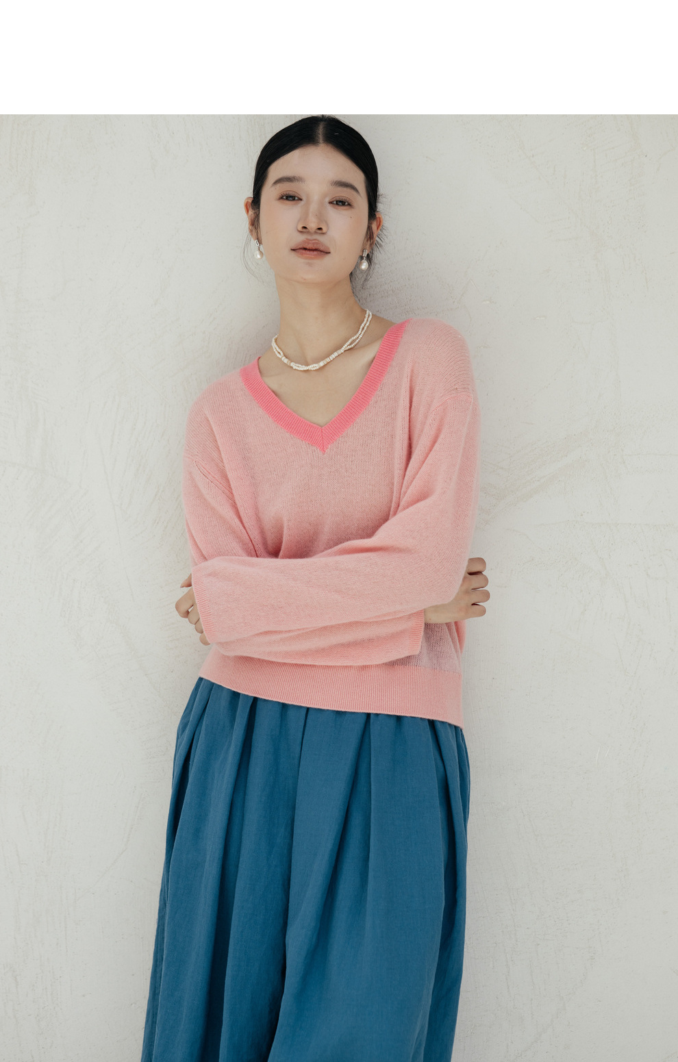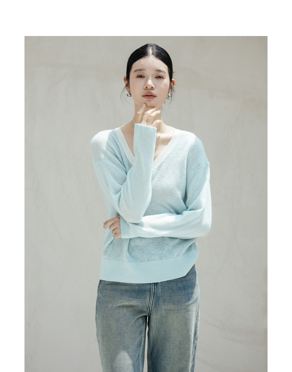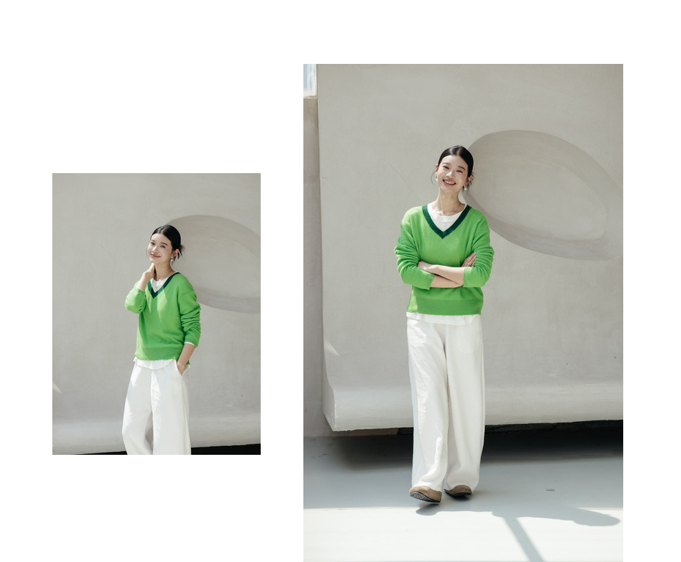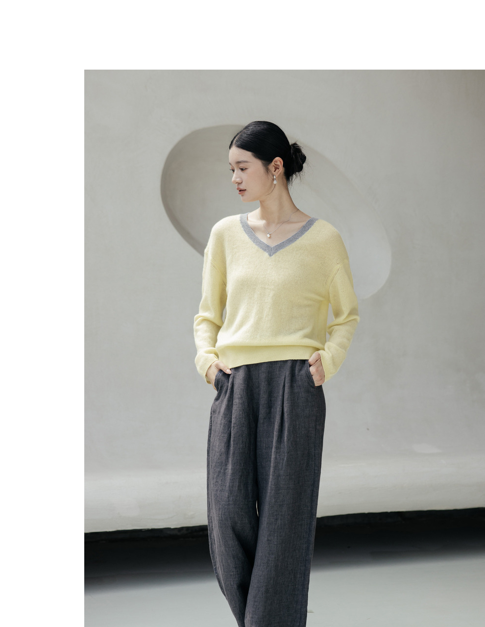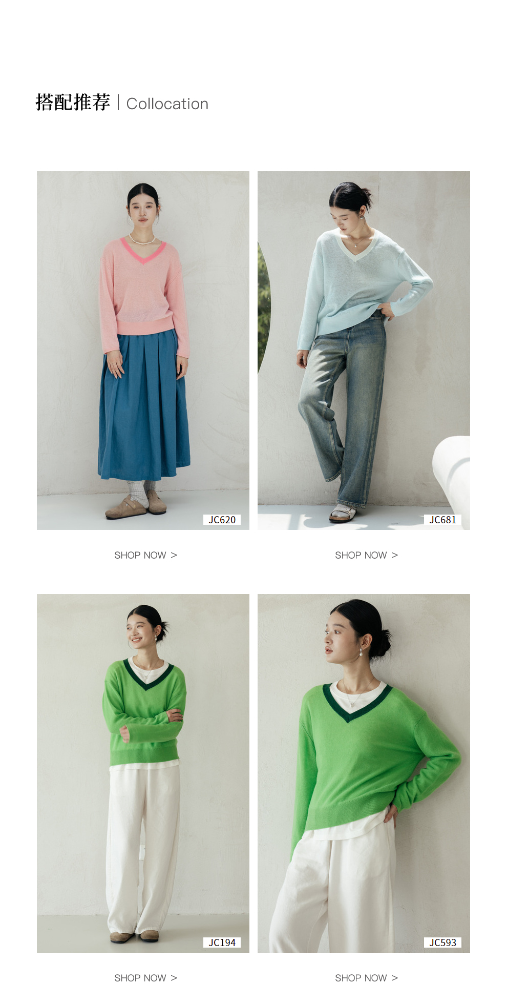 绽放旅行女装550朵/早秋重磅山羊绒v领撞色领口拼接套头针织衫