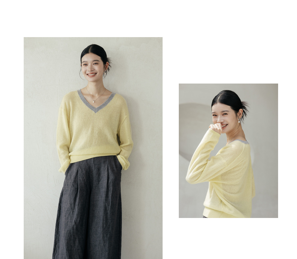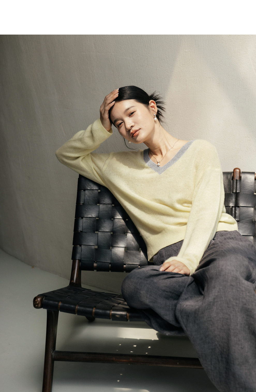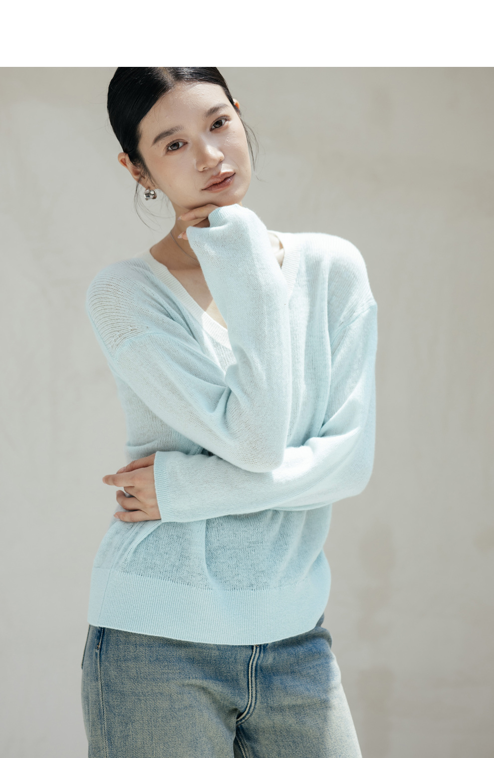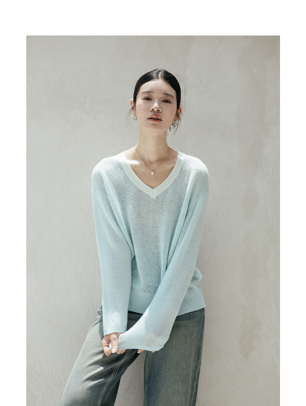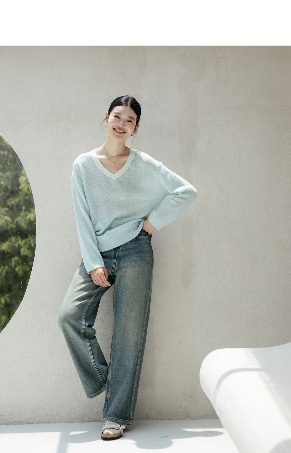 绽放旅行女装550朵/早秋重磅山羊绒v领撞色领口拼接套头针织衫