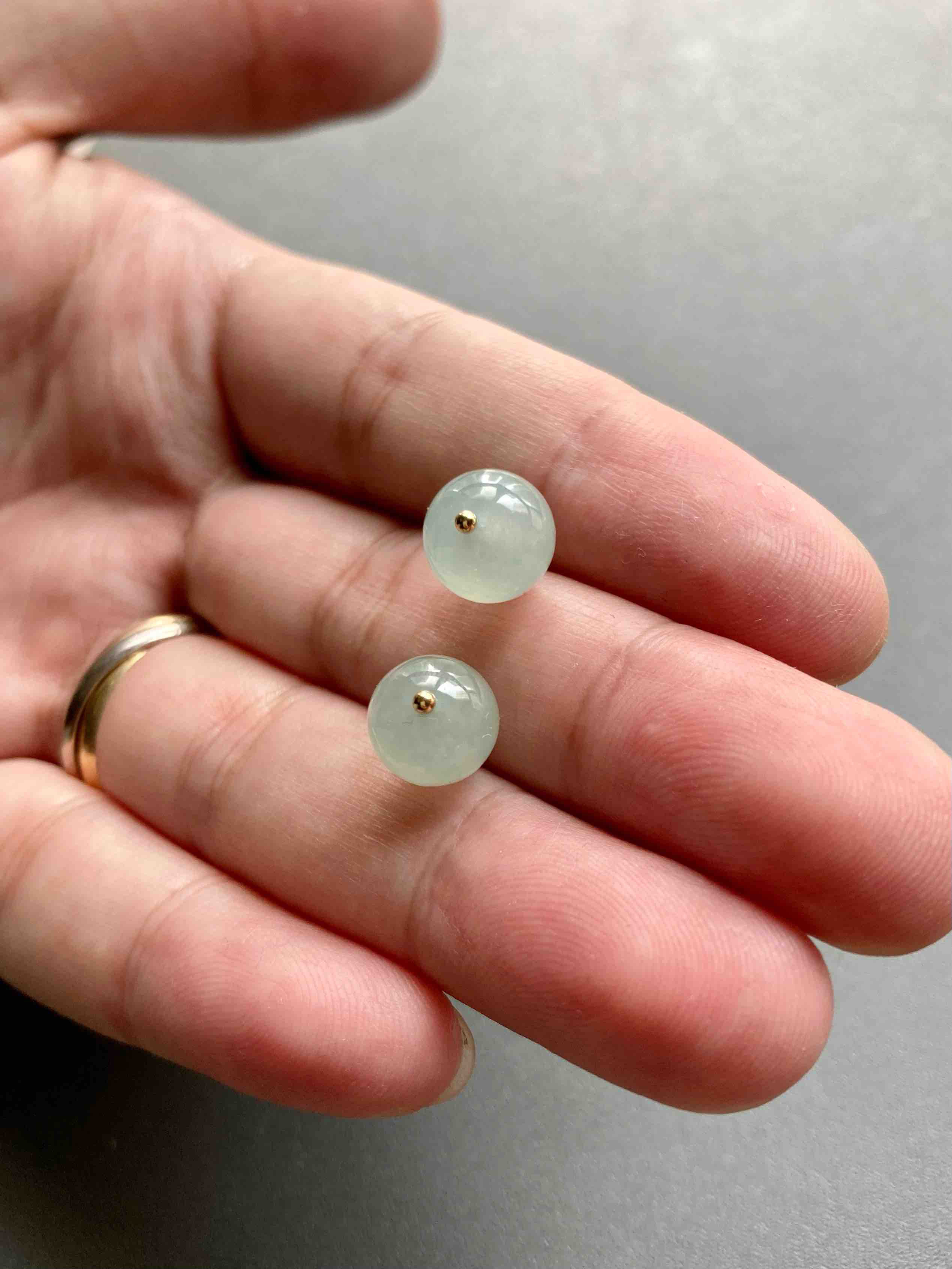 稀有冰种翡翠珠子耳钉,尺寸特别好,珠子9.2mm,玩珠子的就知道现在种水这么透还能这么大的珠子多难搞,有多贵。我们一对哦,简洁的18k黄金镶嵌,经典款耳钉,日常佩戴绝佳,一对两颗只要小四价位,推荐