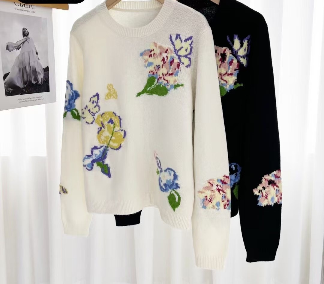 伯妮斯茵 | 复古油画风 黑色彩色花卉提花针织衫 秋冬艺术感百搭上衣 HJ3E22