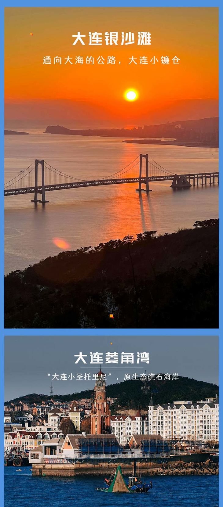 - 下午|约下午抵达大连酒店办理入住,之后自由结伴打卡大连海岸线(可以打卡渔人码头、菱角湾、老码头、威尼斯水街、老街、俄罗斯风情街等海岸线景点;还可以游览星海广场、中山广场、友好广场等特色广场;傍晚可在跨海大桥附近欣赏大连醉美日落;晚上可以自由欣赏大连夜景和品尝美食小吃,星海广场晚上有灯光秀和美食街)。