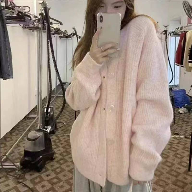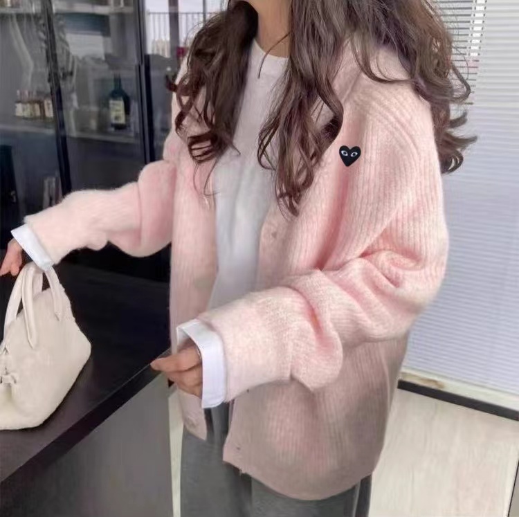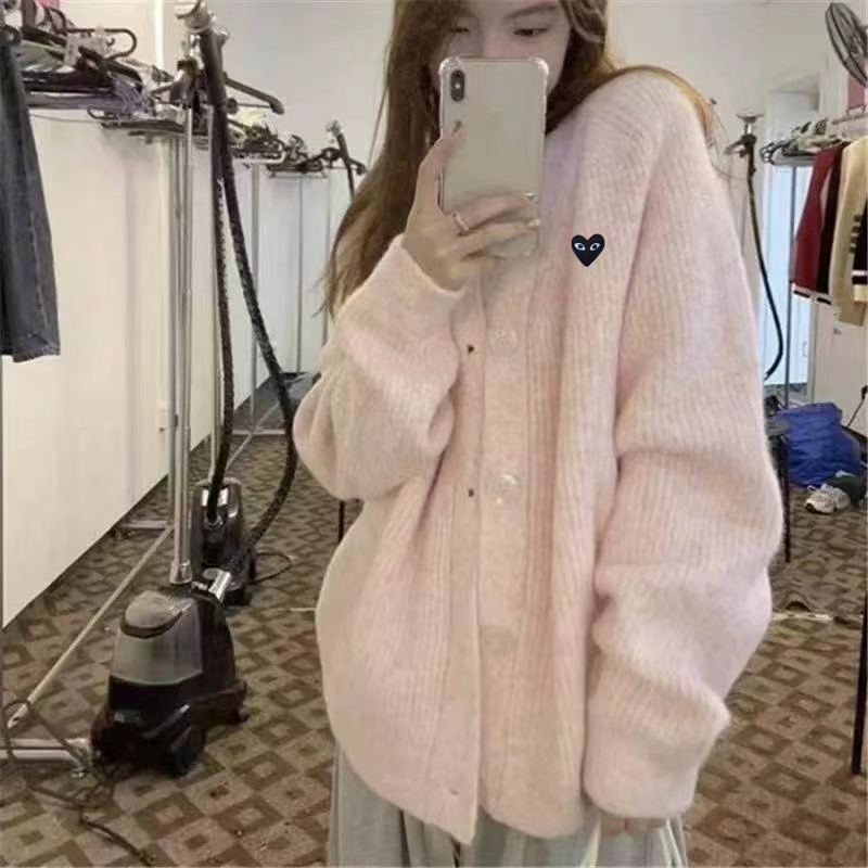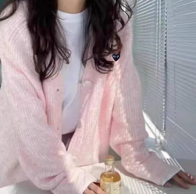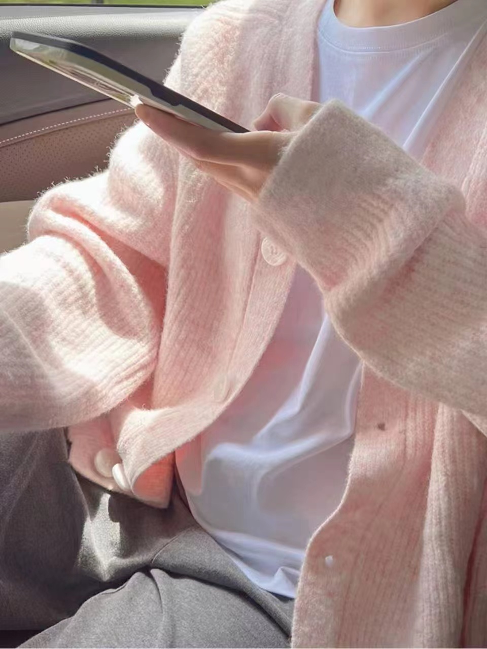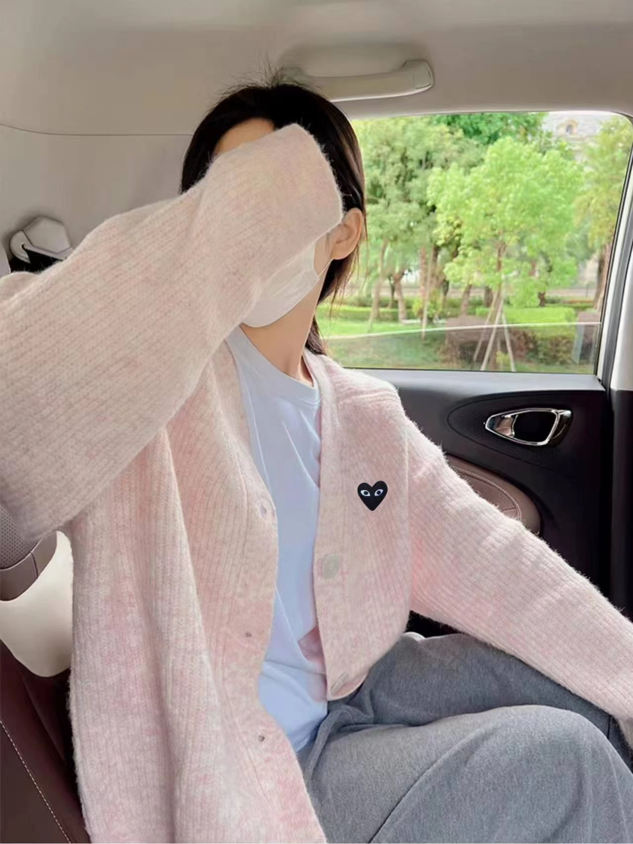 温柔粉V领竖坑条针织开衫柔和的浅粉色调,自带软糯氛围感,温柔显白,是很适合春夏的治愈系颜色。宽松落肩版型,衣长偏中长款,对身材包容度高,营造慵懒随性的松弛感,不挑身形。V领设计,修饰颈部线条,能拉长比例,同时方便叠穿内搭打造层次感。竖坑条针织纹理,肌理感清晰,面料带有毛绒感,软糯亲肤,保暖性与垂坠感兼具,触感柔软舒适。单排同色系纽扣,低调简约,保持整体色调的和谐统一,开合方便左胸位置标志性黑色爱心刺绣,爱心内带眼睛图案,在温柔粉色中增添了细节与辨识度。长袖设计,袖口宽松,可翻折露出内搭袖口,增加穿搭细节感。日系温柔风、休闲通勤风、慵懒松弛风,适配日常出街、居家、轻职场等多种场景。