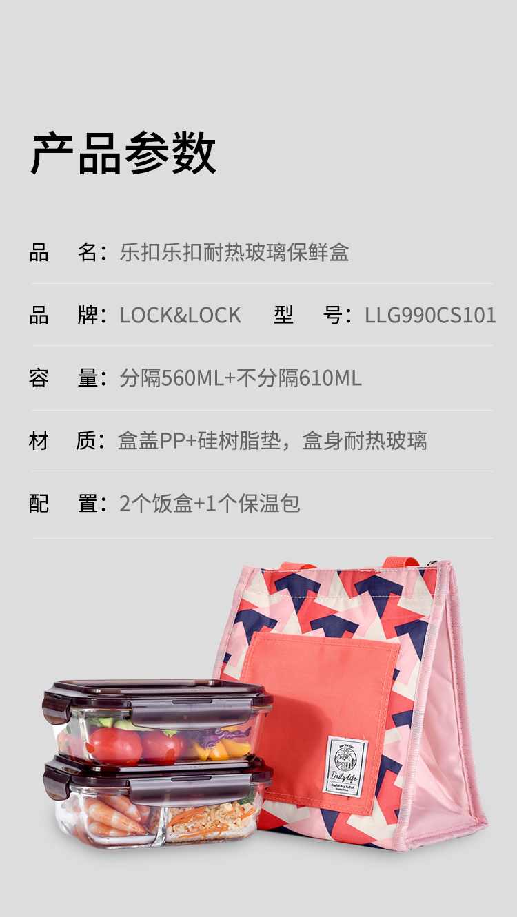 乐扣乐扣保鲜盒微波炉饭盒 高硼耐热玻璃分隔便当盒两件套送便当包