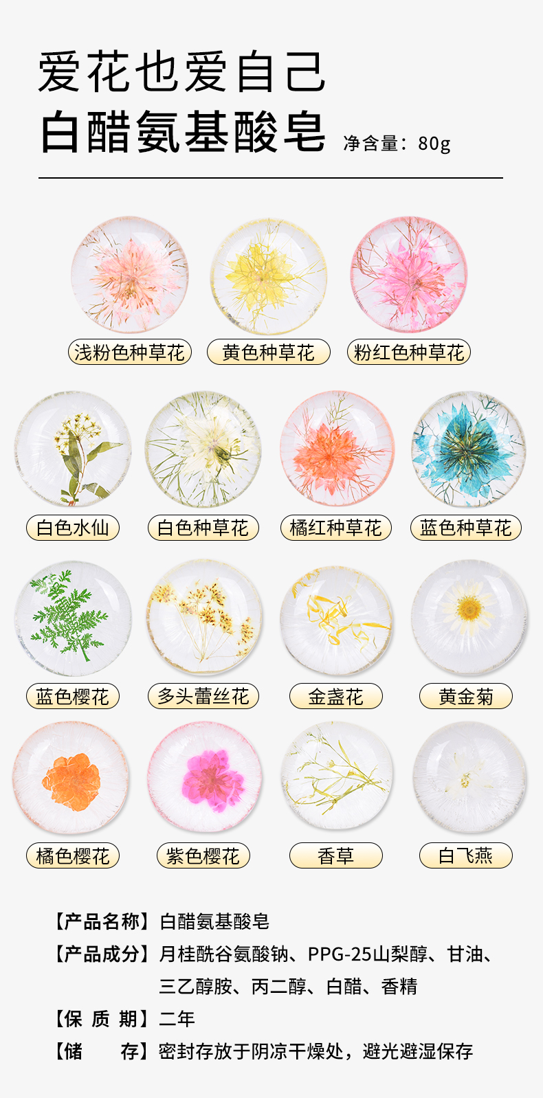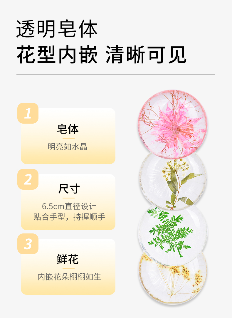因皂中是真花,所以每个批次的花色会受季节温度影响,但不影响使用效果,且每一种都很美!