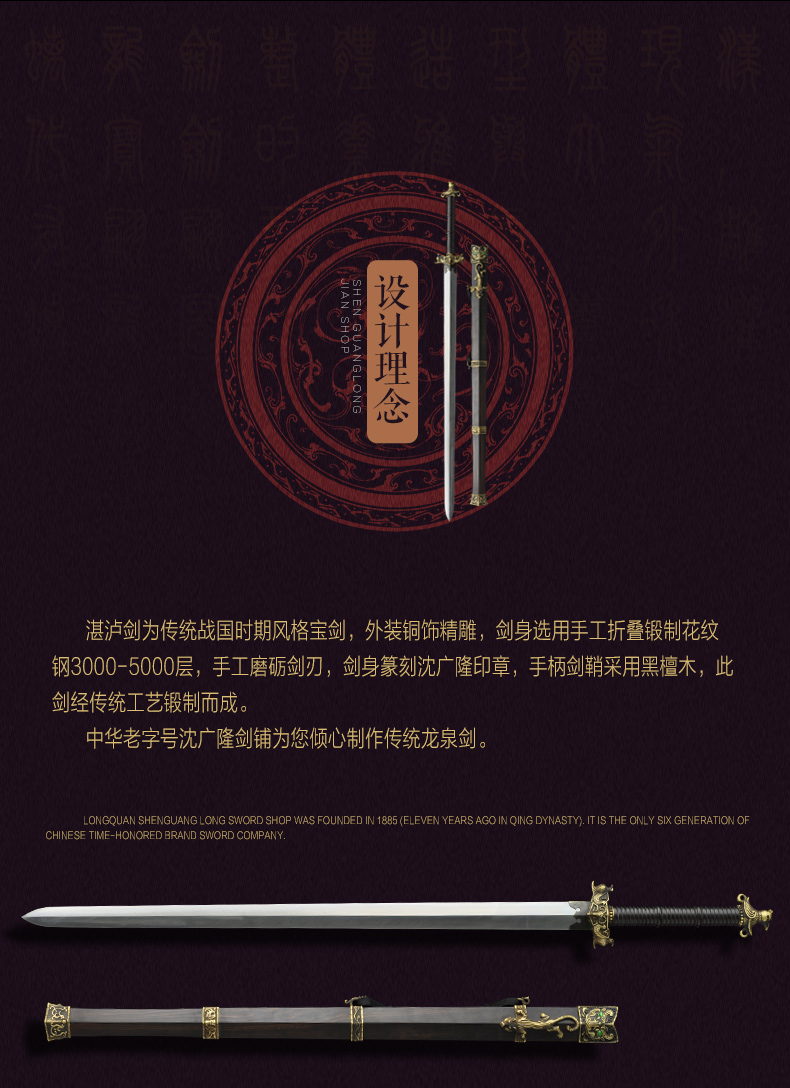 - 龙泉沈广隆剑舖创始于1885年(清光绪)位于浙江省龙泉市,是当地唯一一家“子承父业”一脉相承的中华老字号宝剑生产企业,是国家级非物质文化遗产龙泉宝剑项目保护单位,并以“天下第一剑”闻名于海内外....
