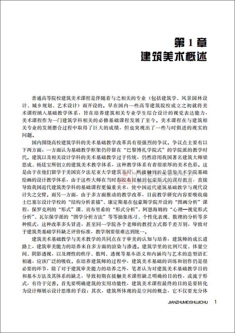 《建筑美术基础》属于全国高等院校建筑学科类的专业基础课程。目前国内开设建筑美术课程的专业主要包括理工类的建筑学,农林类的风景园林设计、城乡规划以及各级美术类院校的艺术设计,虽然课程名称、专业性质、教学目标各有不同,但整体来说都属于同一个造型基础课的范畴。