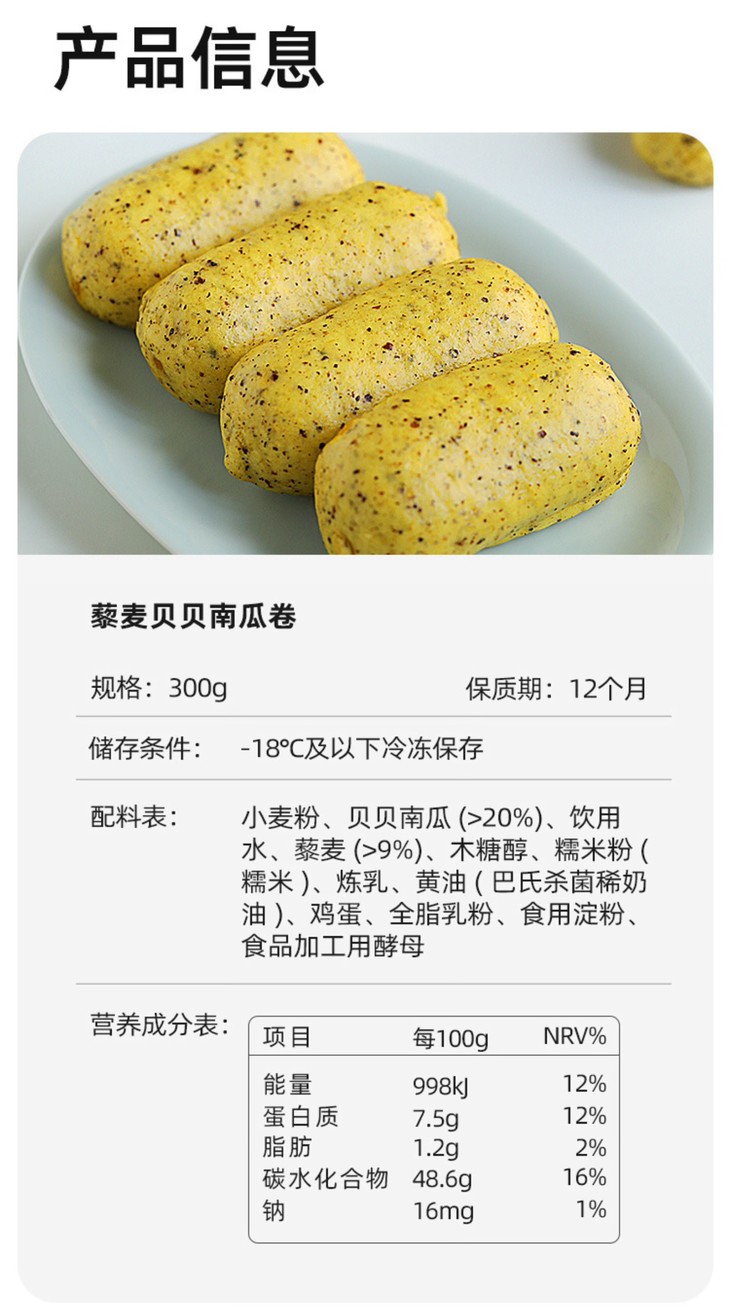 [屁侠推荐] 下厨房 藜麦贝贝南瓜卷 300g/袋 (6枚装)无蔗糖配方 奶香裹着贝贝南瓜甜