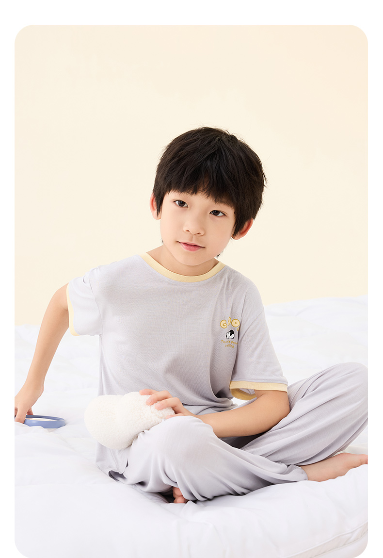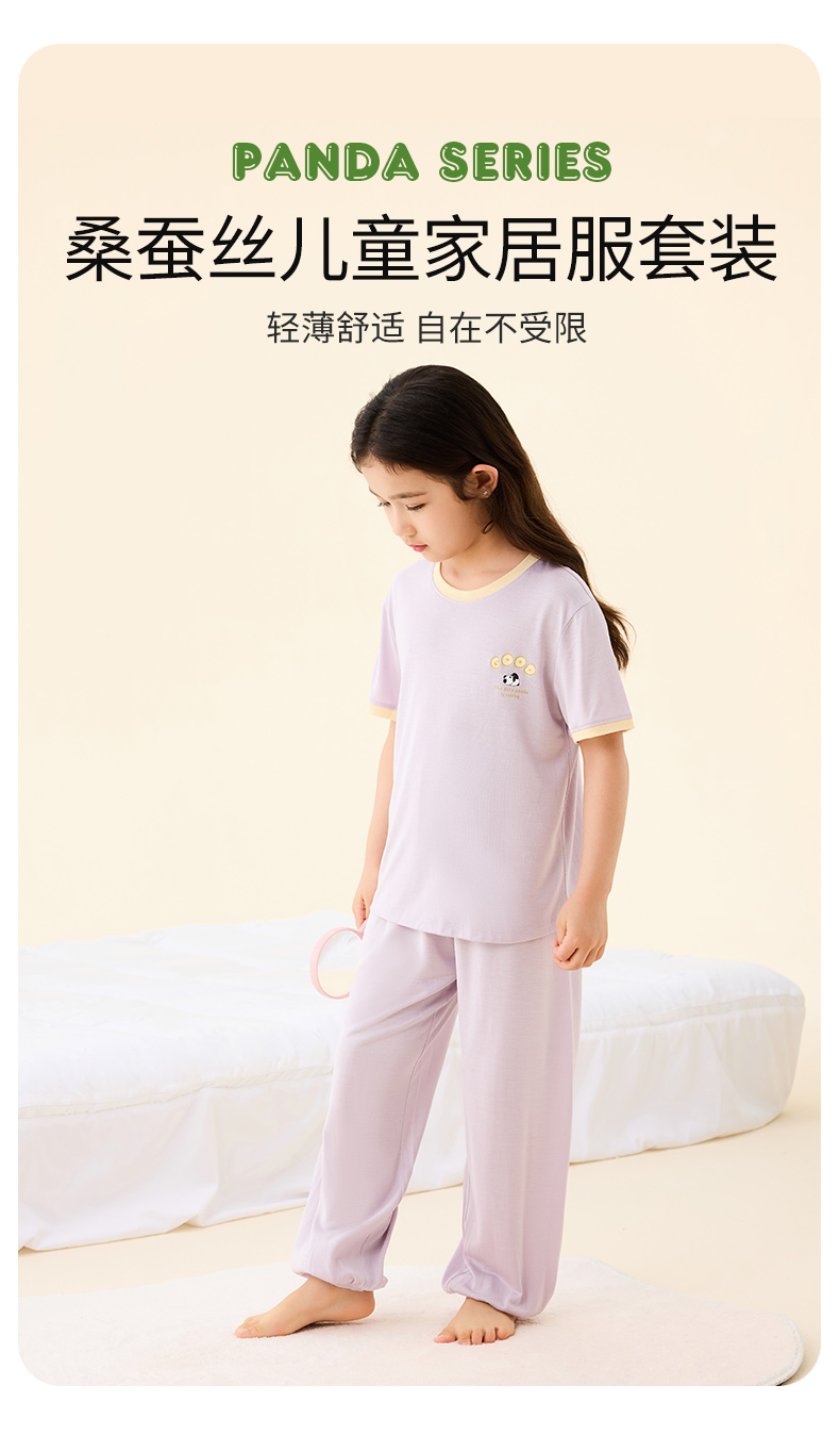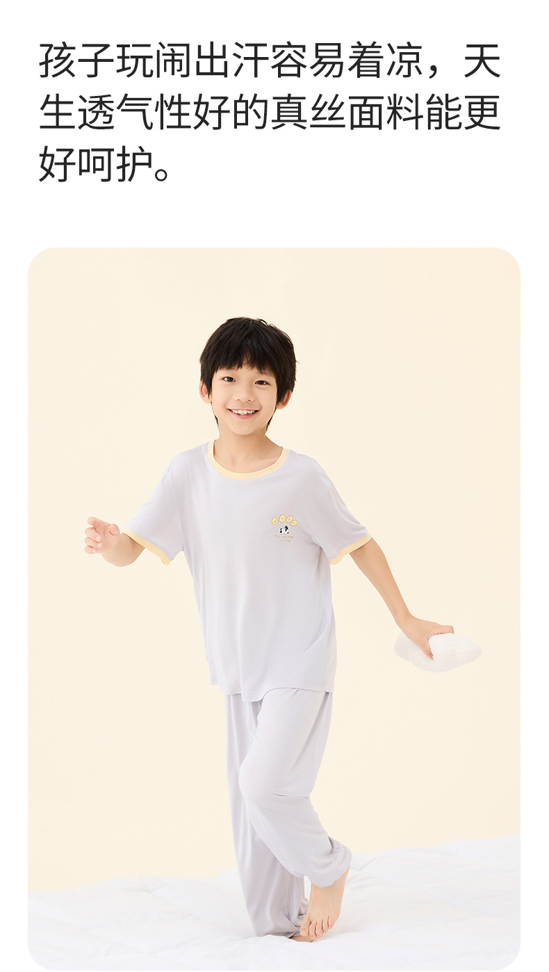 【熊猫滚滚】金三塔真丝针织儿童T恤100%桑蚕丝趣味印花圆领家居服衣裤套 BBY028/BBY029