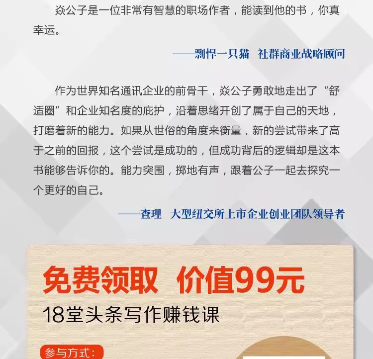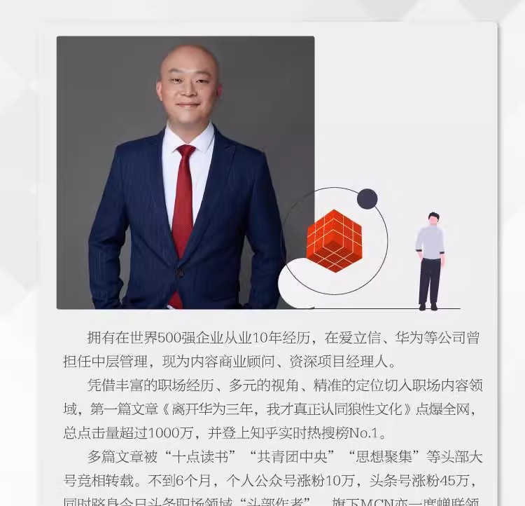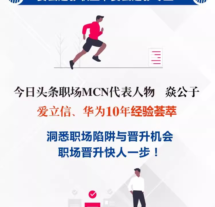 今日头条职场MCN代表人物焱公子,荟萃世界500强企业10年从业经验,总结爱立信、华为等公司的职场心得,洞悉职场陷阱与晋升机会,让你实现能力突围的*终目的,成为职场上的不可替代!