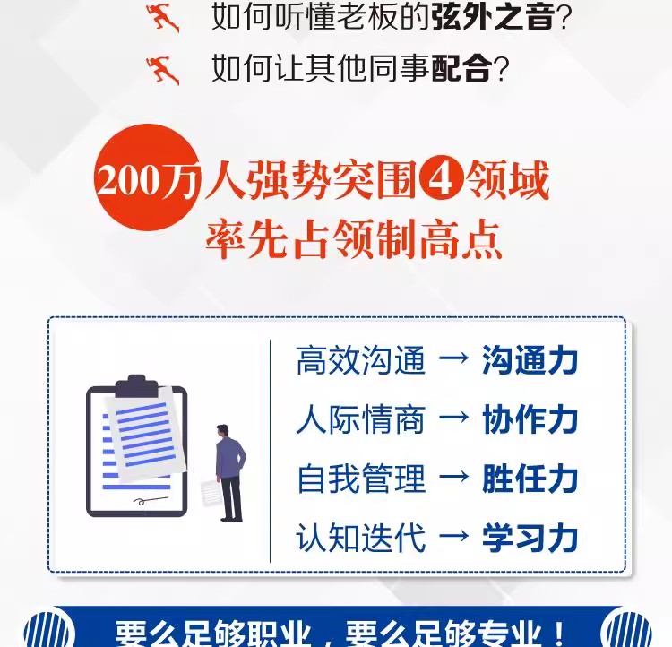 《能力突围》以 “高效沟通”“人际情商”“自我管理”“认知迭代”四大突围领域为切入点,已成功引领200万人率先占领制高点,迅速提升个人持续精进的沟通力、协作力、胜任力、学习力,让你要么足够职业,要么足够专业!