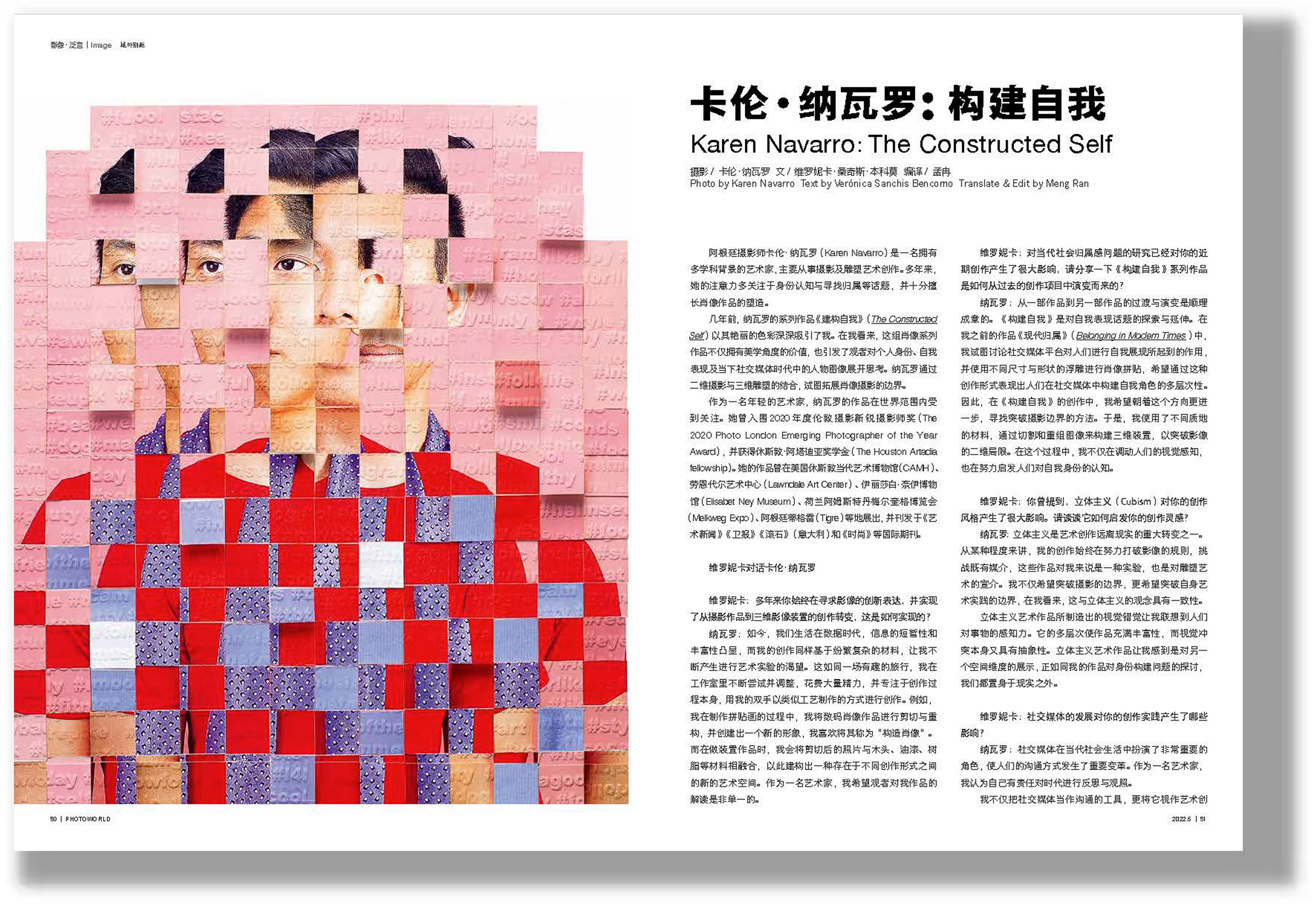 身份认同理论说,人们可以通过比较与他人的异同来构建对自我的身份认同。一个人的身份标签是不断变化的微妙概念,取决于个人的性格、行为和外界对他的看法。阿根廷摄影师卡伦·纳瓦罗(Karen Navarro)便在进行这样的尝试。作为一名主要从事摄影及雕塑艺术的艺术家,她通过二维摄影与三维雕塑的结合,创作出系列肖像作品《构建自我》,以期引发观者对个人身份、自我表现以及当下社交媒体时代中人物图像的思考。