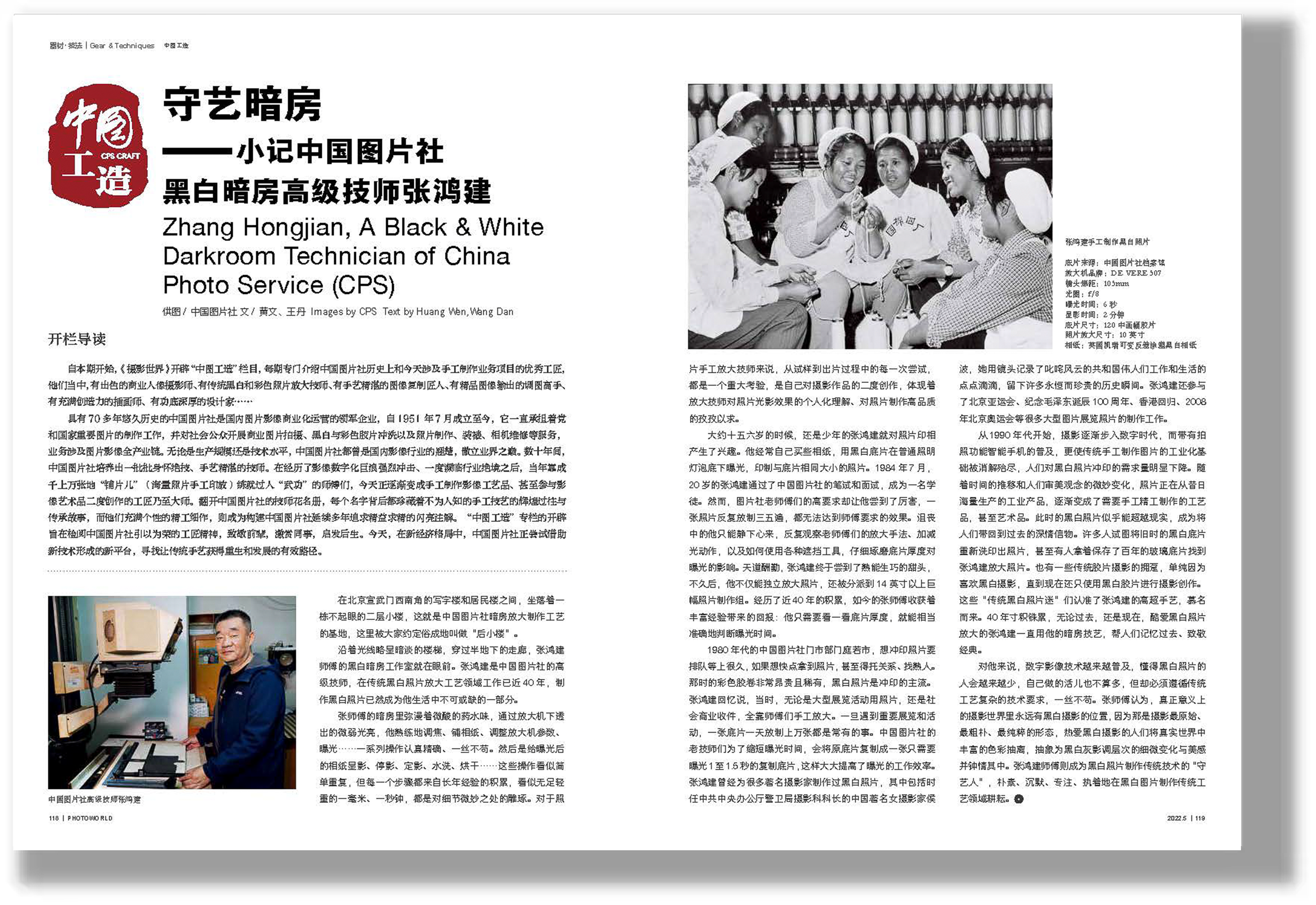 自本期开始,《摄影世界》开辟“中图工造”栏目,每期专门介绍中国图片社历史上和今天涉及手工制作业务项目的优秀工匠,他们当中,有出色的商业人像摄影师、有传统黑白和彩色照片放大技师、有手艺精湛的图像复制匠人、有精品图像输出的调图高手、有充满创造力的插画师、有功底深厚的设计家……