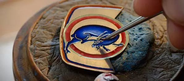 主要采用画珐琅工艺,是用金、银、钛、铜等金属制成胎骨,将珐琅彩颜 料微绘于金属胎上的凹坑花纹处,然后至入高温窑炉中经800度高温炉火多次烧结而成。