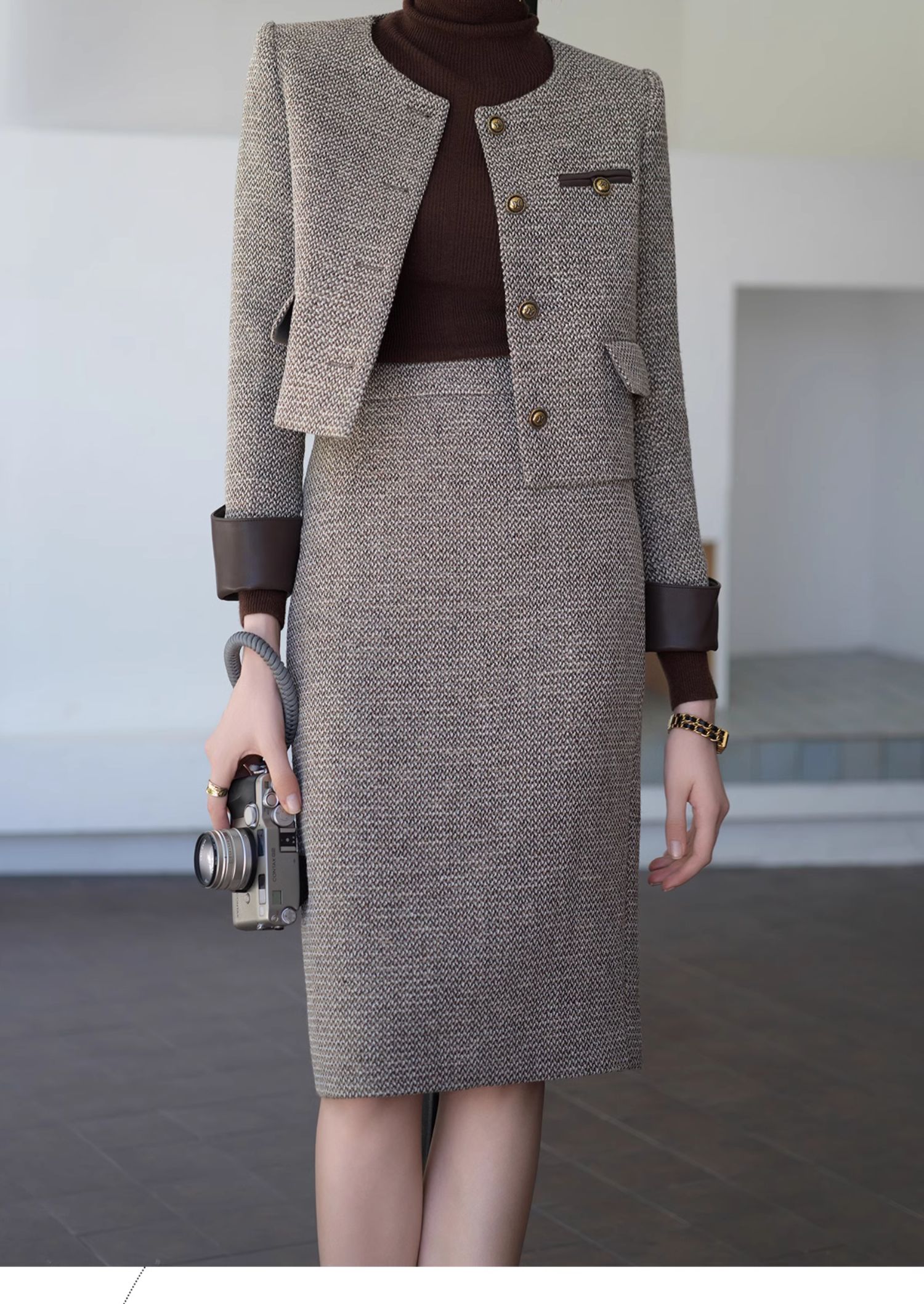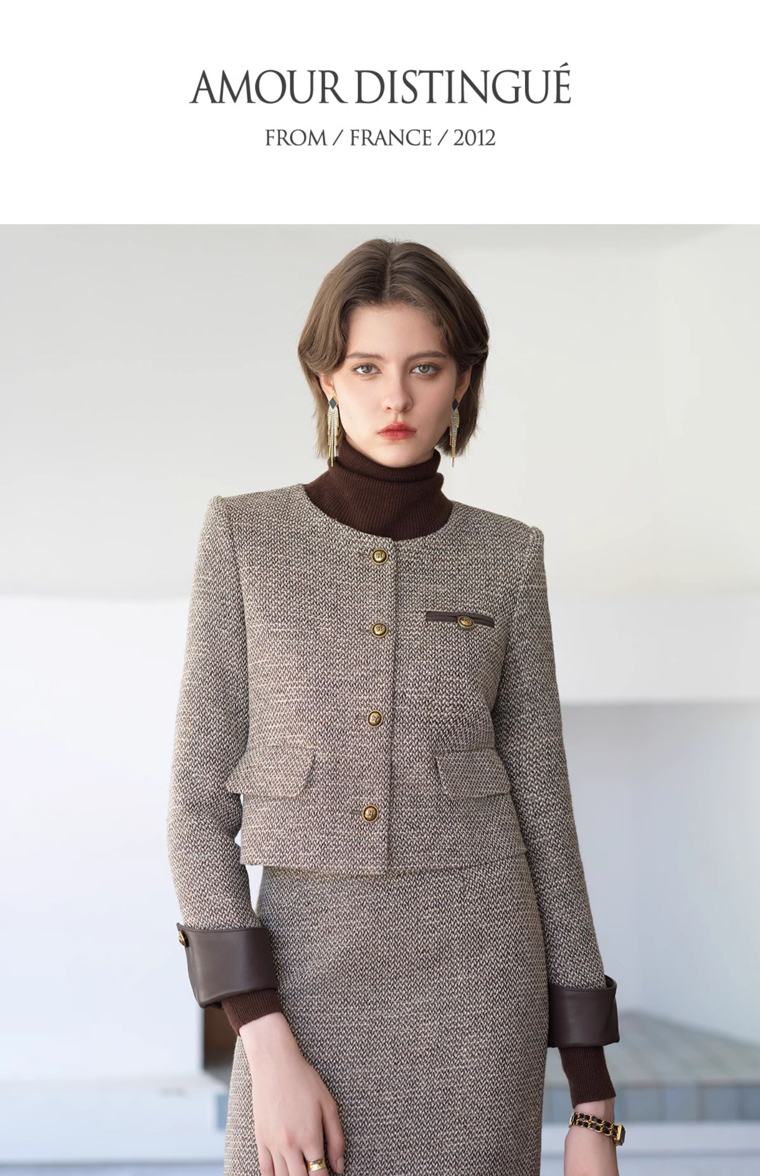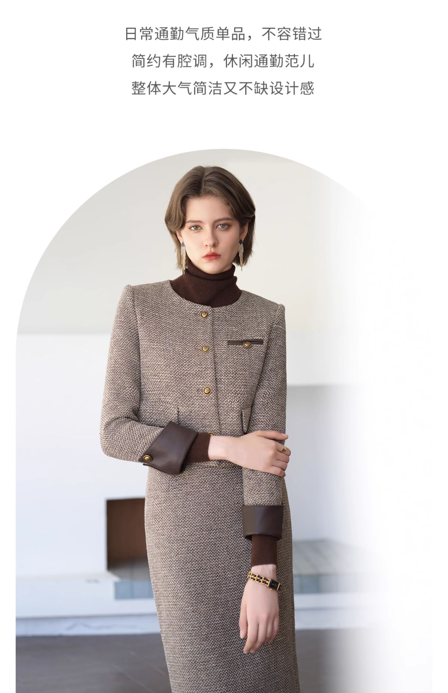 AD初秋韩系穿搭套装2024新款粗花呢接拼皮质短外套女小香风两件套
