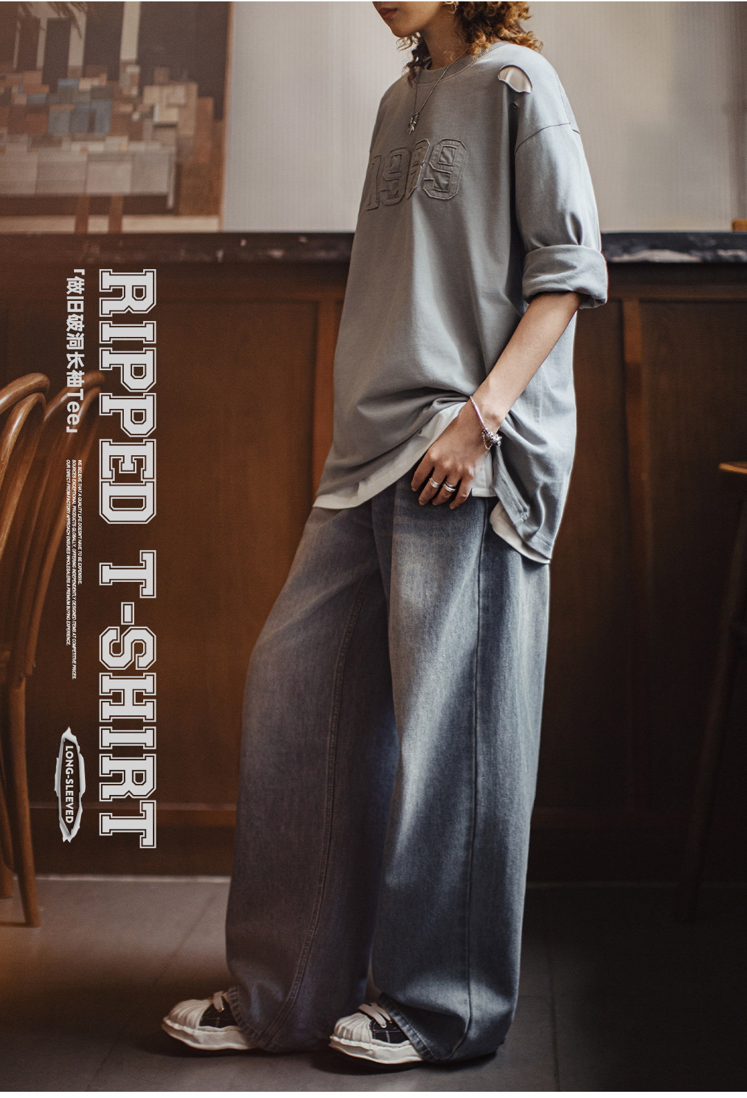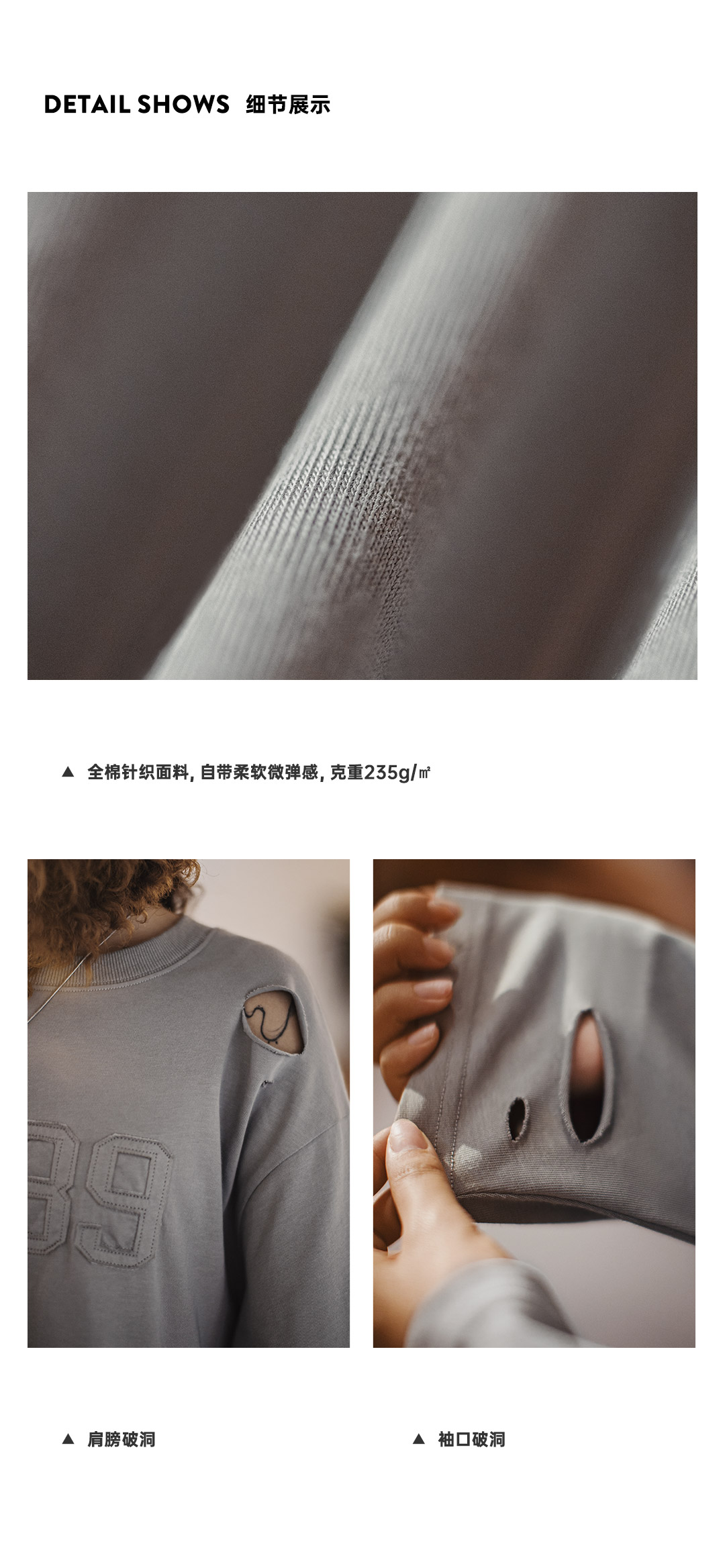 马登美式灰色纯棉薄款水洗做旧套头宽松落肩长袖T恤上卫衣女士秋