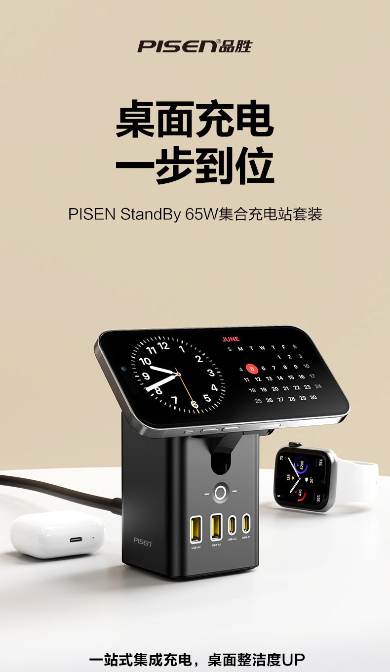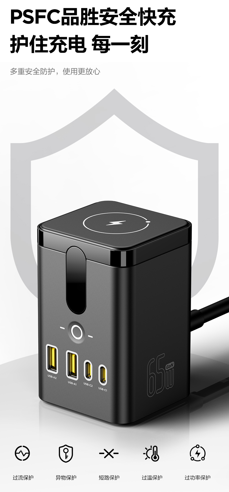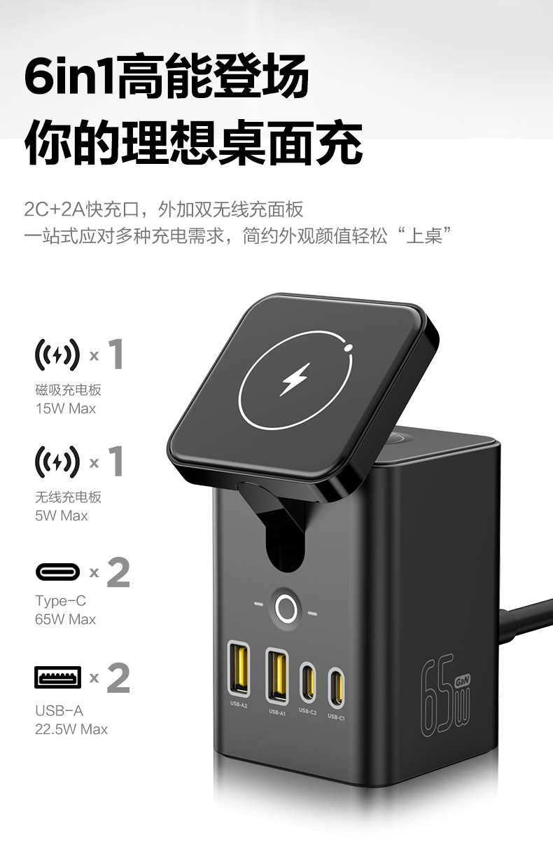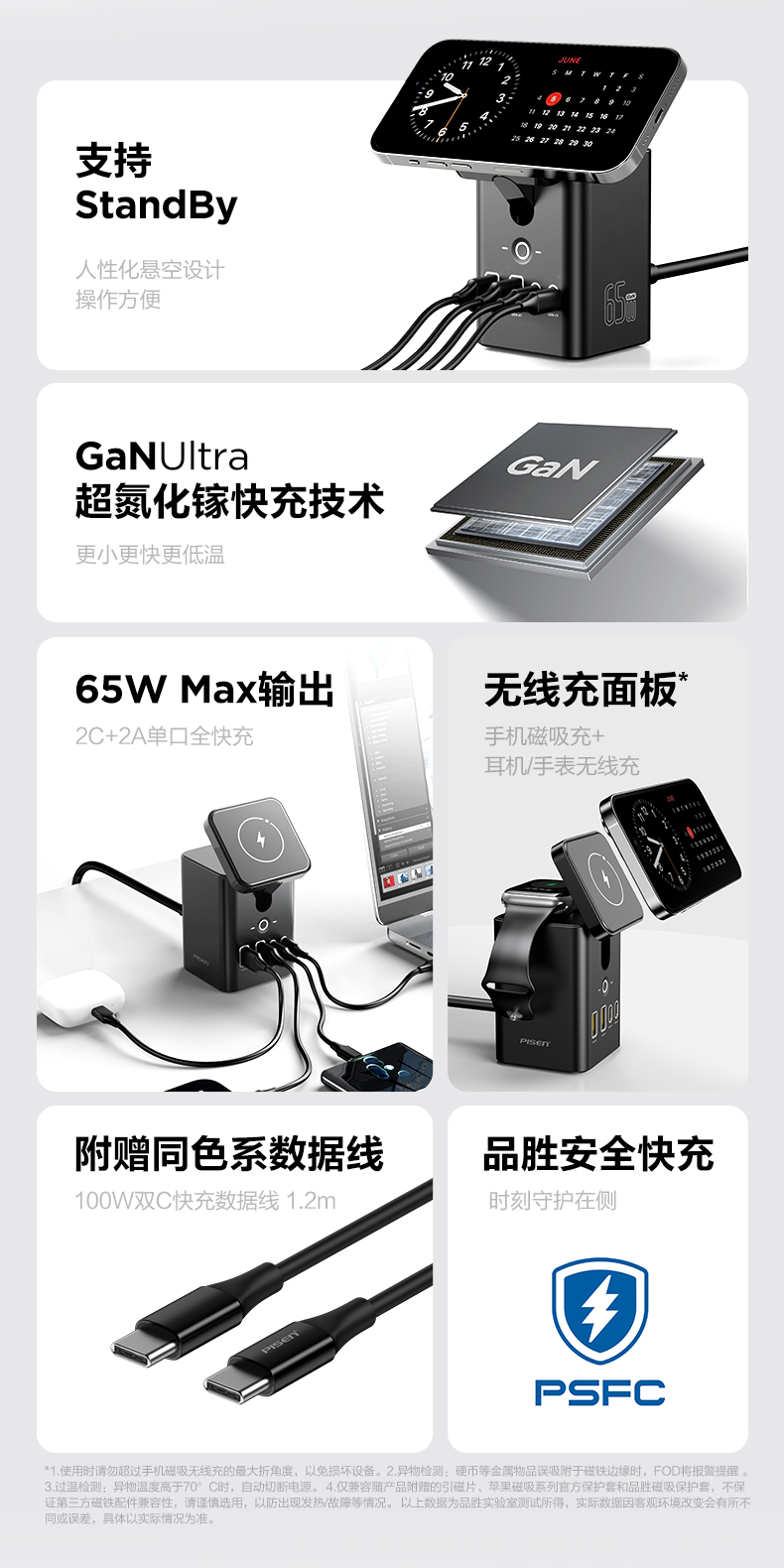 品胜65W集合充电站套装 氮化镓充电器 黑武士磁吸无线充插座套装支持手表/耳机充电 65W笔记本快充 华为超级快充