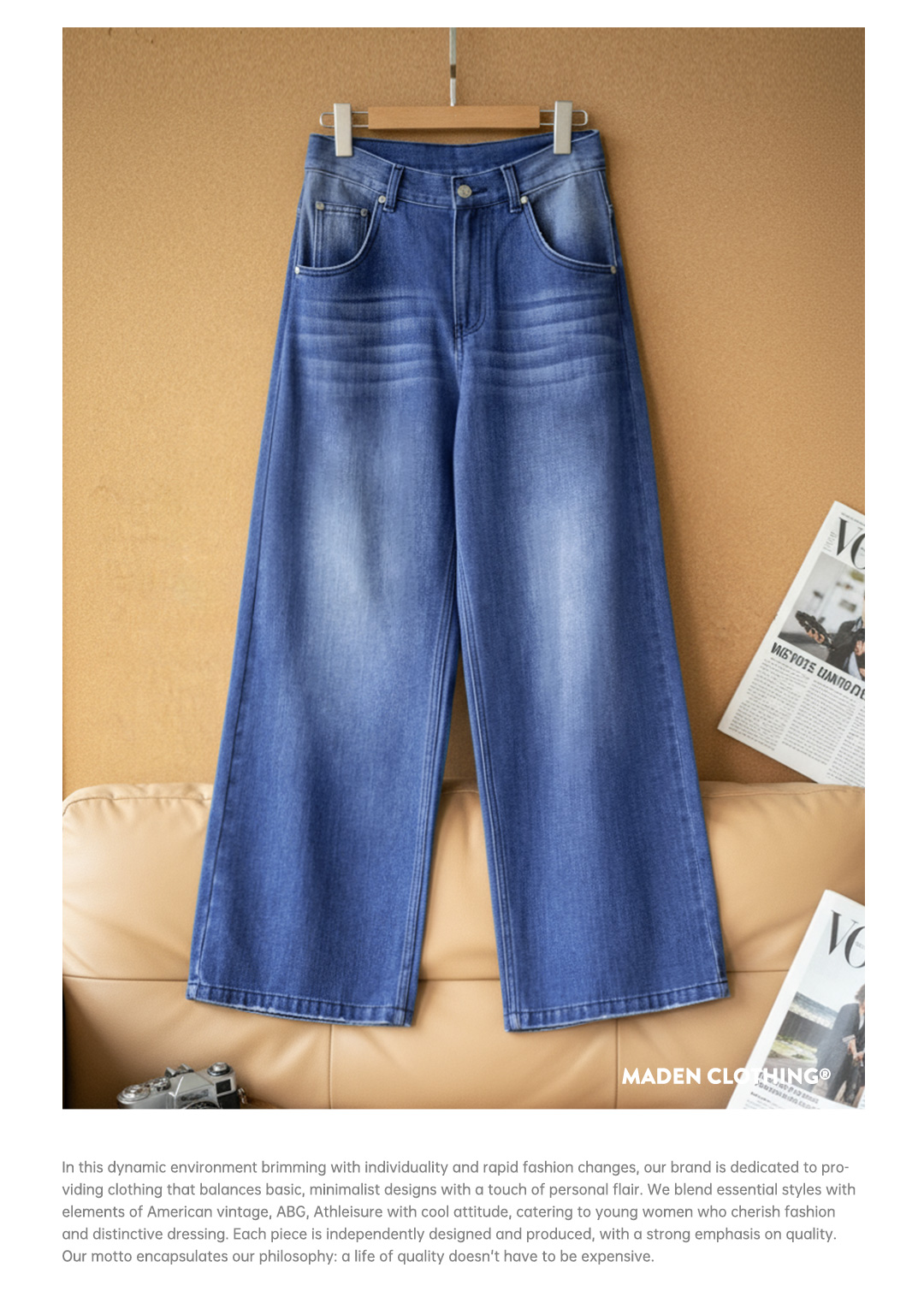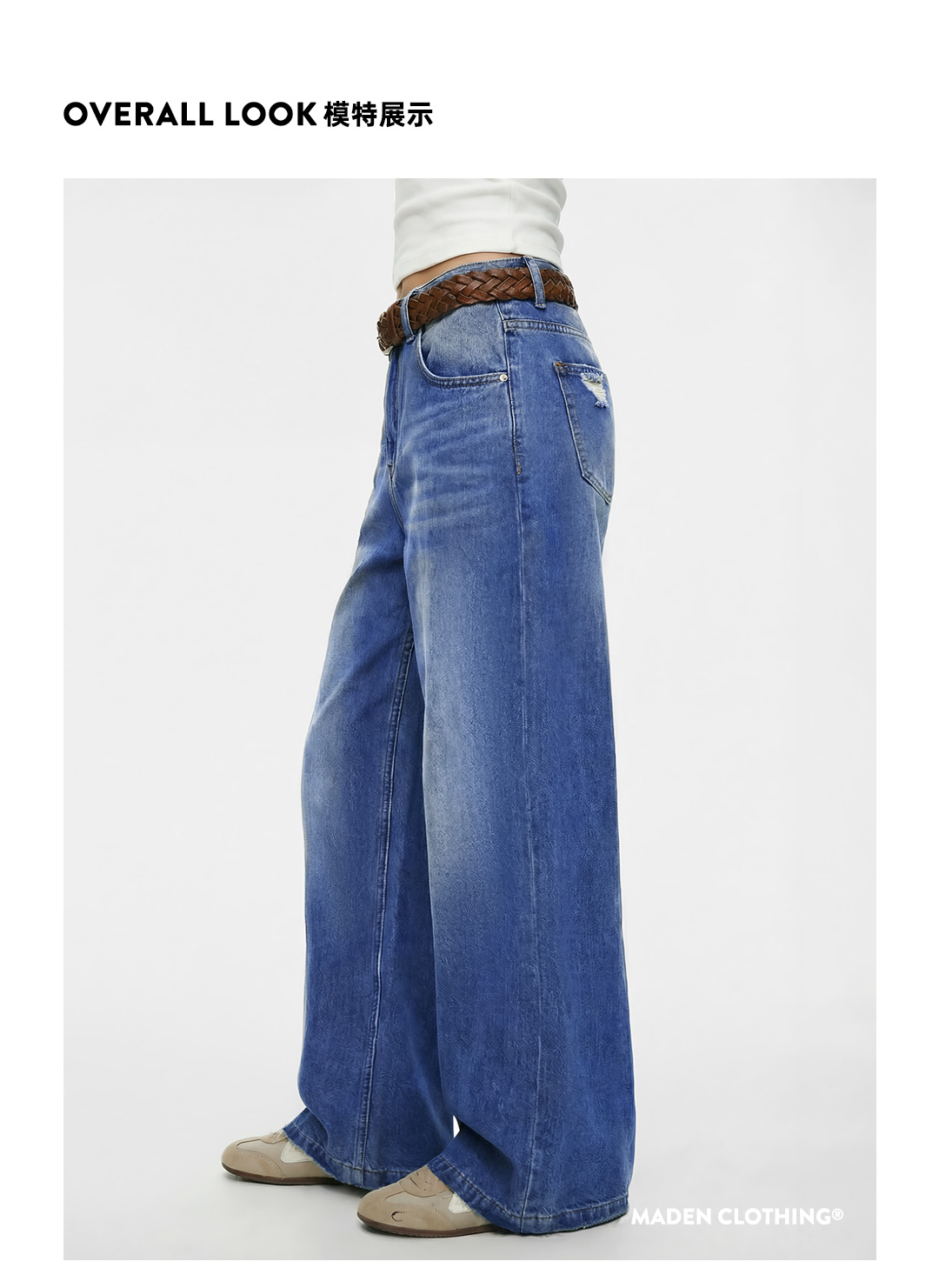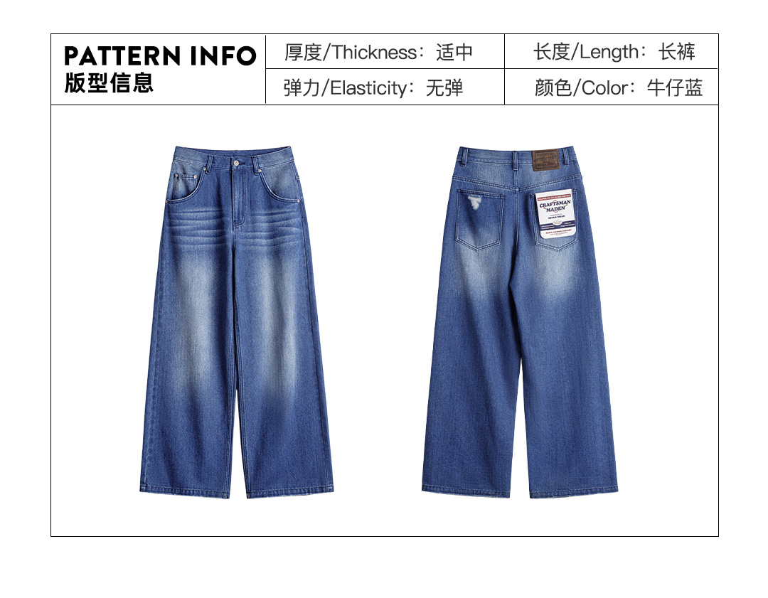 马登丹宁深蓝色复古直筒阔腿水洗牛仔裤全纯棉拖地长裤子女士春季