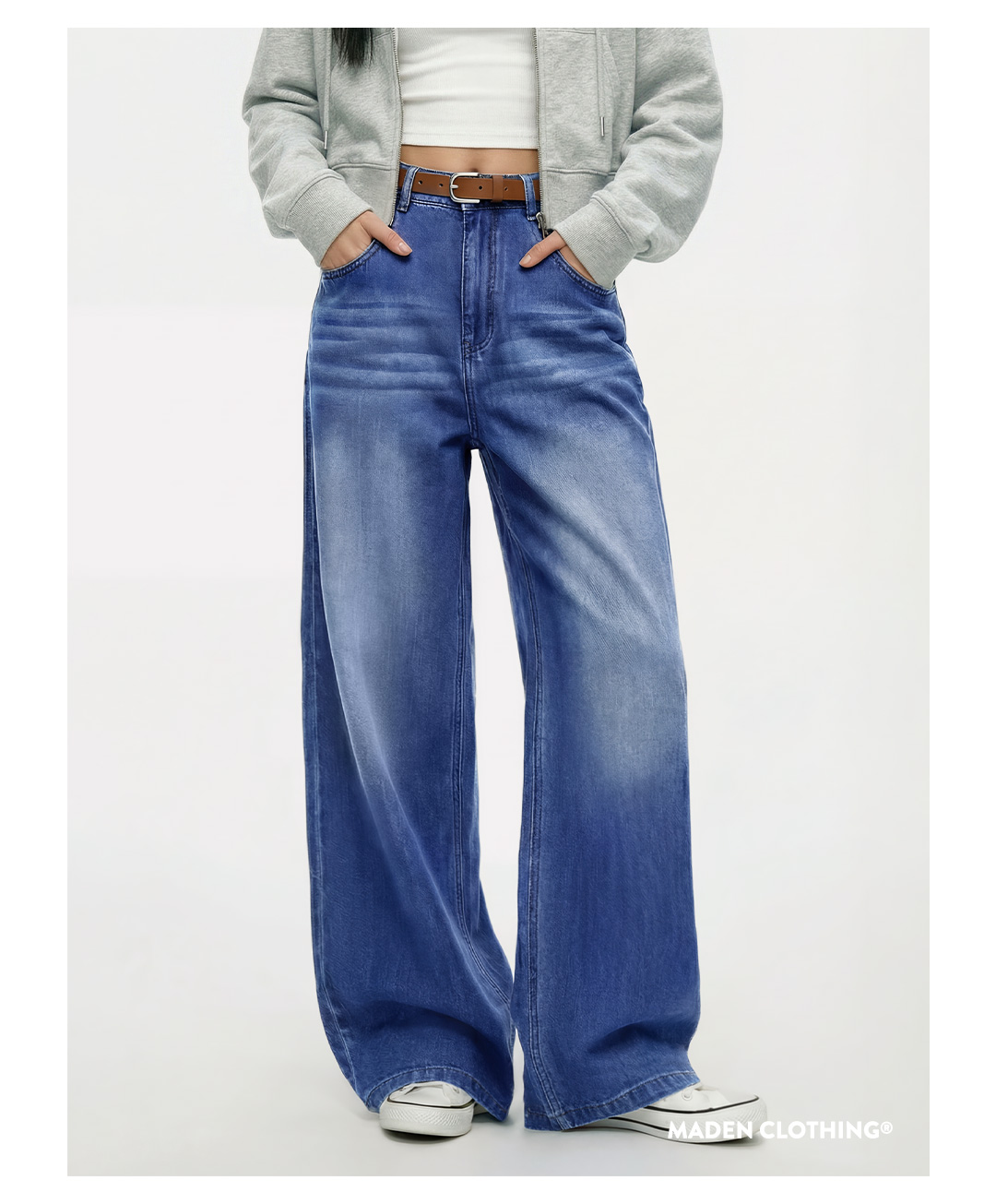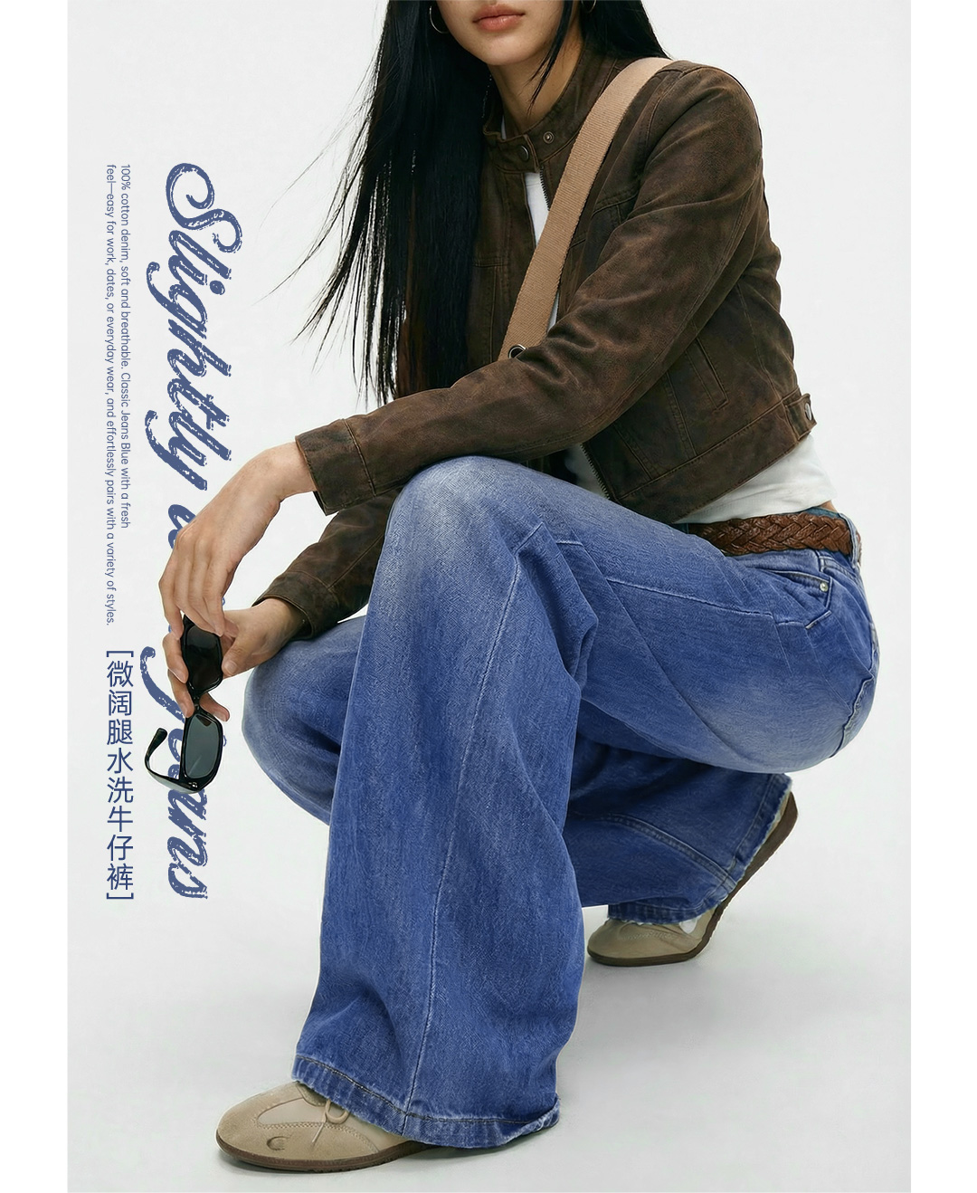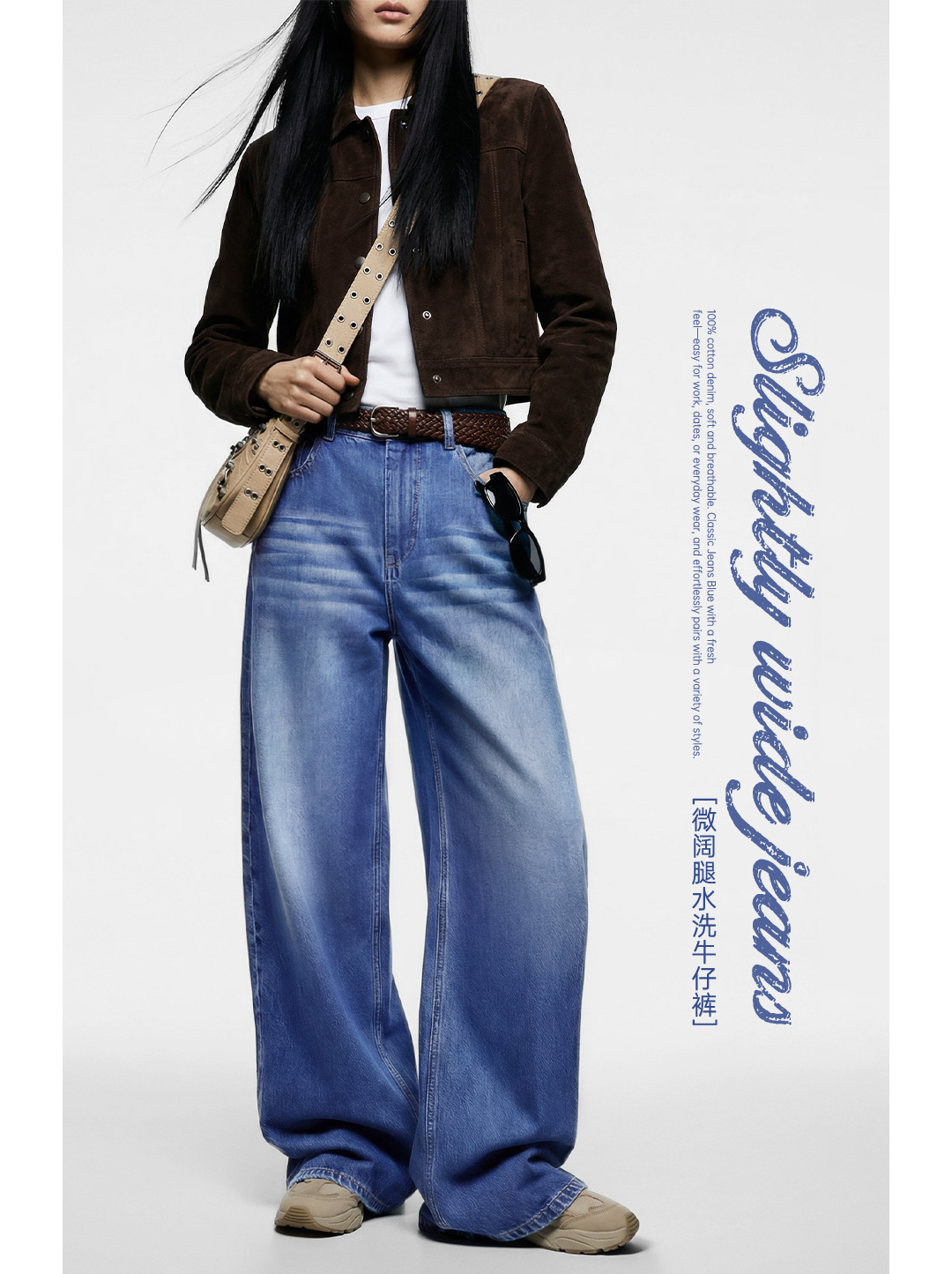马登丹宁深蓝色复古直筒阔腿水洗牛仔裤全纯棉拖地长裤子女士春季