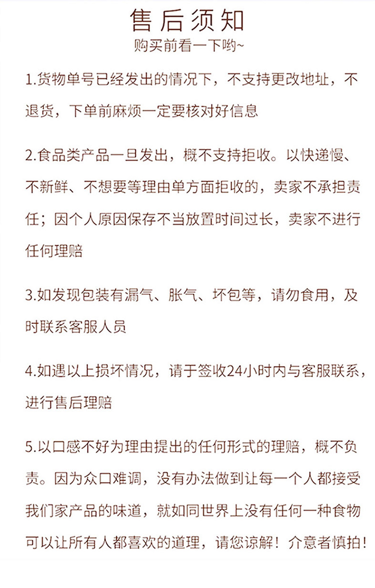 1.下单前请确认好发货信息,下单后不支持改地址/退换货/拒收。