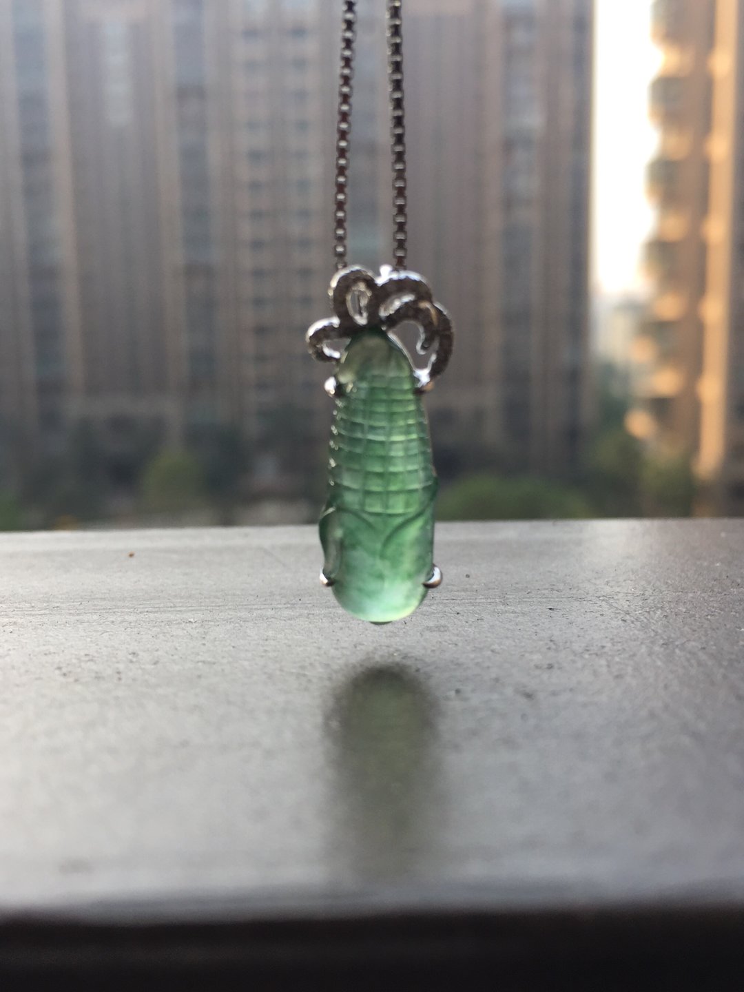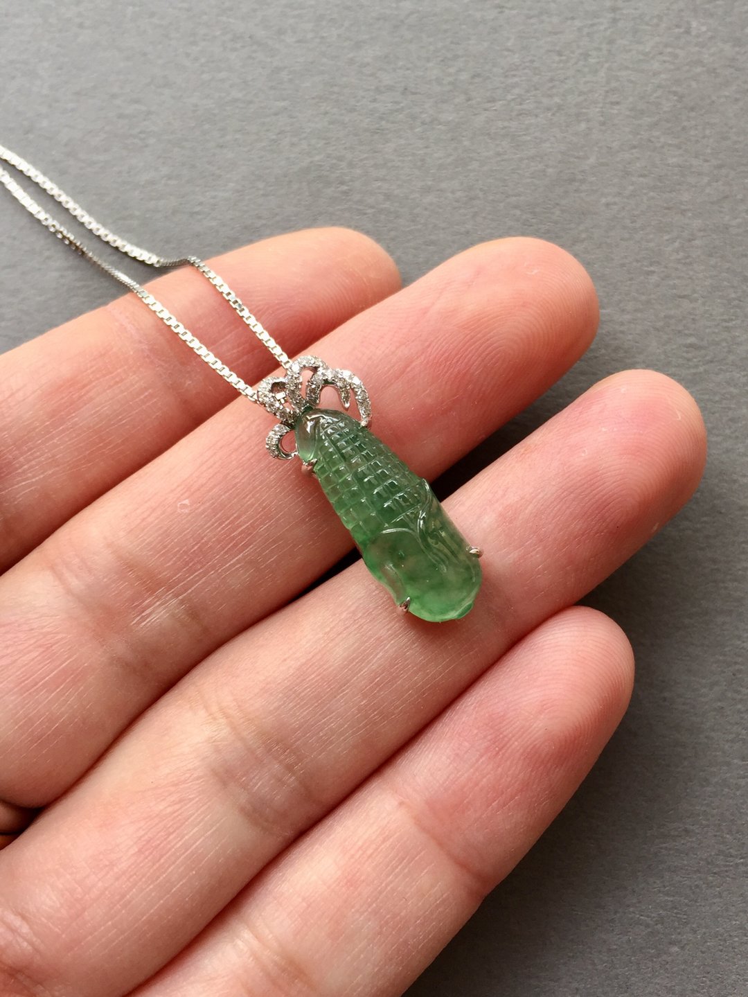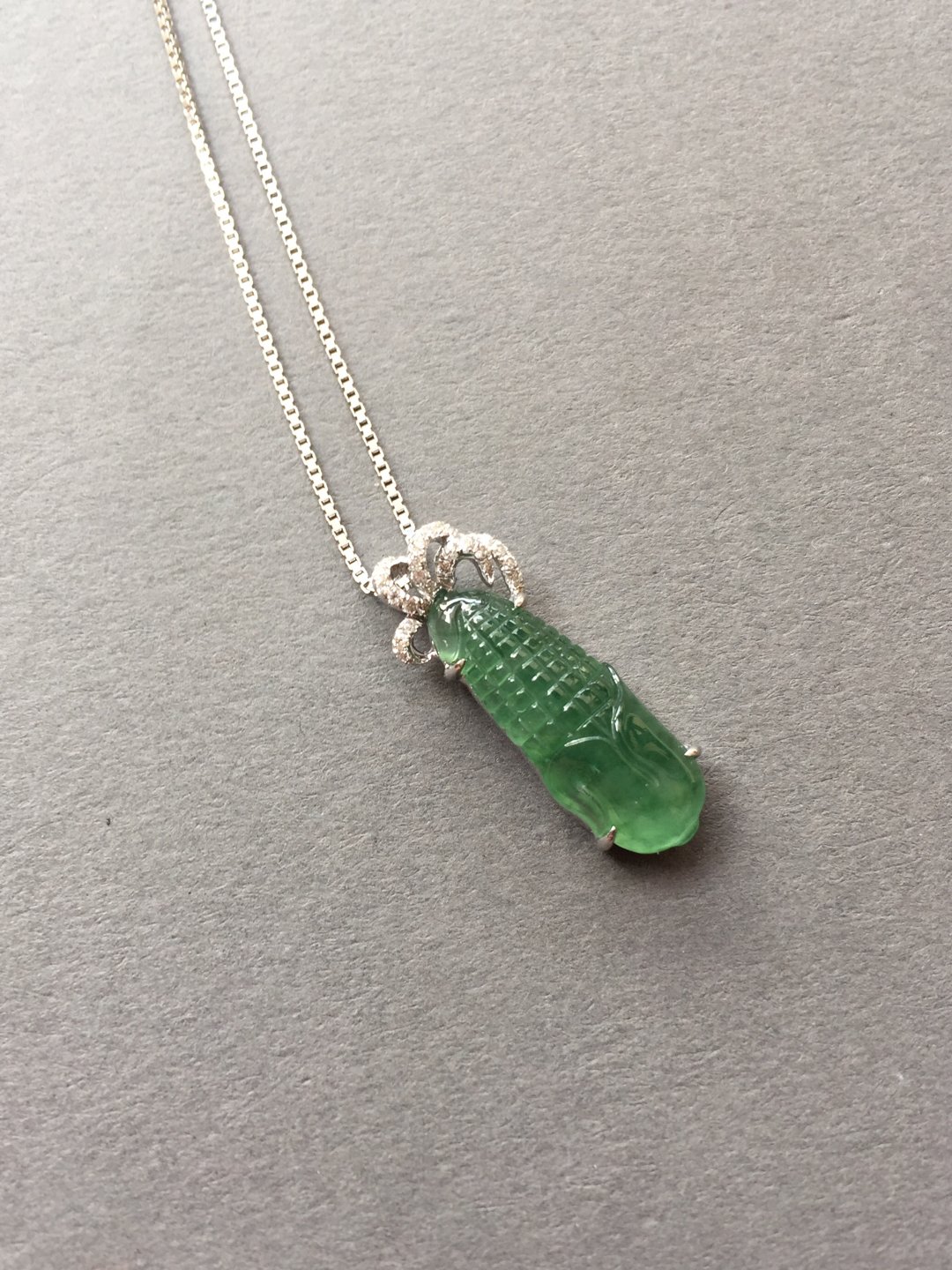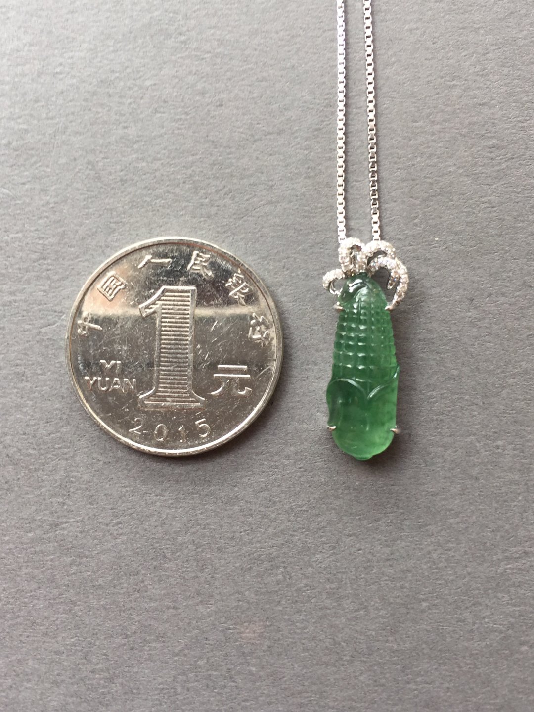 设计师款,高冰种晴水玉米,五谷丰登,岁岁平安。20.3×8.1×4mm,镶嵌后24.4×9.5×5.7mm,种水晶莹剔透,荧光四射,晴水绿特别漂亮,自然系设计风格,18k白金钻石镶嵌玉米须,代表岁岁(穗穗)平安,玉米粒粒饱满,象征丰收,硕果累累。如此别致且时尚靓丽的玉米可不多见,重要的是只要小四价位,高性价比推荐