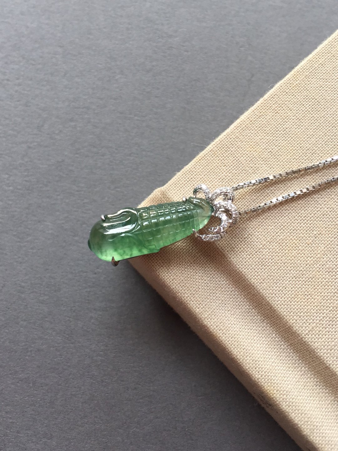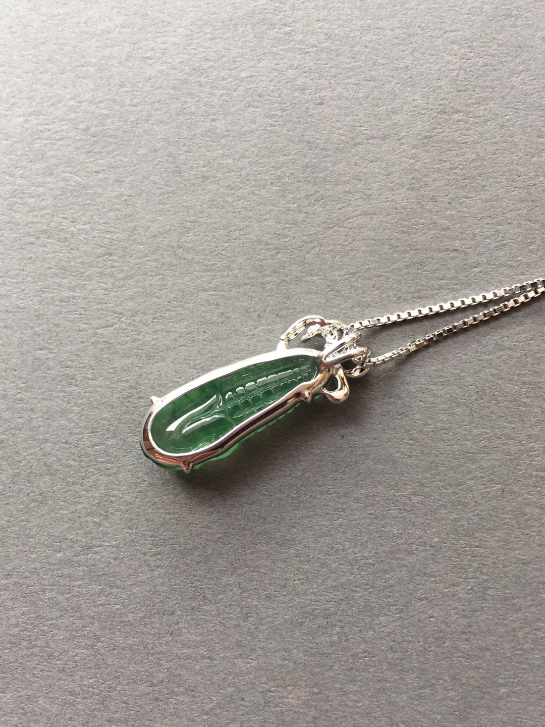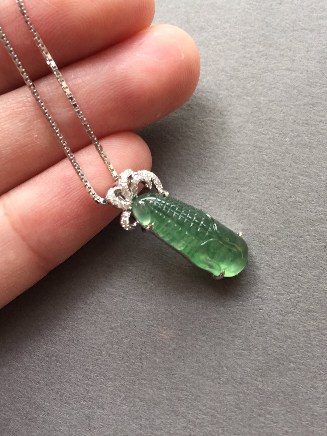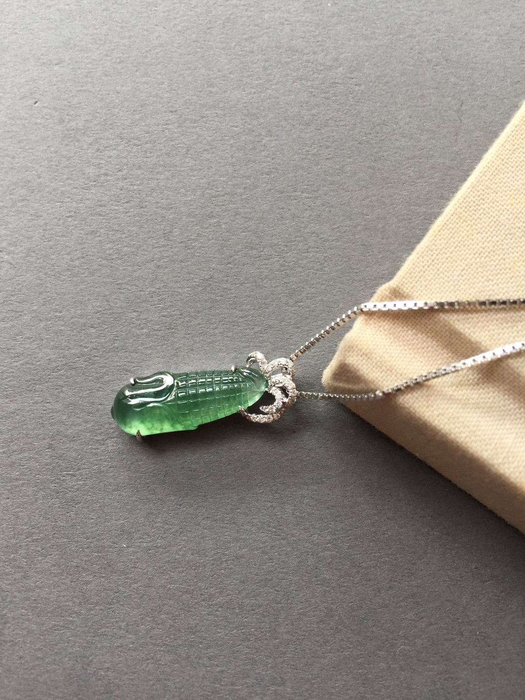 设计师款,高冰种晴水玉米,五谷丰登,岁岁平安。20.3×8.1×4mm,镶嵌后24.4×9.5×5.7mm,种水晶莹剔透,荧光四射,晴水绿特别漂亮,自然系设计风格,18k白金钻石镶嵌玉米须,代表岁岁(穗穗)平安,玉米粒粒饱满,象征丰收,硕果累累。如此别致且时尚靓丽的玉米可不多见,重要的是只要小四价位,高性价比推荐